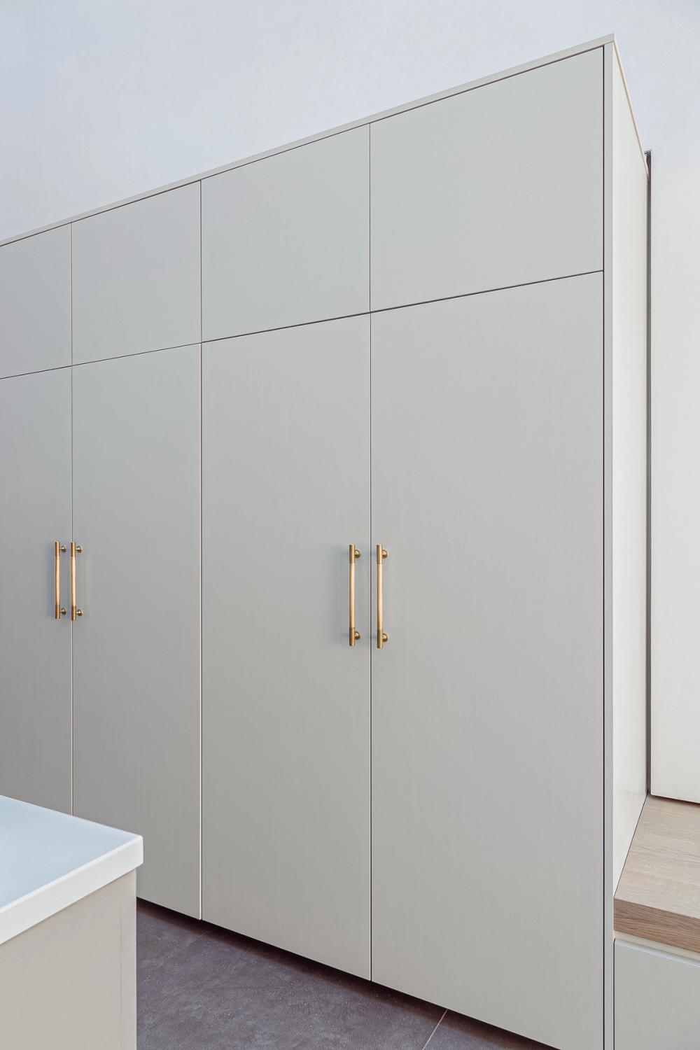 The client, a professional private chef, wanted a kitchen that was essentially for family use and for entertaining, and which made good use of the glazed, double-height ceiling and access down to the basement level, where the dining room is situated. It also needed to have a huge pantry, professional-standard appliances, and plenty of storage space so she could also fulfill her catering work. She also asked for a combination of long bar and knob handles in brass.