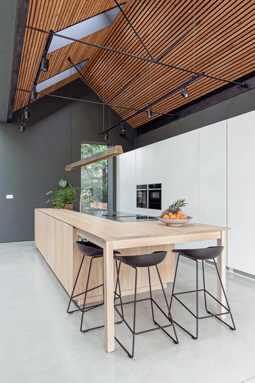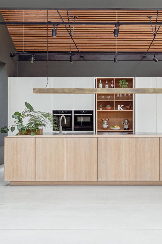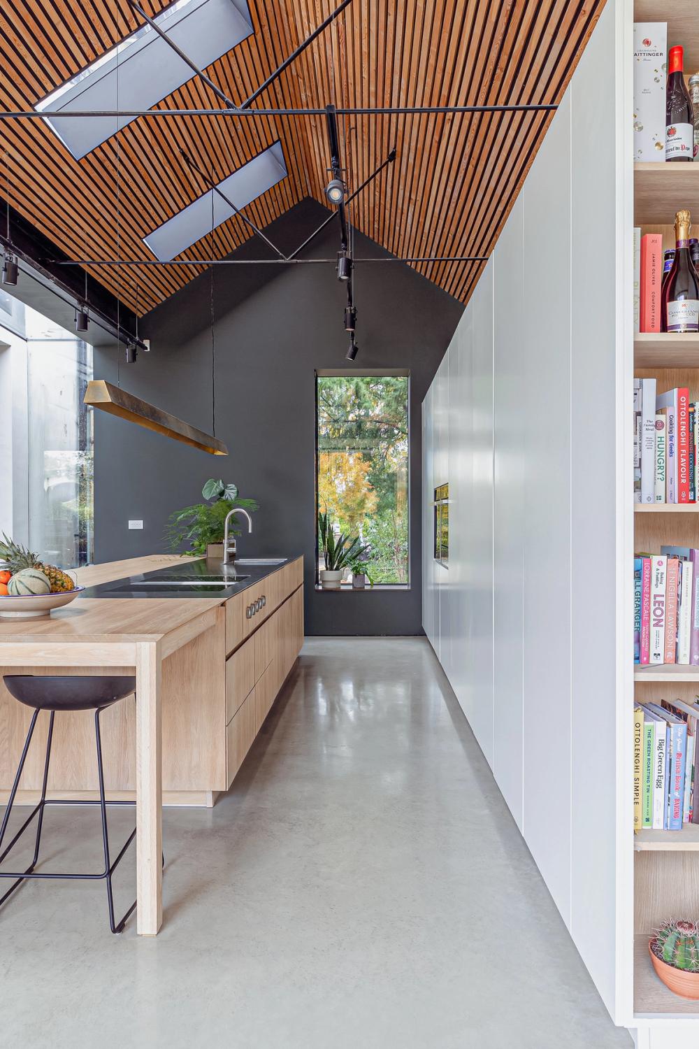 The clients envisioned their large open-plan space, which is separated from the main house by nearly ceiling-height glazed doors, to feature ultra-clean lines and a sleek look, ideal for large-scale cooking and entertaining. Inspired by a Sola Kitchens design with a large island, where the doors and drawers were mitre-cut to the worktop and at all four corners to create a wooden box effect, they requested something similar. They wanted a palette of pale woods and white to contrast with dark grey walls and dark-stained slatted timbers that line the ceiling, complemented by stainless steel detailing. Additionally, they desired a handy bookshelf for their cookery book collection.