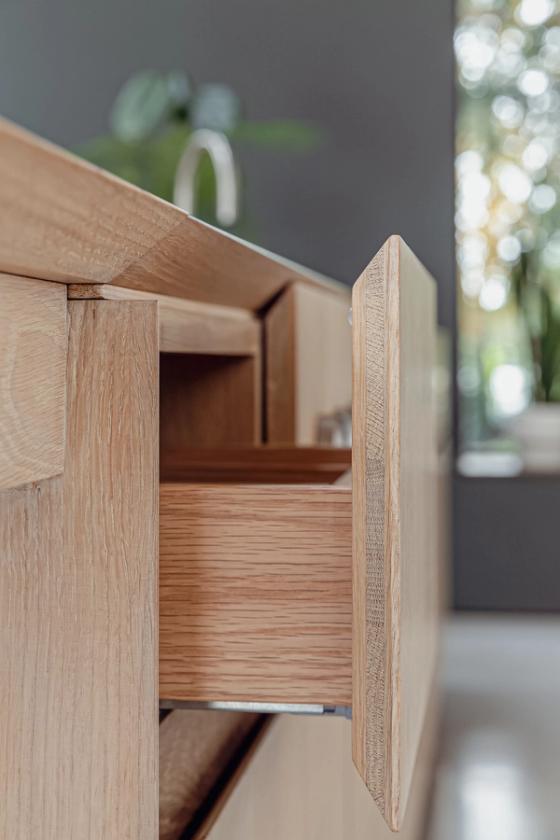 The designer's solution features white-oiled oak flat-fronted cabinetry paired with a matching solid oak worktop to create a statement wooden island. This is offset by a wall of pure-white-painted tall cabinets, achieving a sleek, linear look with tactile warmth to avoid a clinical feel. The island, designed as the kitchen's functional hub without compromising its handsome good looks, with a built-in chef’s-style table, incorporates a sheet of matt stainless steel seamlessly moulded to include a Blanco sink and cut to fit the downdraft Bora hob. Integrated into the prima finished-oak worktop, the insert remains nearly invisible from the front. The island also houses bins and a dishwasher, while the Neff ovens, fridge-freezer, and pantry are enclosed in the tall wall cabinets.