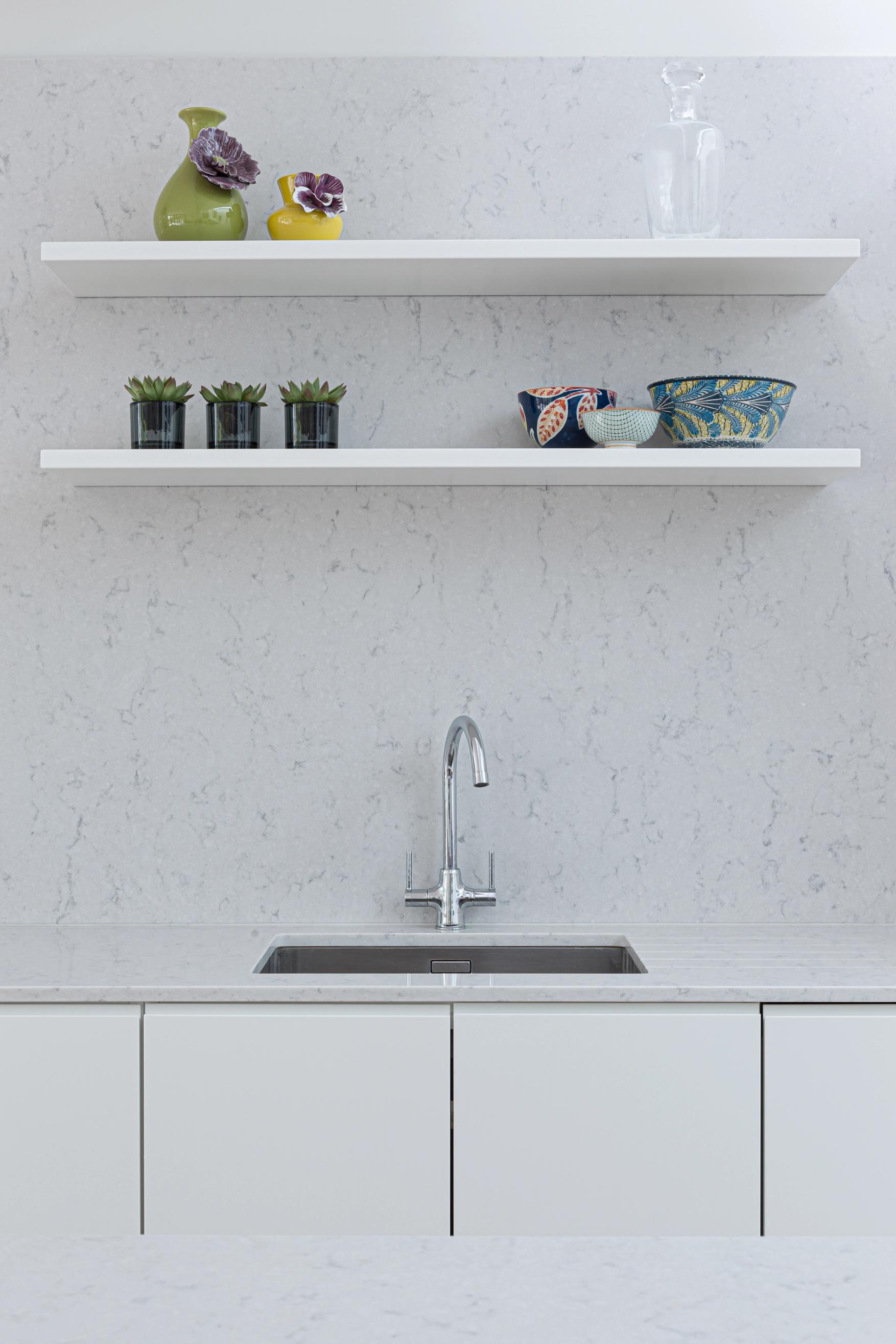Finishing touches: the large expanse of stone splashback runs all the way to the top of the tallest cabinets, providing maximum easy-to-clean wall protection and highlighting the stainless steel appliances and clean, graphic lines of the kitchen design.