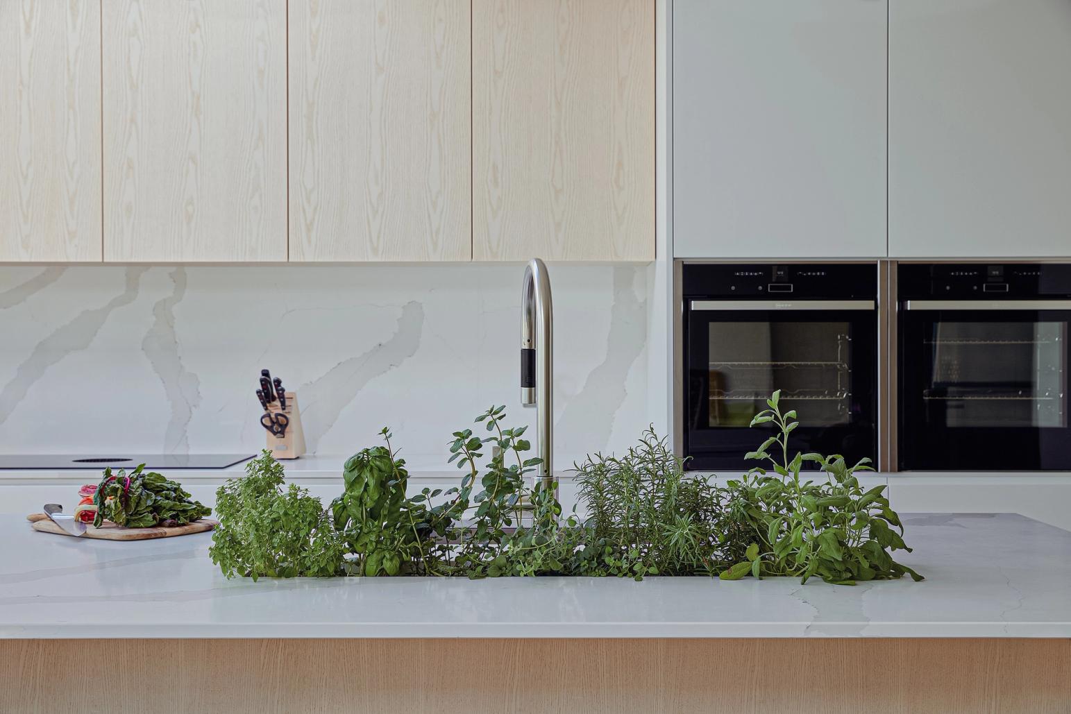 Island beauty: a moulded stainless-steel trough set into the island worktop is a perfect spot for the herb garden, an edible and ornamental way to screen the sink tap behind. Alternatively, fill it with ice and start chilling the wine for the party.