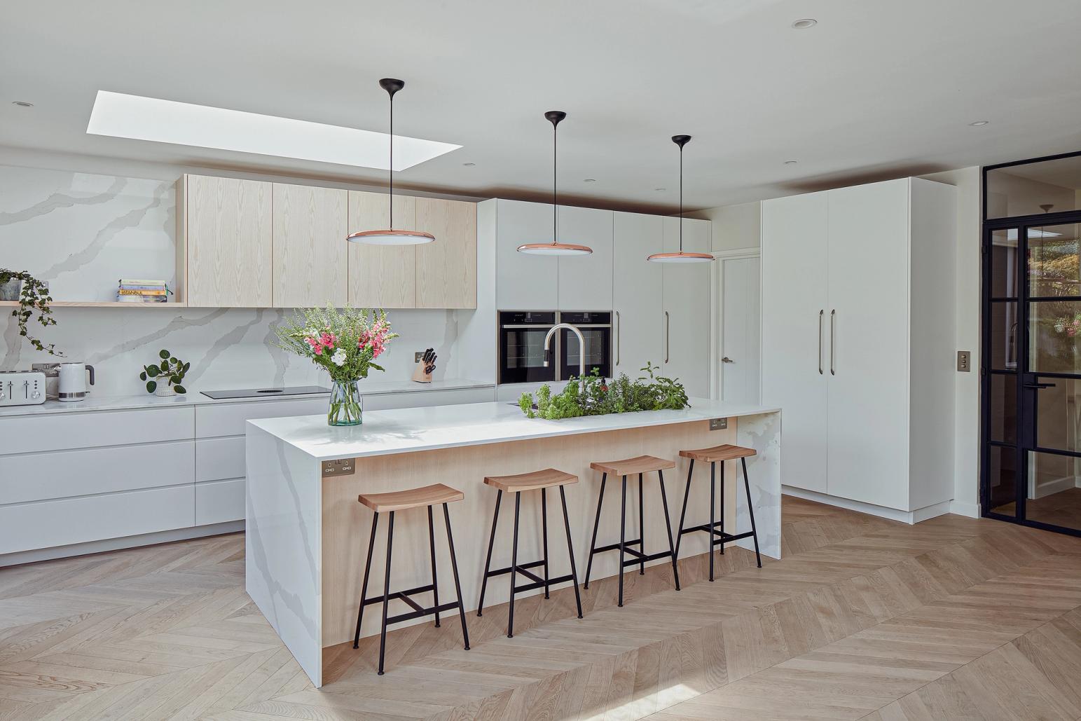 The clients love the typically Scandinavian pale wood and white look and wanted a kitchen that would look good with the new oak floor they were having installed. It also needed to withstand daily life with youngsters which meant quick and easy-to-clean work surfaces and plenty of space so the children could sit and do homework or talk to their parents while food is being prepared. Having a smart, minimalist and clean-lined appearance that can be shown off to friends was also important, especially as the children get older and the clients entertain more.