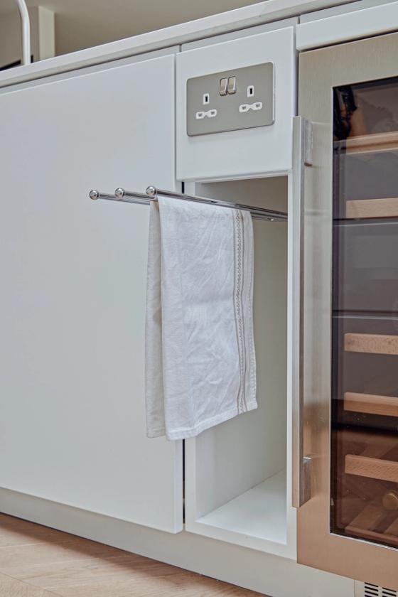 The designer's solution perfectly embodies Scandinavian design principles in action: limed ash cabinetry is thoughtfully paired with outframe-door style cabinets spray-painted in white, adding focus to the overall scheme. Key areas for cooking, food preparation, and storage, including an integrated Liebherr fridge-freezer, are strategically arranged to optimise the kitchen's functionality. Meaningful and beautiful features abound, such as the oak-lined breakfast pantry doors beside the island that can be left open for easy access during meals, drawers with bespoke interior fittings and power sockets discreetly fitted below the island worktop for convenient gadget use. Additionally, a towel rail that slides into its unique cubby hole keeps tea cloths within reach but, with a simple push of the hip, neatly out of the way.