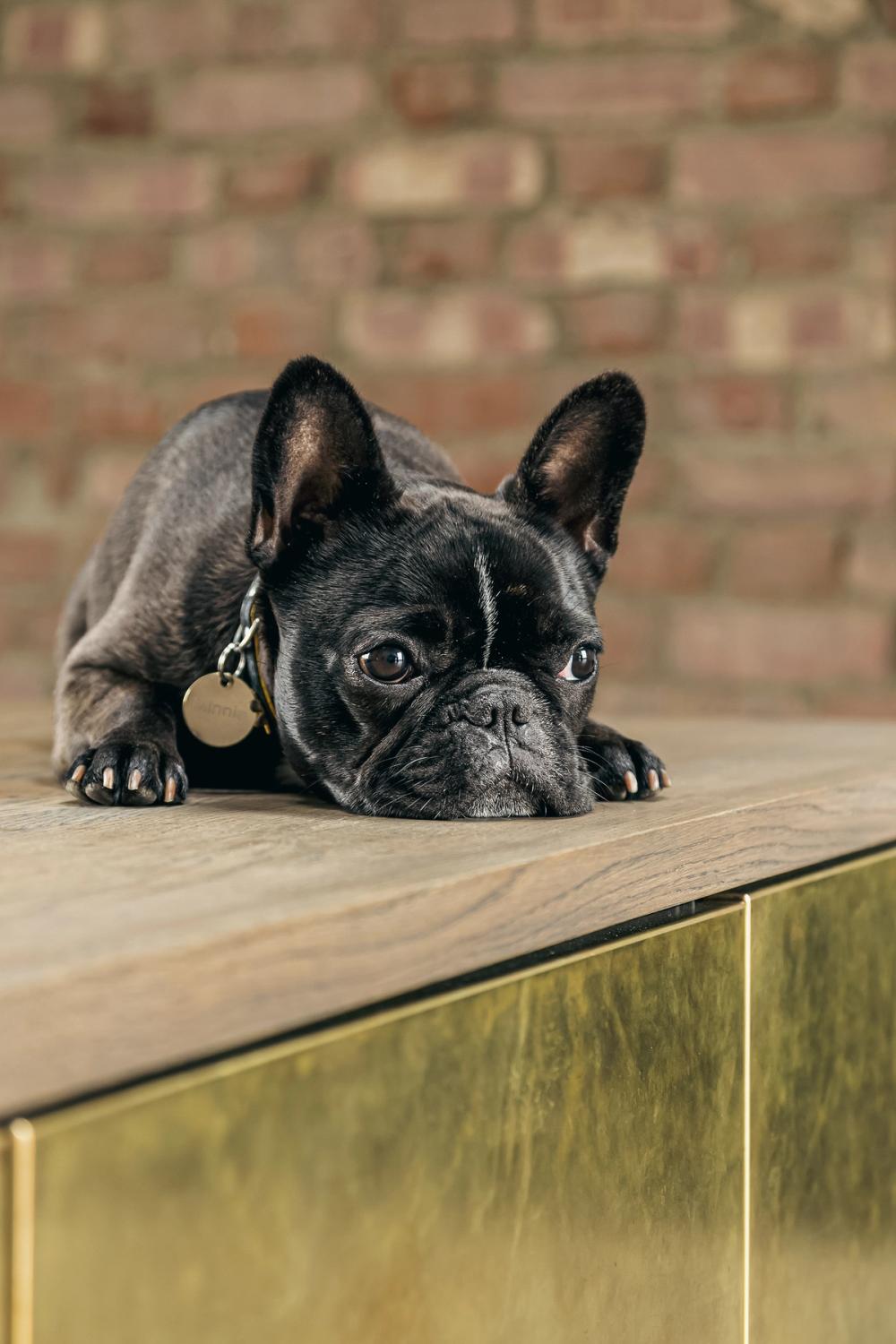 The designer's solution features a burnished brass-fronted island as the standout feature of the newly created double-height room. Behind it, dark grey laminated cabinets with black-stained oak frames provide a striking contrast, while a vintage-oiled solid oak work surface adds warmth and cohesion to the overall look. As the hand-etched and sealed brass isn't suitable as a kitchen work surface, it elegantly wraps around the island's frontispieces instead. Positioned on a black plinth to create a floating effect and set against the dark, ultra-matt laminate backdrop, the island radiates a warm glow in the room's natural light.