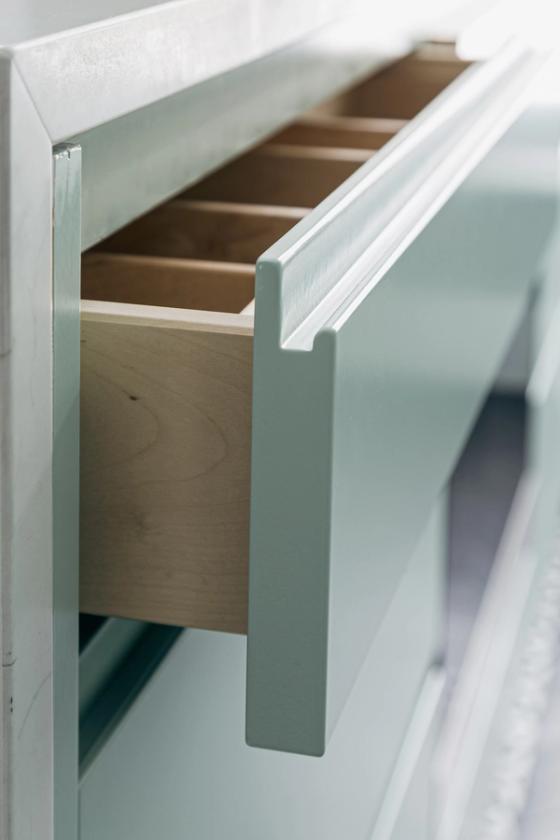 The designer's solution has provided the couple with a stylish yet practical dine-in galley kitchen. Floor and wall-mounted cabinetry houses the fridge-freezer, food pantry above the integrated sink, and accommodates both the washing machine and boiler, all neatly set into a large alcove on one wall. At right angles to this is an island fixed to the opposite wall, featuring handleless drawers, a built-in oven, and a hob with downdraft extraction integrated into the stone waterfall carcass. Parallel to the island is a bespoke dining table and bench that can be pushed into a second wall alcove, allowing the floor area to open up when not in use.