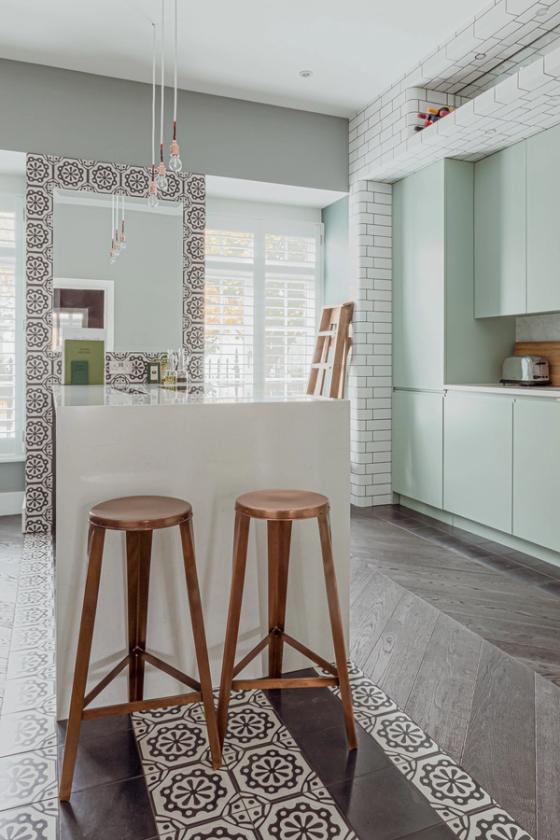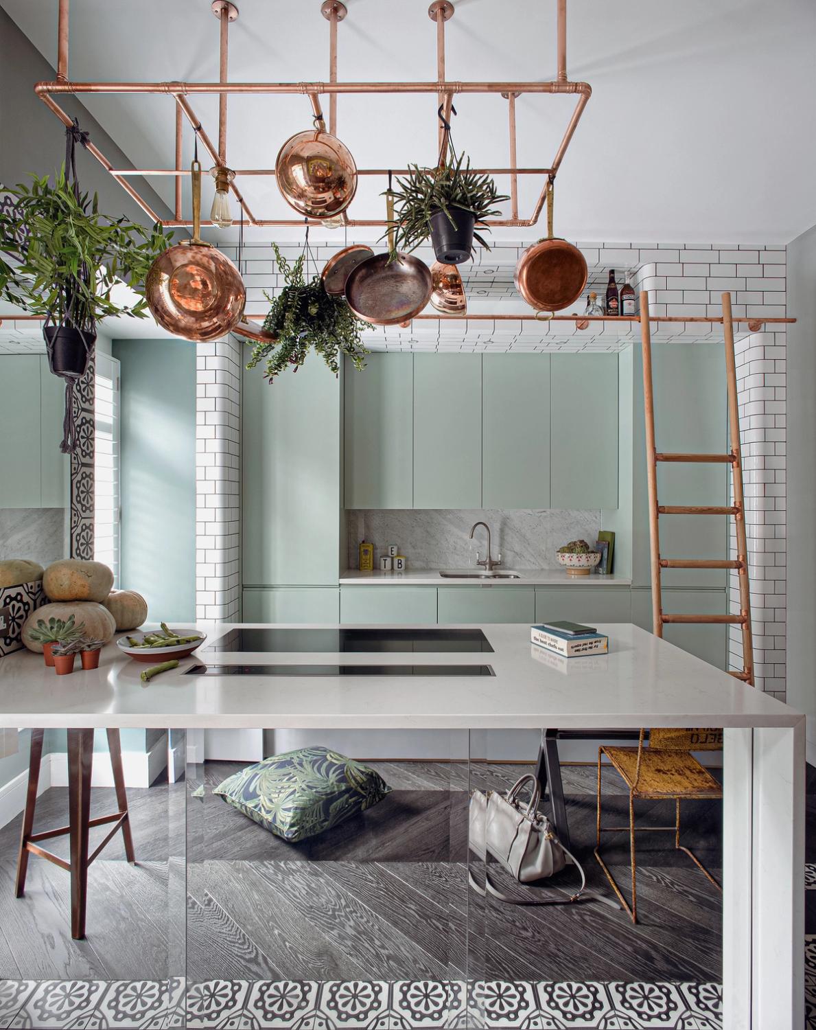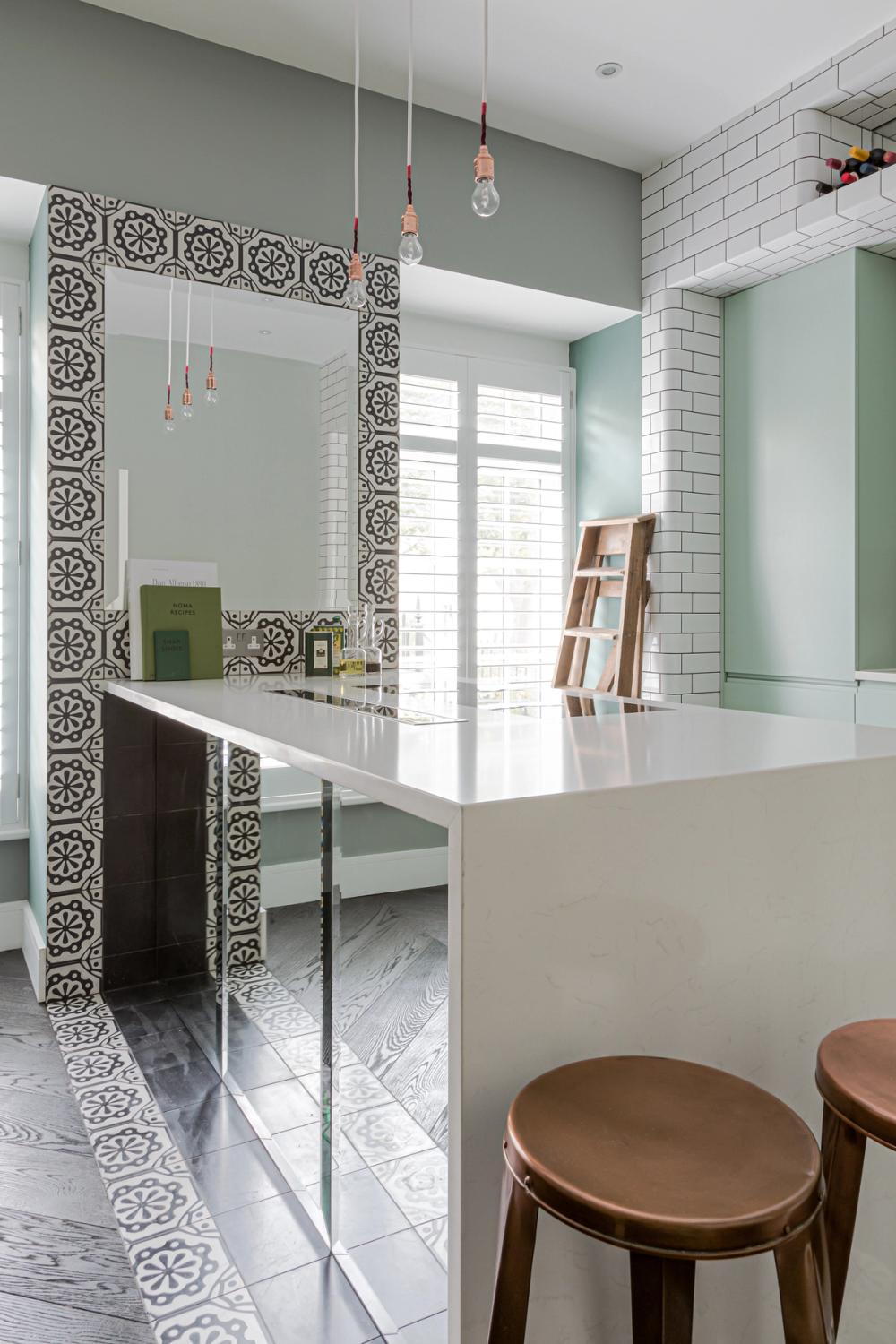 Finishing touches: the door that hides the washing machine and the boiler has been split to match the arrangement at the opposite end of the alcove, where the two doors open separately to reveal the fridge and freezer. Mirrored panels on the wall at the end of the island, and along the front of the island were added to make the room feel larger, and copper piping was used for the decorative but functional ceiling rack that complements the metro-style tiling.