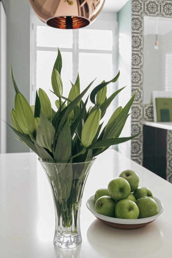 The clients needed a design that provided a comfortable dining area, along with dedicated spaces for food storage, preparation, and cooking. They also wanted clever storage solutions—some open and decorative, others hidden—to keep surfaces clean and tidy. Additionally, due to the apartment layout, the kitchen had to accommodate both the washing machine and the boiler.