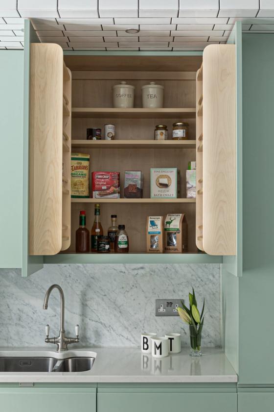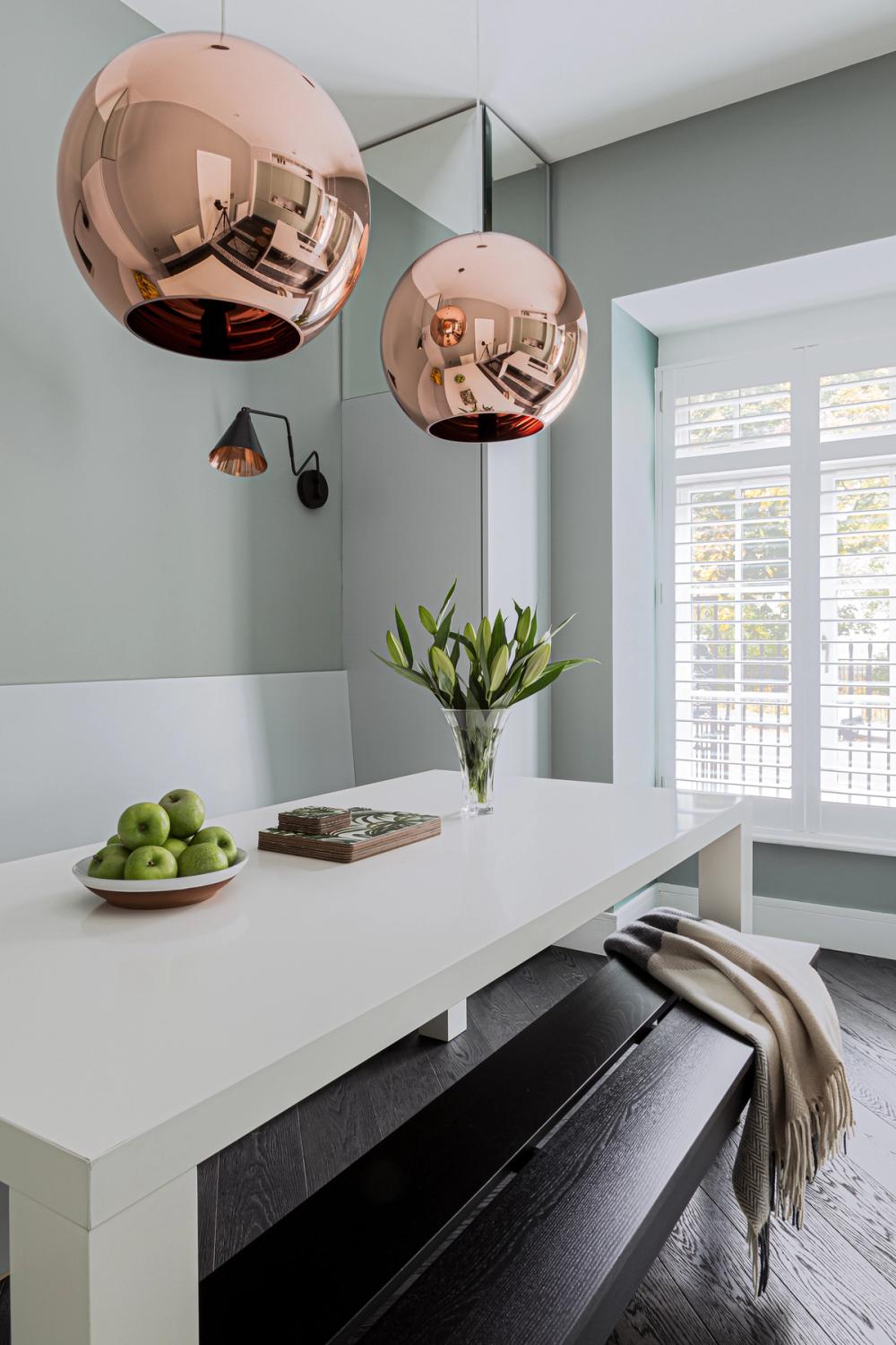 Storage solutions: a banquette built into the wall behind the dining table doubles as hidden storage while the mirror-lined alcove above the sink is designed to be used as a wine rack with a fixed rail to support the stepladder for access.