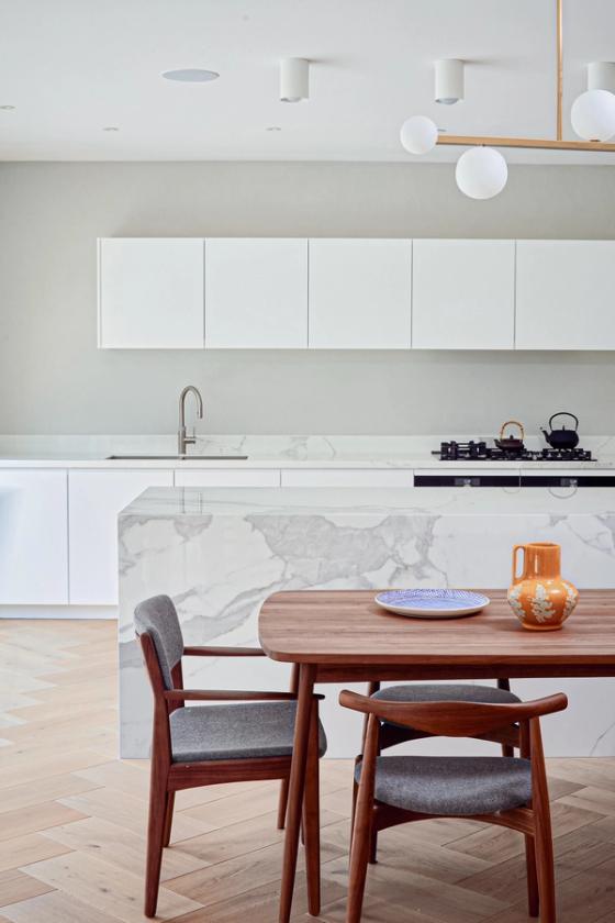 The clients wanted a statement island that would give the living-dining space a bold talking point and complement the modernist fireplace, unfussy cabinetry, and a pale colour palette to contrast with the natural wood and make the room feel bright and calm.