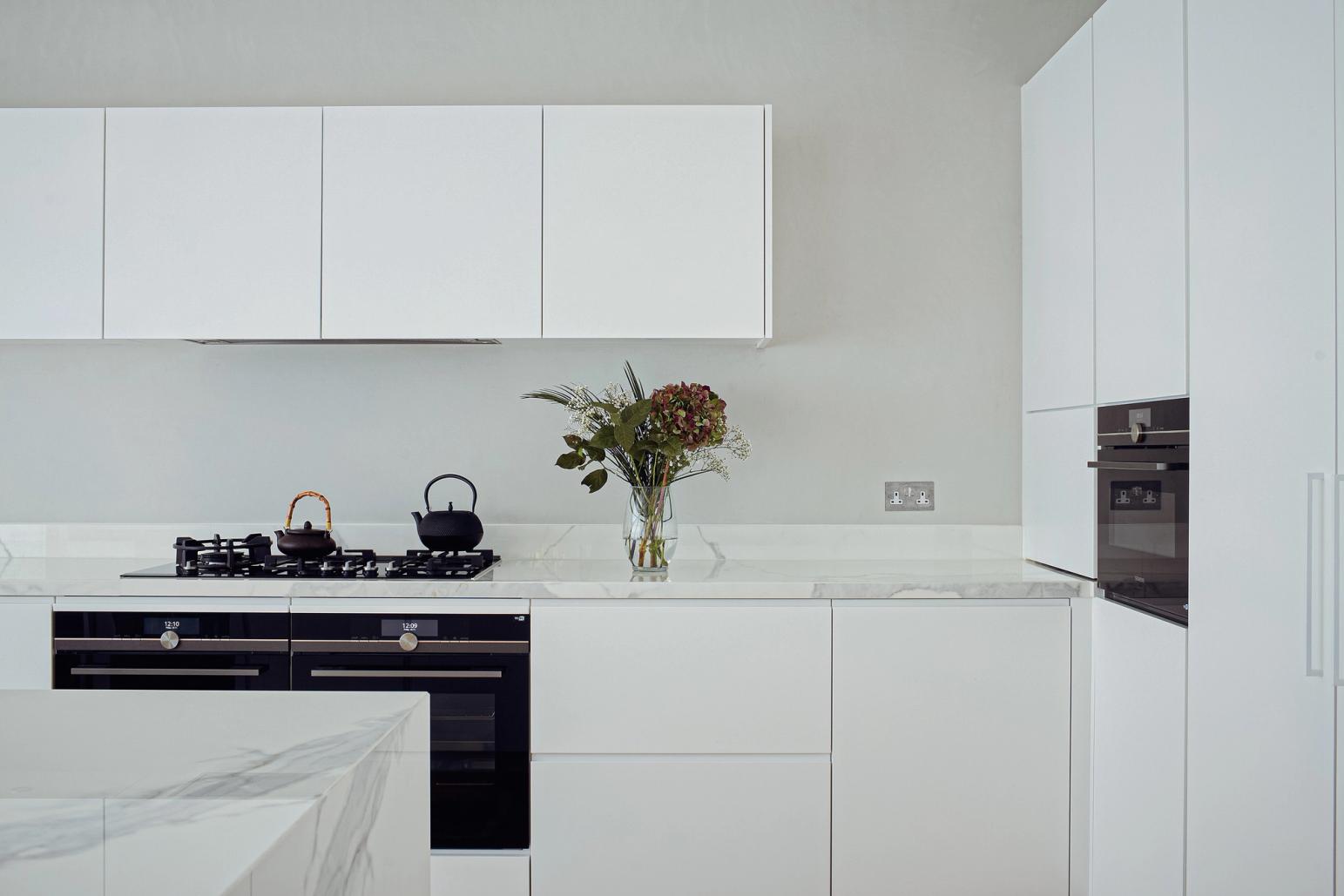 The designer's solution is a Scandinavian clean design at its finest. The white sintered stone island, with impeccably mitred edges, is fitted with deep storage invisible to anyone sitting at the dining table, and its solid, sculpted form is perfectly off-set by the flat-fronted, invisible handle cabinetry that lines the walls behind and to the side. Large base drawers provide plenty of storage, and the floating wall cabinetry, which incorporates the extraction system for the gas hob, is hung like a piece of artwork, with lots of empty wall space all around it so the room feels open and airy.