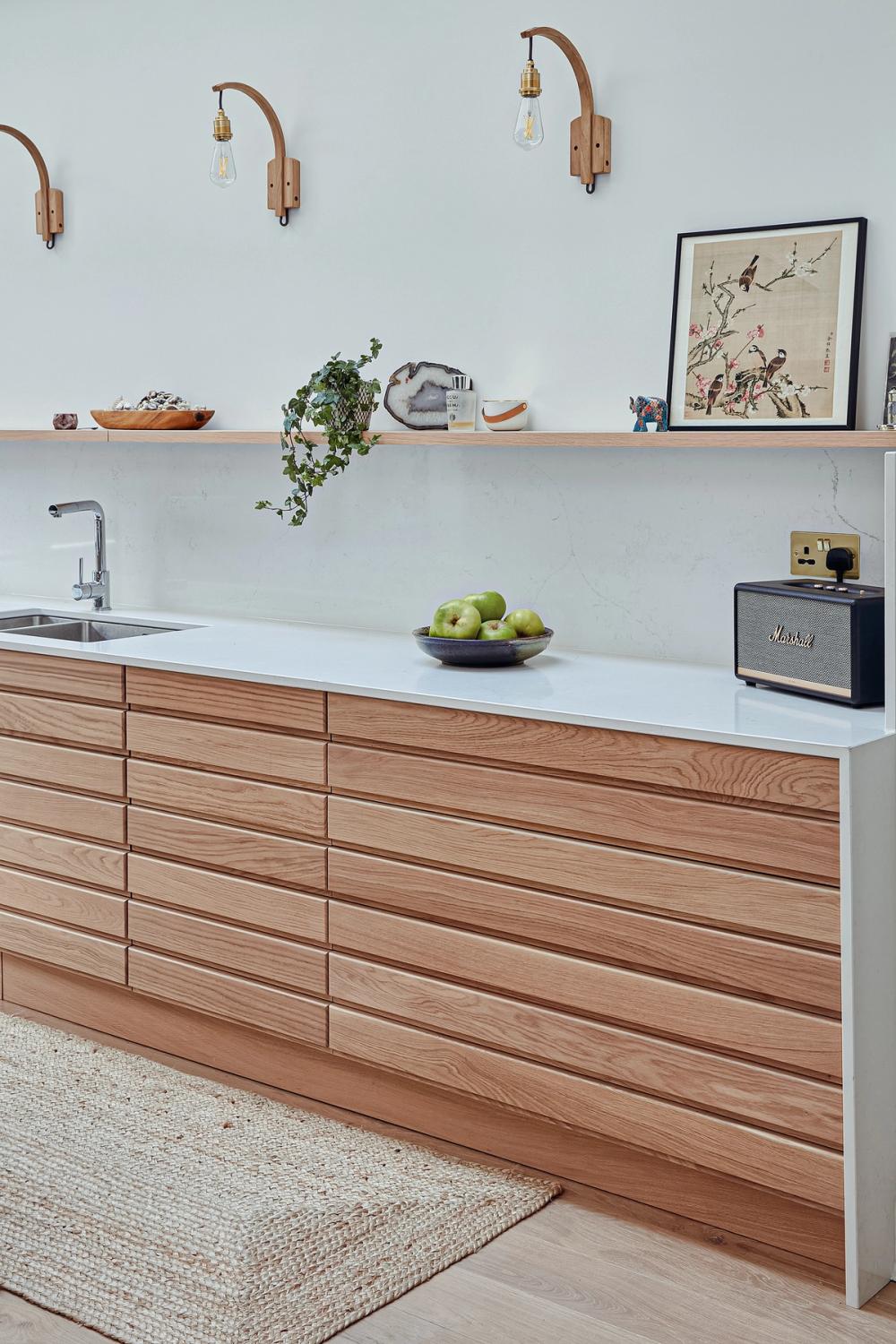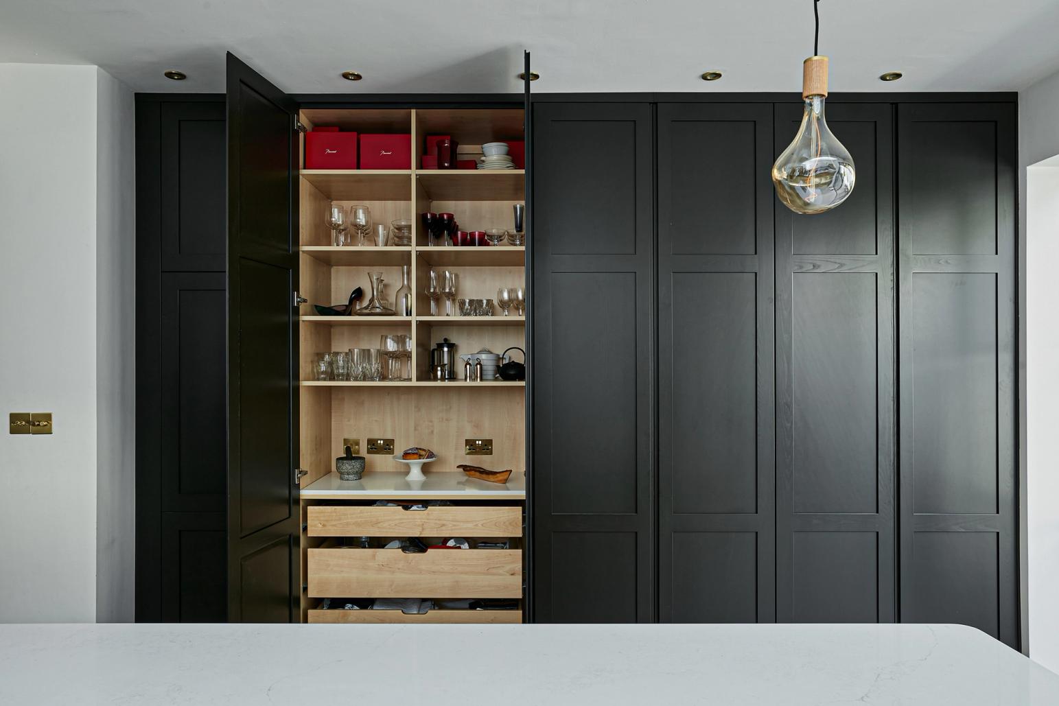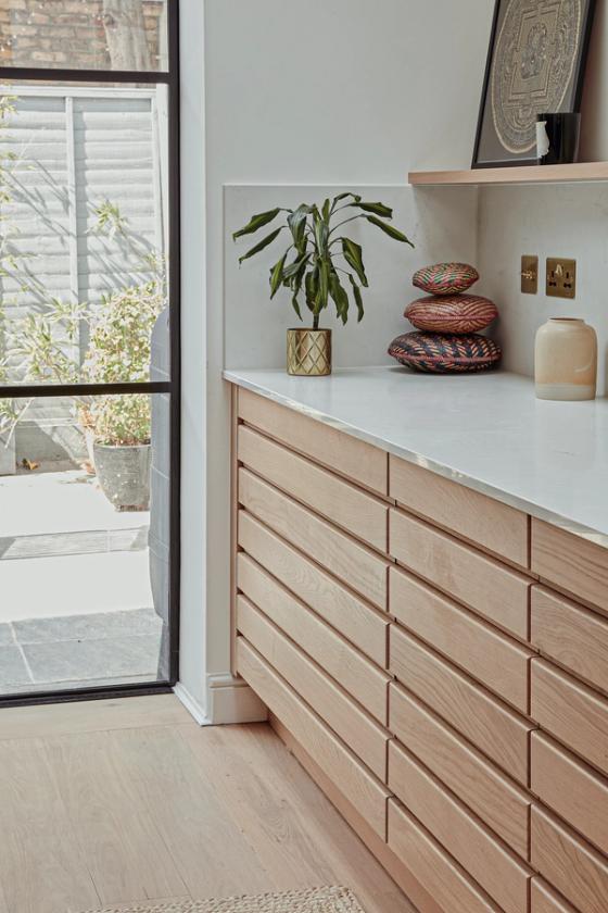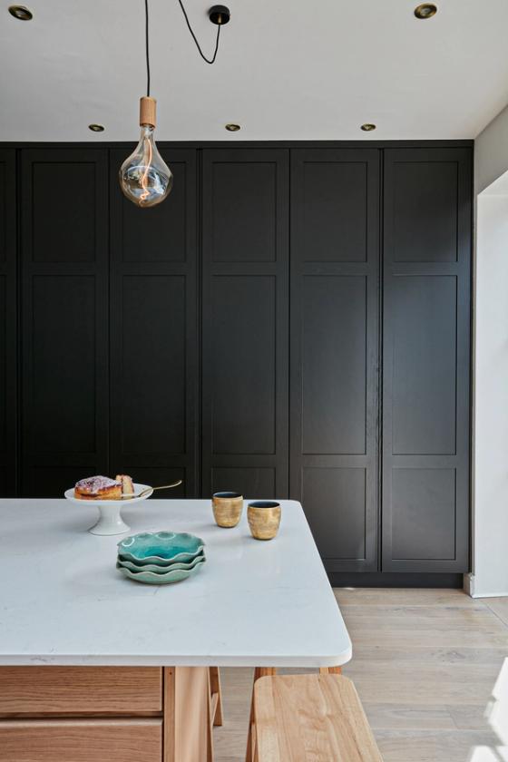The designer's solution embraces simple, timeless elegance. Tall, Shaker-style cabinetry and the natural texture of the slatted oak Hygge base cabinets are skilfully combined with a fresh white marble-effect quartz worksurface to make the most of the room's natural light, height, and length. A skillful layout provides subtly defined zones for cooking, storage, eating, and general living and creates a room with an organic, evolved over time yet modern look, in keeping with the age of the house and without chasing trends. Spray-painted black for stylish durability, the Shaker cabinets enclose an integrated Liebherr fridge-freezer and abundant pantry space, and each of the white-pigmented oak Hygge drawers contains a bespoke organised interior so the owners can keep the surfaces clear of clutter.