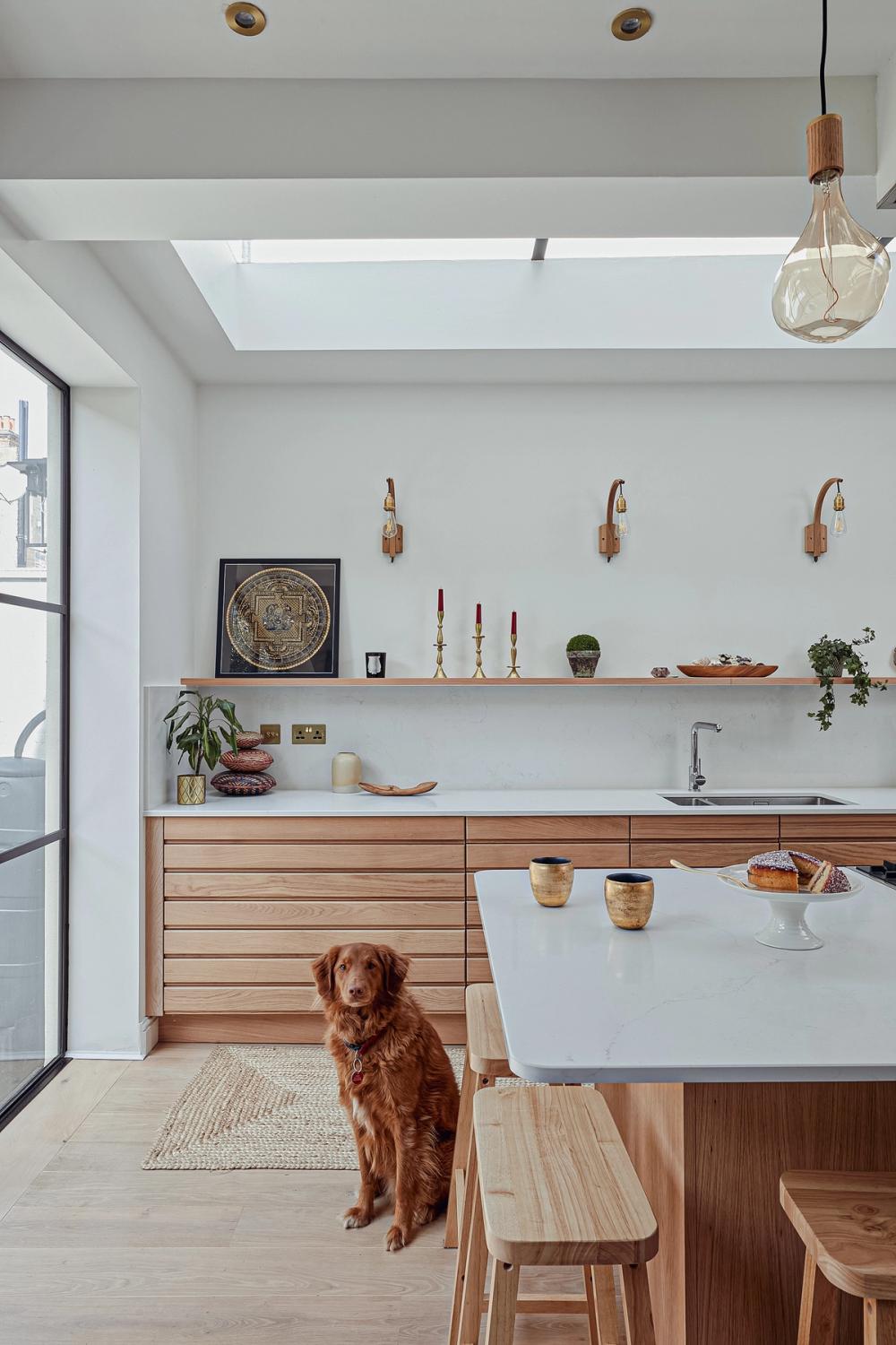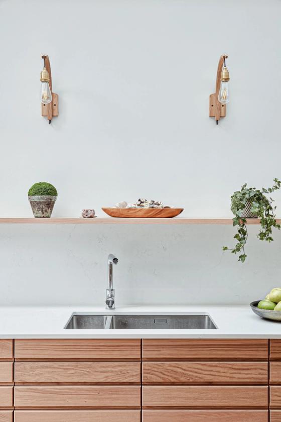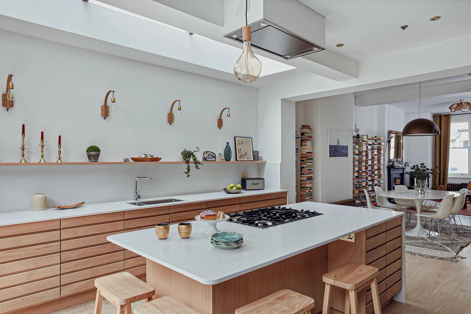 Finishing touches: a floating shelf of oak, to show off family treasures. Bar seating is arranged around a corner of the island, rather than along one side, and looking into the room, towards the dining table, is more sociable.