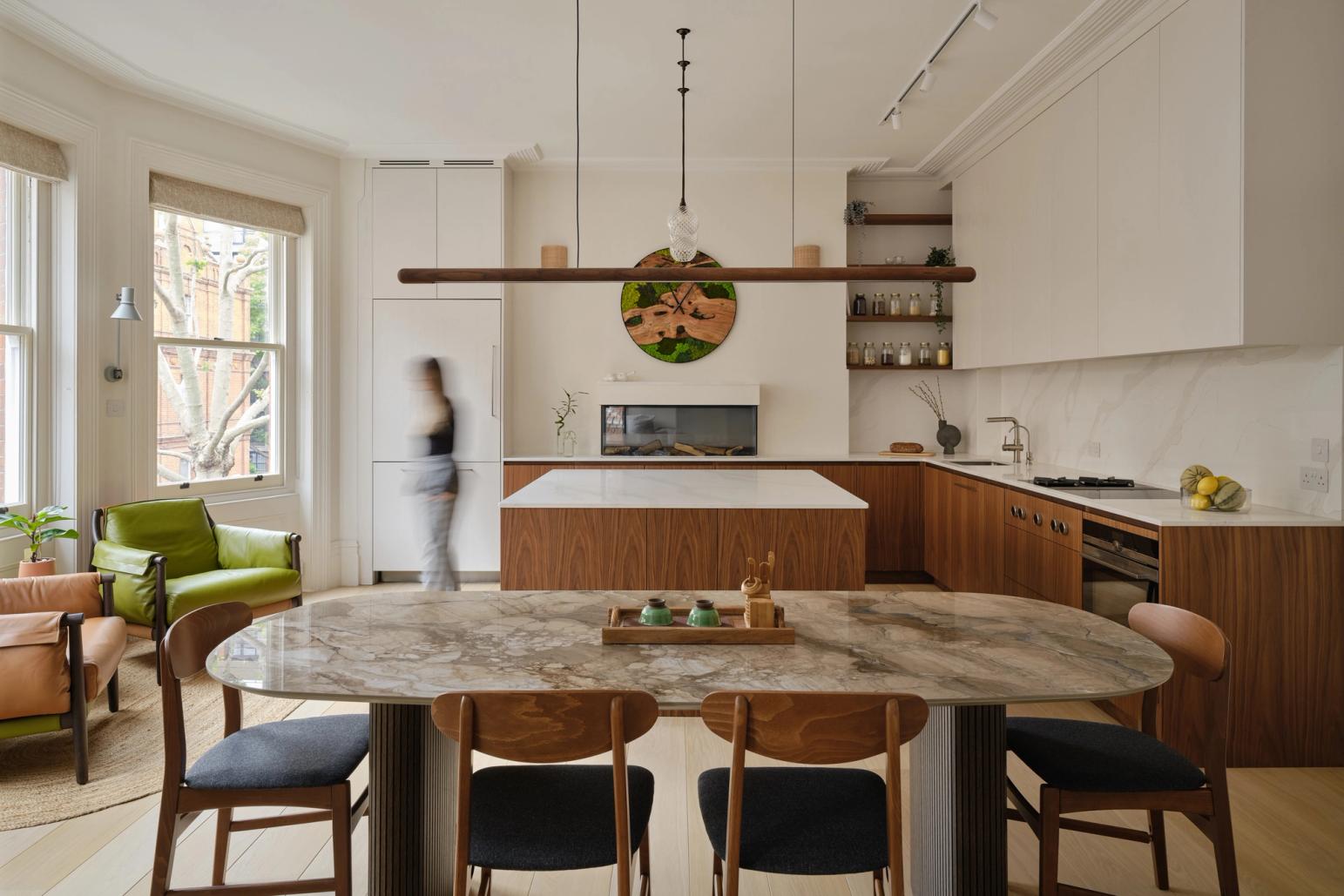 The designer's solution uses flat-fronted cabinetry to create a tangible sense of calm while at the same time, allowing the room's architectural details to shine. Keeping the walnut cabinetry at floor level firmly anchors the kitchen in its place, while the extra-tall wall-mounted cabinetry, including the column that houses the American fridge-freezer to the left of the fireplace, is in perfect proportion with the grand scale of the room. Painted to match the walls and edged with coving that matches the original in the room, the effect is both decorative and spacious, yet not overwhelming.