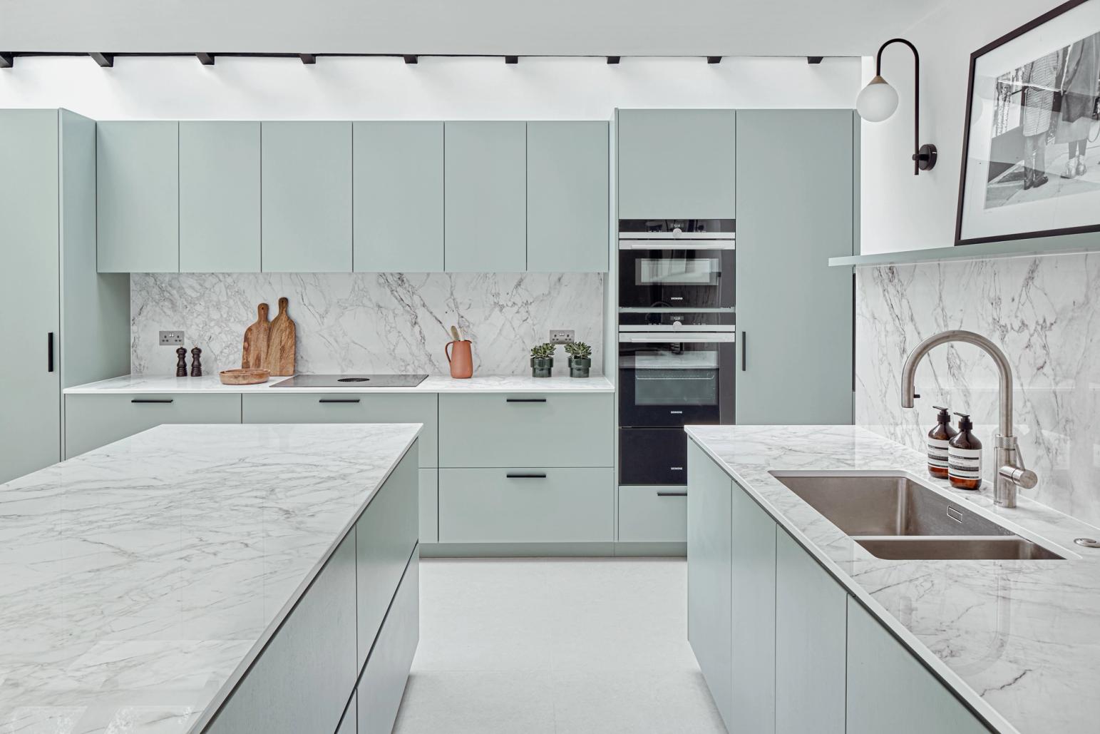 Creating interesting colour stories for the kitchen using a play on the material instead of paint selection. Pulling out the blues, greens, and pinks from within marbles, and other worktop surfaces is a perfect way to balance out the warmth from the wood whilst it still gives a dynamic impact without needing to paint with colour.
