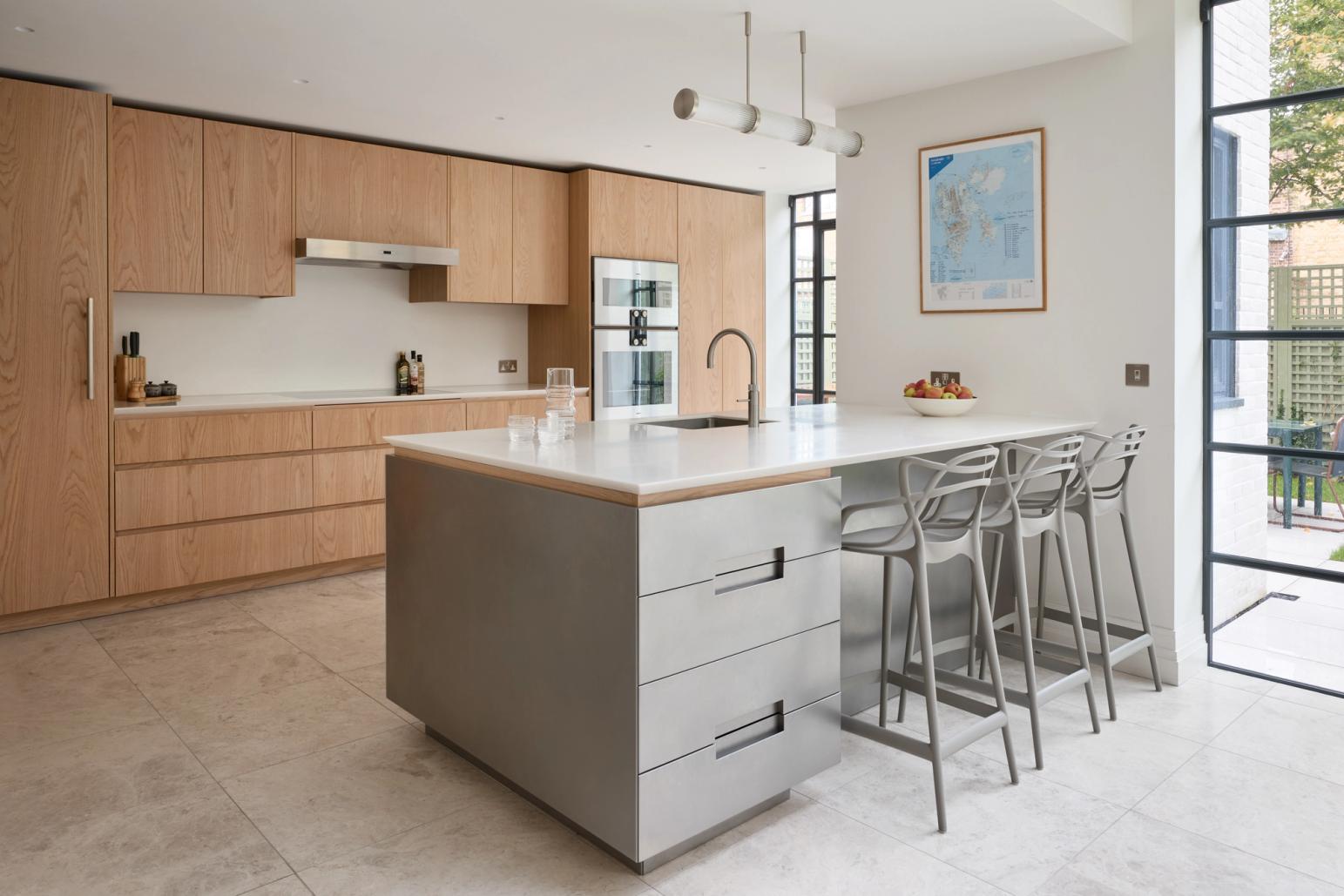 Once reserved for commercial kitchens, stainless steel is making a refined comeback. No longer harsh or cold, today’s iterations are warmer in tone and often matte or brushed for a softer effect. When combined with natural materials — such as fluted oak, travertine, or quartzite — stainless steel creates a sleek yet inviting contrast. Used for islands, worktops, or built-in appliances, it delivers durability with design integrity.