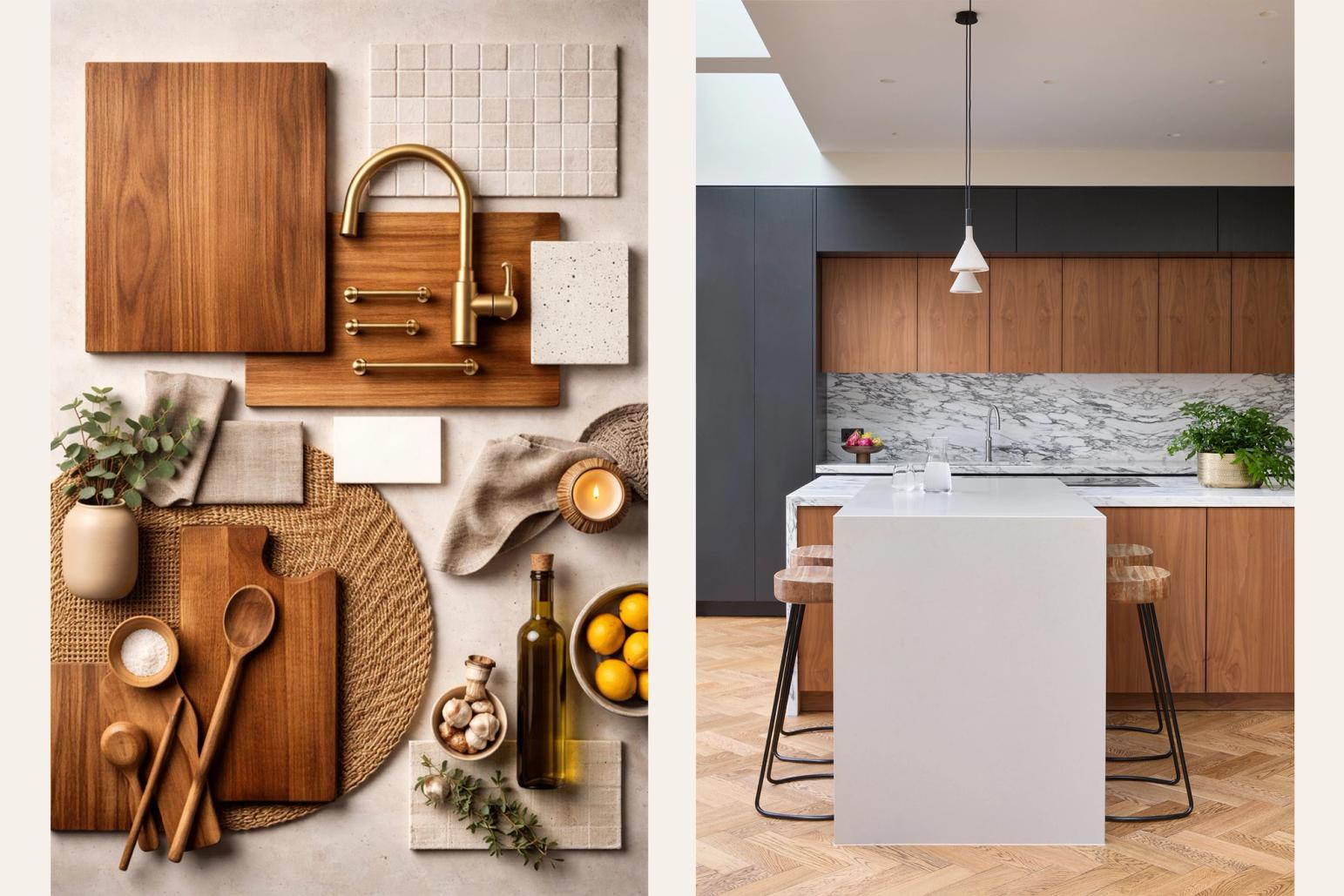 The dominance of pale Scandi timbers is giving way to richer, mid-tone hues. From golden oaks to smoked walnut and toasted ash, these finishes provide a grounding warmth and luxurious feel. They’re ideal for clients looking to create inviting spaces with character, without going too dark or traditional. Combined with tactile elements like leather handles or brass accents, they exude quiet sophistication.