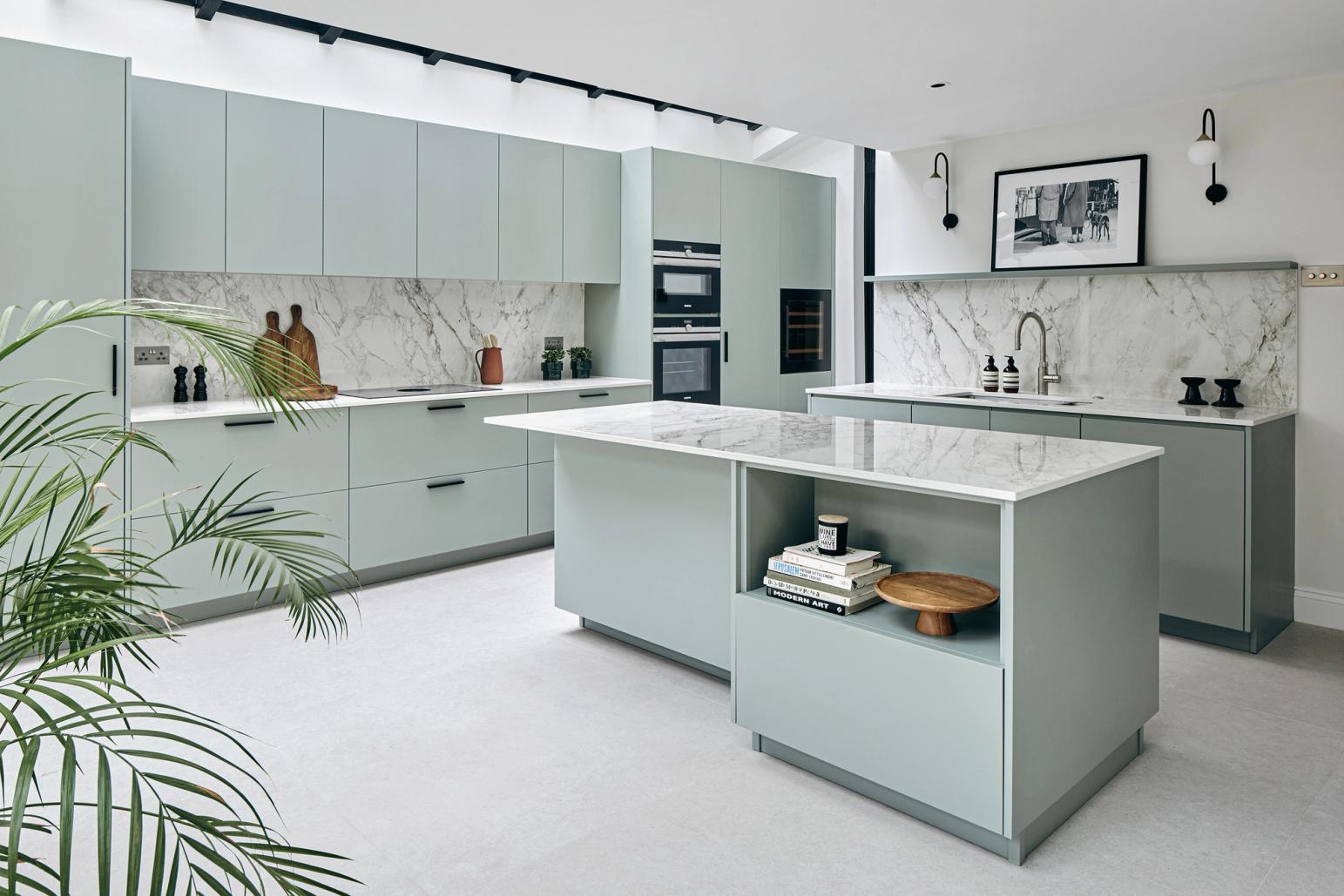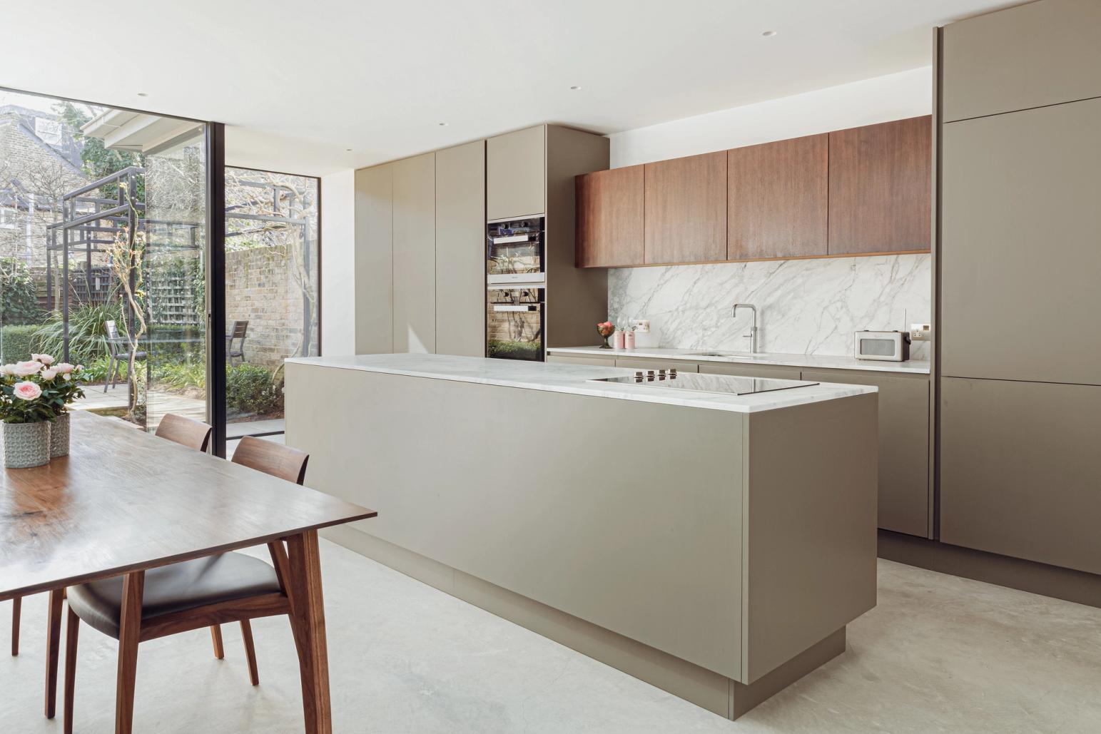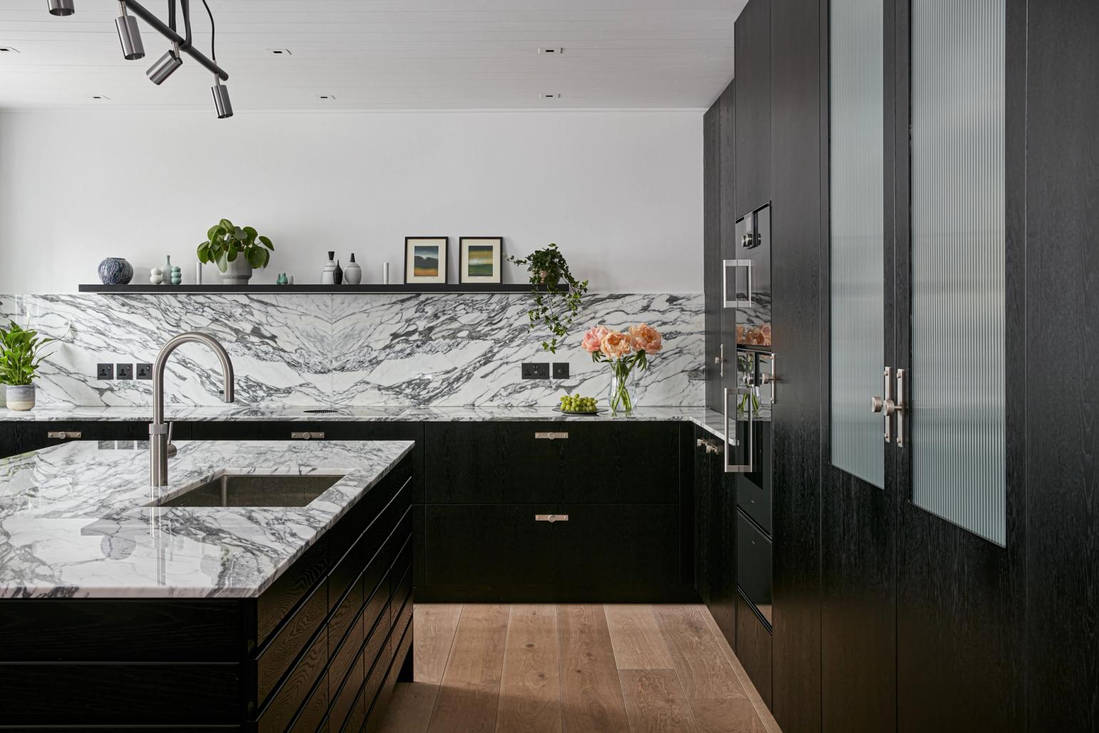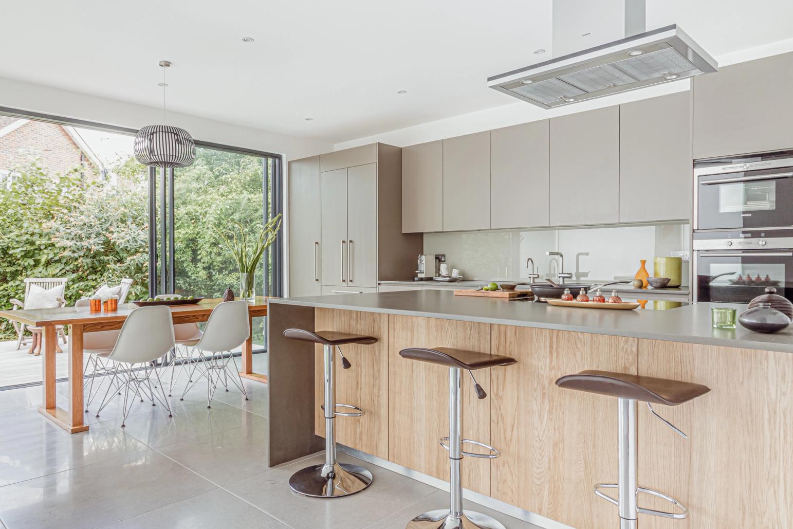 Using the same worktop materials for preparation and island areas, as for the splashback looks sleek and contemporary.