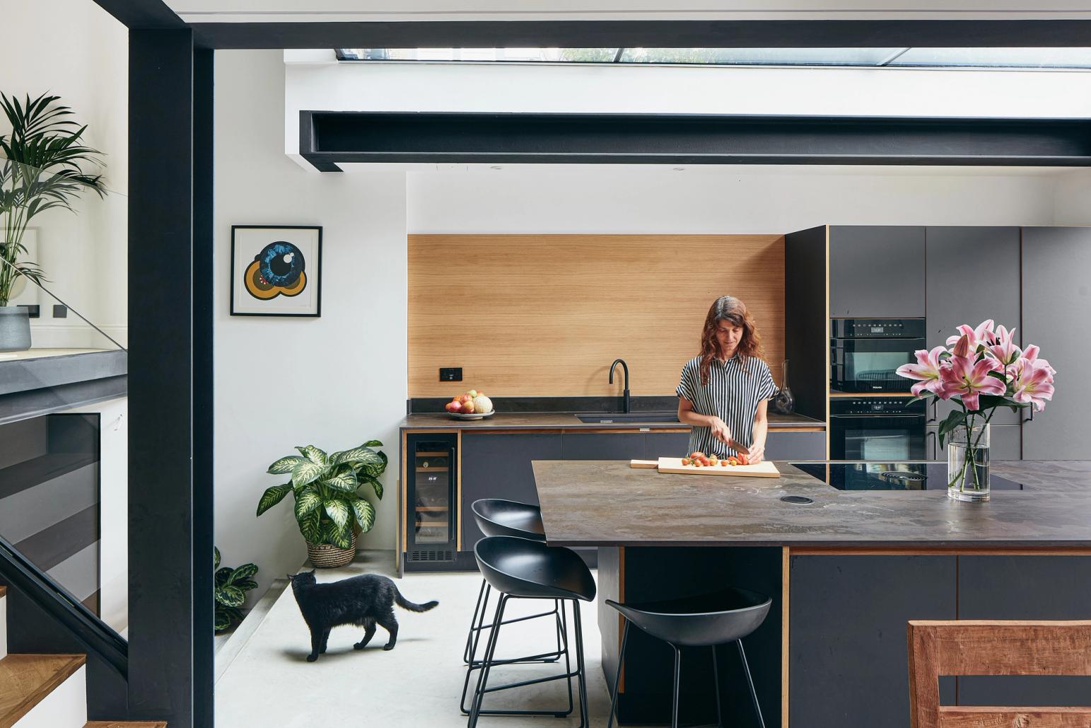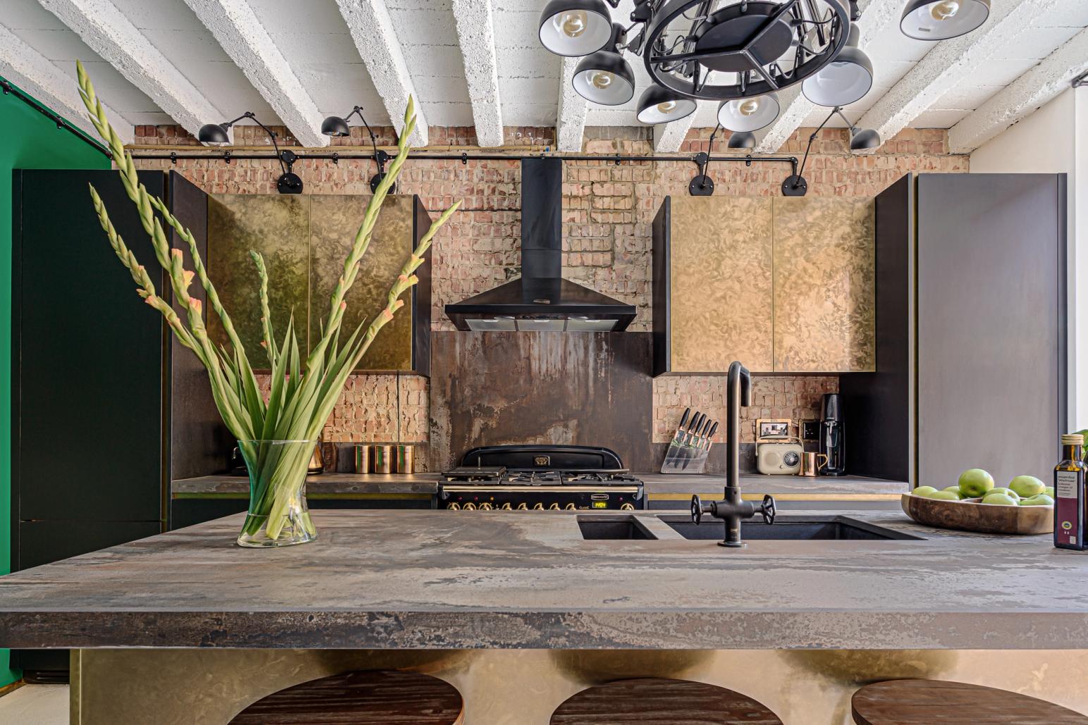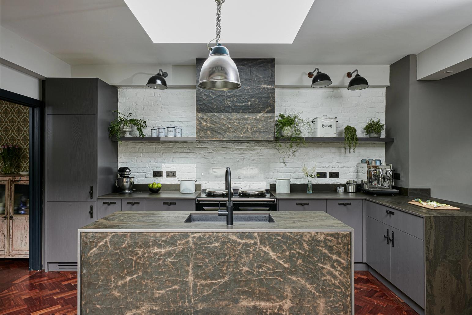 Stainless steel or zinc worktops have an industrial look, and bronze metal surfaces have a slick masculine look, all these are easy to look after.