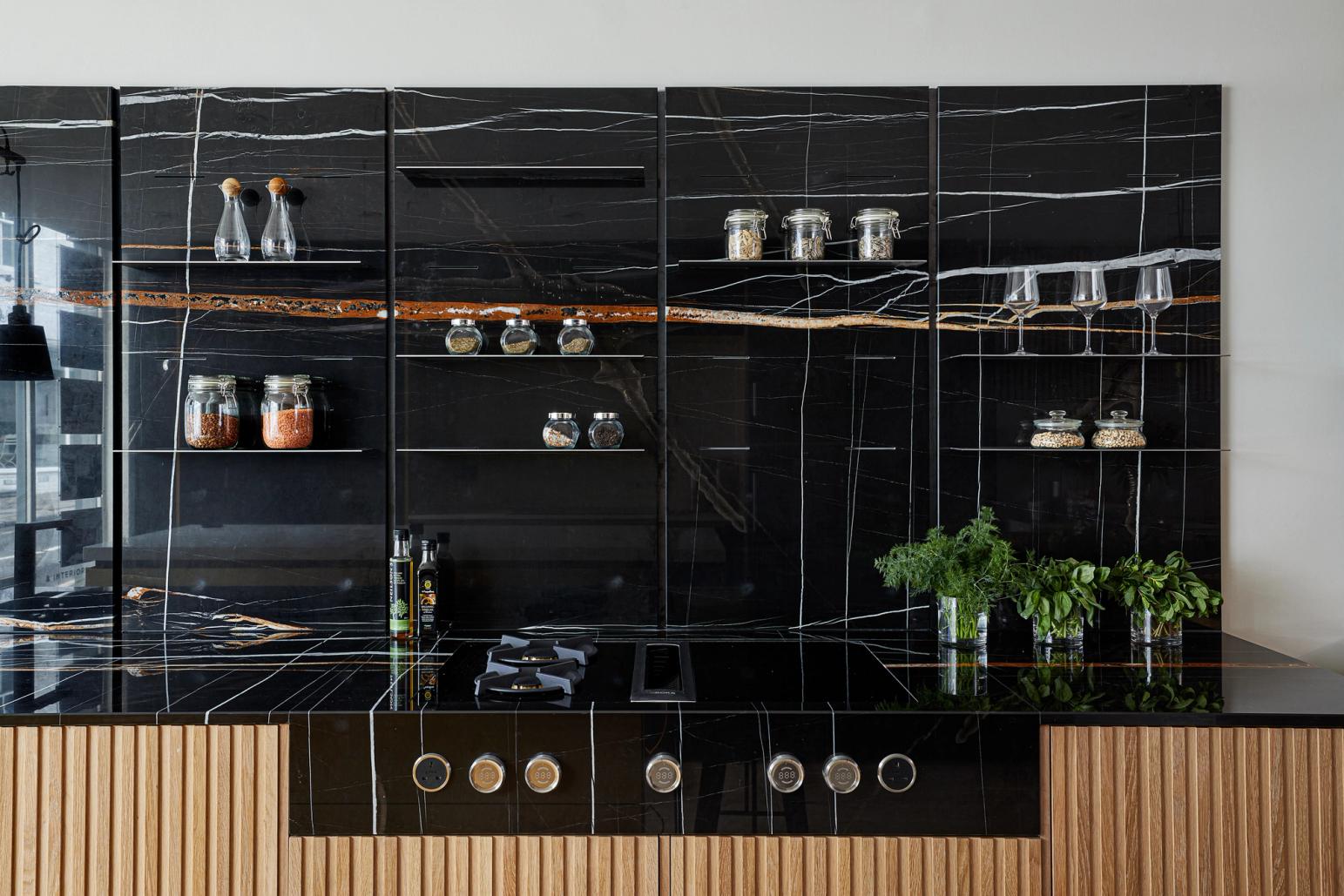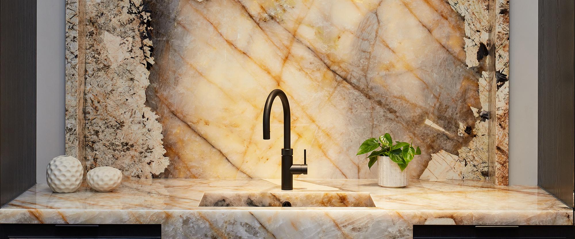 The stunning solid and impressive appearance of real stone in this kitchen, which has been book-matched, to create a mirror image, and is an elegant focal point that complements the cabinetry.