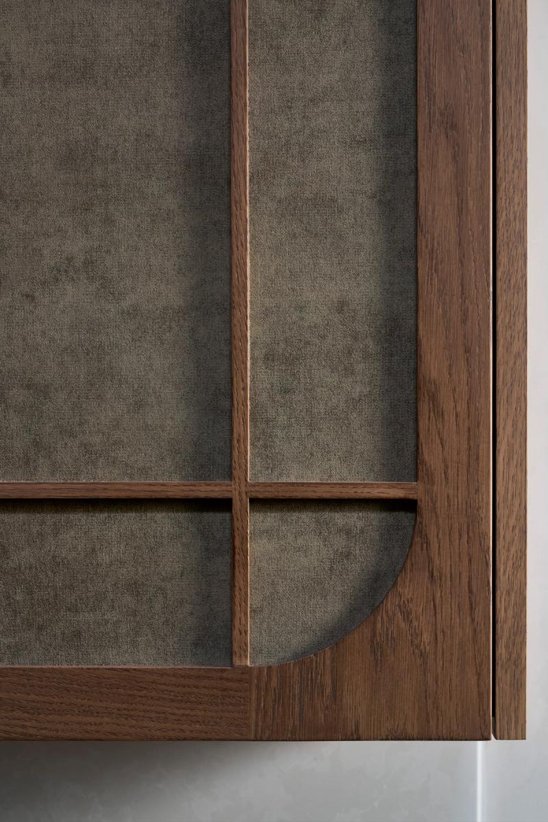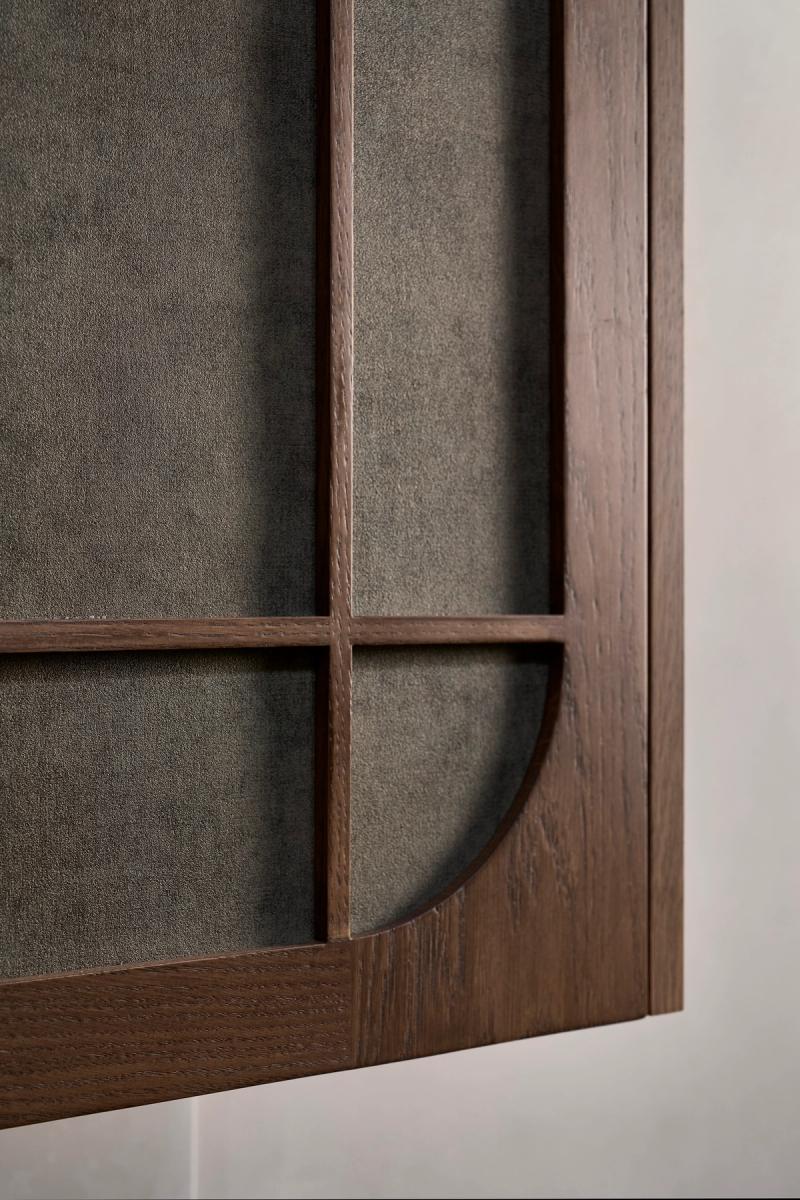 It is not just about materiality; it’s the detailing that defines Gerakas. A slim fretting runs through the centre of each frame, lending a quiet architectural rhythm to the doors, a modern take on traditional panelling. This is complemented by a gentle curve that softens the geometry of the design, creating a subtle, sculptural silhouette that feels both structured and organic.