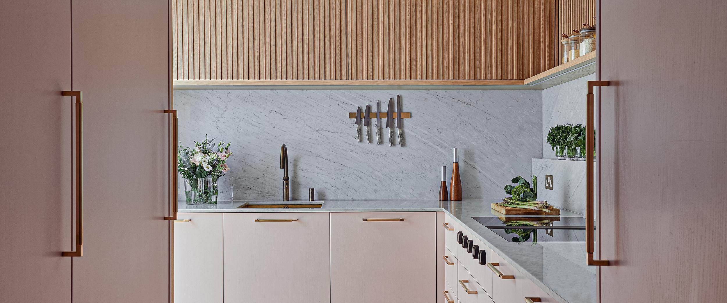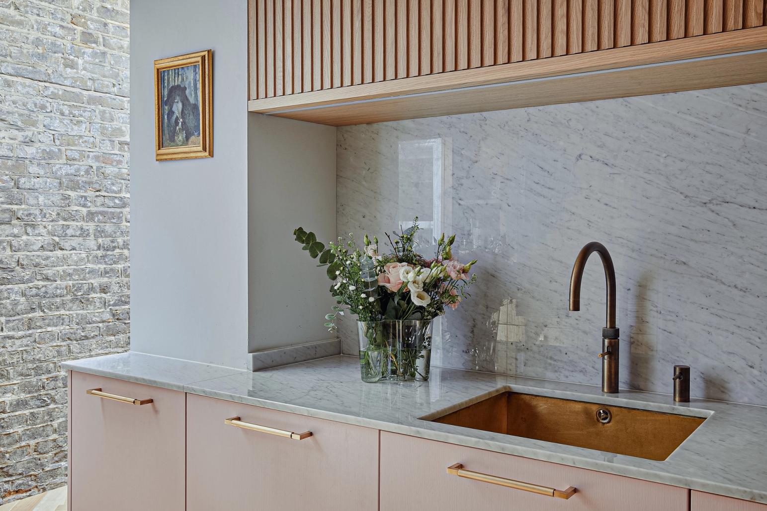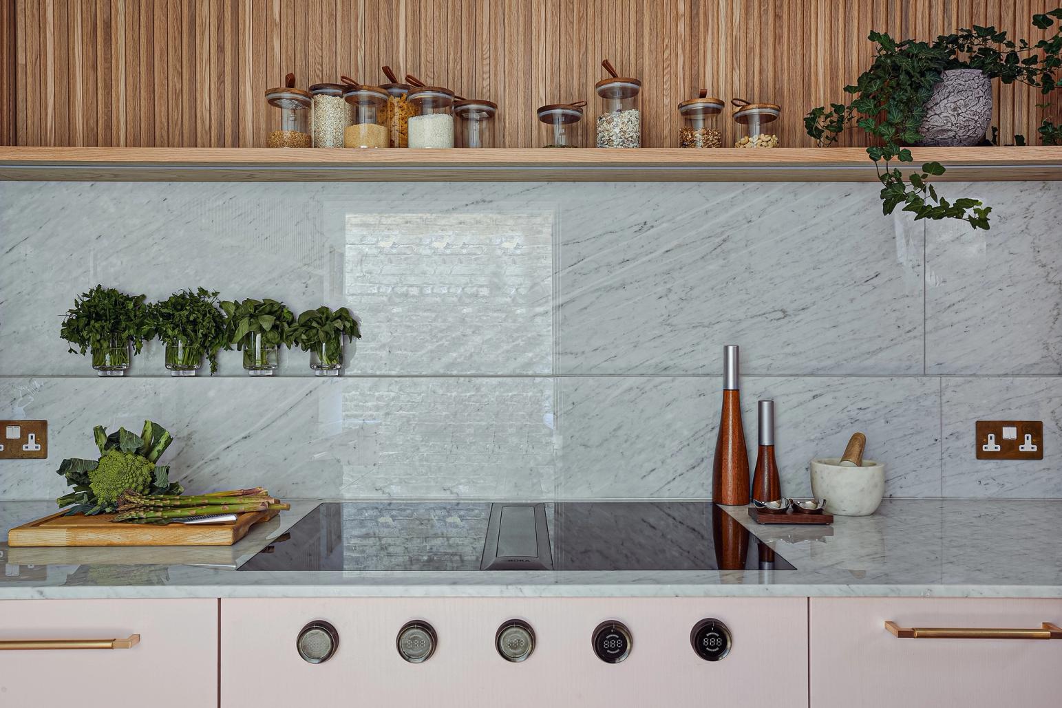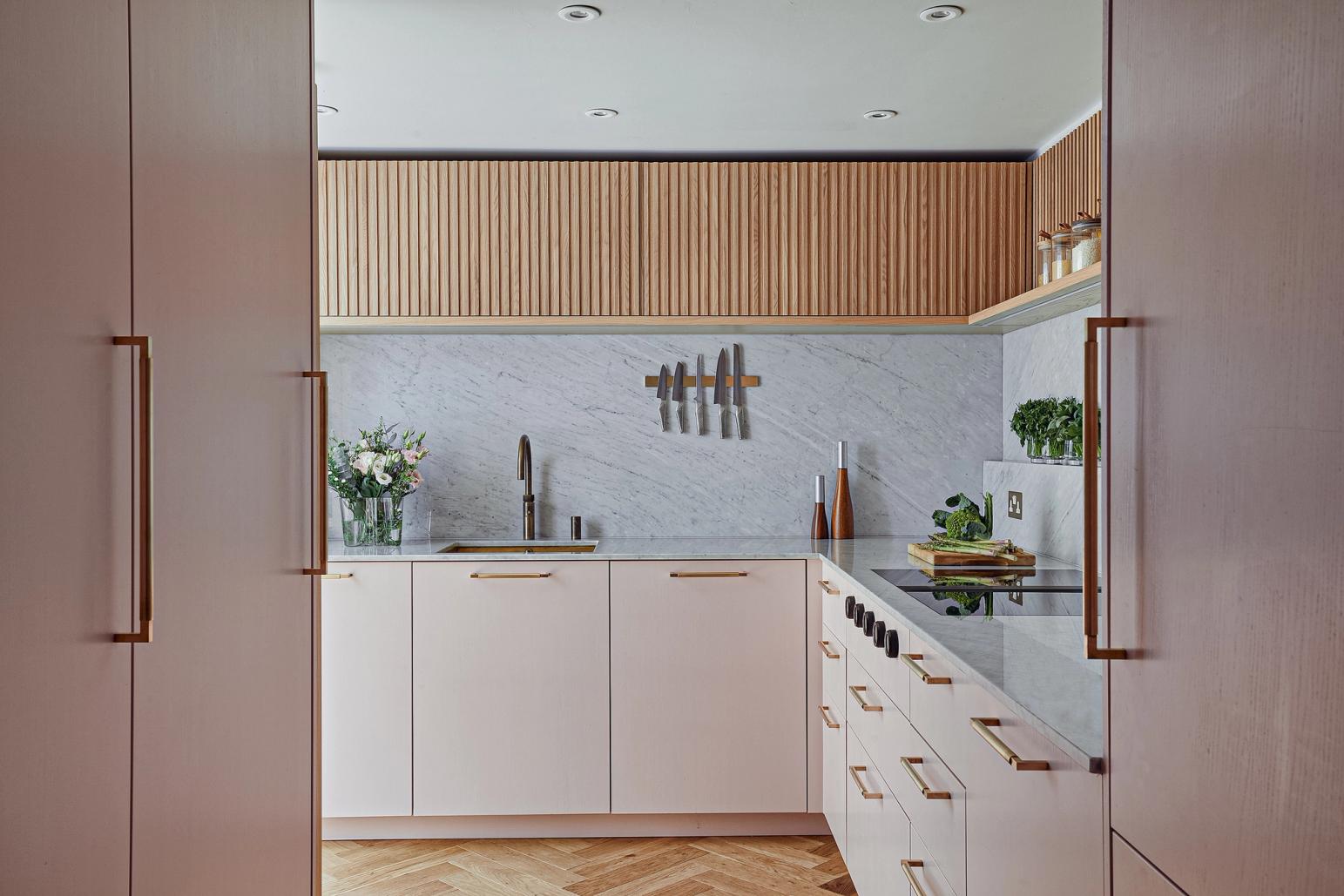 Sofia's design solution included filling one of two doorways into the kitchen so that all the cabinetry she wanted could be run along the walls on both sides of the L-shaped room. To create the sleek modern look, flat-fronted cabinetry is used for the tall and base cabinets, with a bank of white-pigmented slatted oak Skog cabinets, one of Sola Kitchens' signature styles, mounted on the wall above the sink for a homely finish. Instead of putting another bank of cabinets above the hob, which would have made the room feel overly full, Skog panels line that wall instead, with a wooden shelf for decorative display. At the same time, a classic, black-veined Carrara marble worktop and brass bar handles by Joseph Giles pull the scheme together. The fridge, freezer, boiler, and clothes dryer are all integrated within the tall cabinets by the door, as is a pantry with a difference. As one drawer had already been sacrificed below the Bora hob, to accommodate its downdraft extraction system, Sofia wanted to keep the second drawer and so put the Gaggenau oven inside the pantry instead. Adding a pocket door to the cabinet means she can leave it open to ventilate when the oven is in use. Cookery utensils are stored in the wall cabinets and glassware and crockery in the glass-fronted dresser, alongside which Sofia has put a bar-stool-height piece of white-pigmented oak, for drinks and light meals or for guests to perch beside while she and her husband cook.