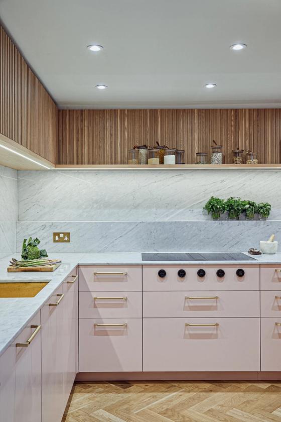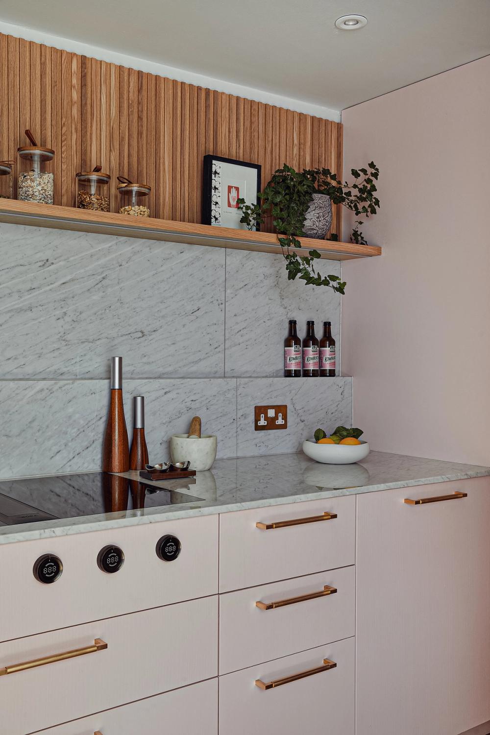 Pretty in pink: Sofia has used Little Green's Confetti, a muted, chalky pink paint colour, for the cabinetry, and the painting was done by hand, on-site, which means the colour can be easily changed if she and her husband get bored of it and want to try a blue or a green hue at a later date.