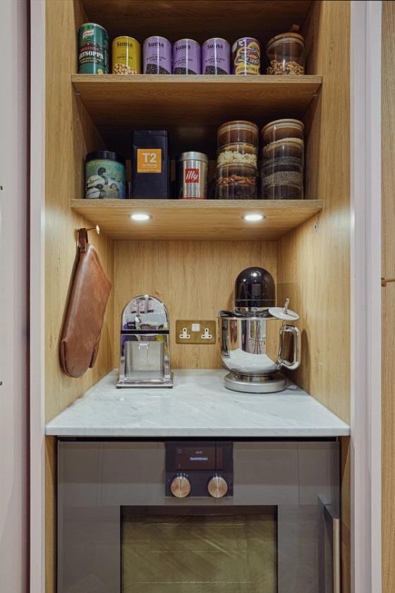 Bespoke storage: a small collapsible step ladder so Sofia can reach the top shelves and cabinets was designed to be easily pulled out from underneath one of the base cabinets. Further storage space has been hidden within the wall of the corridor leading into the kitchen, with push-to-open doors and oak-lined interiors.