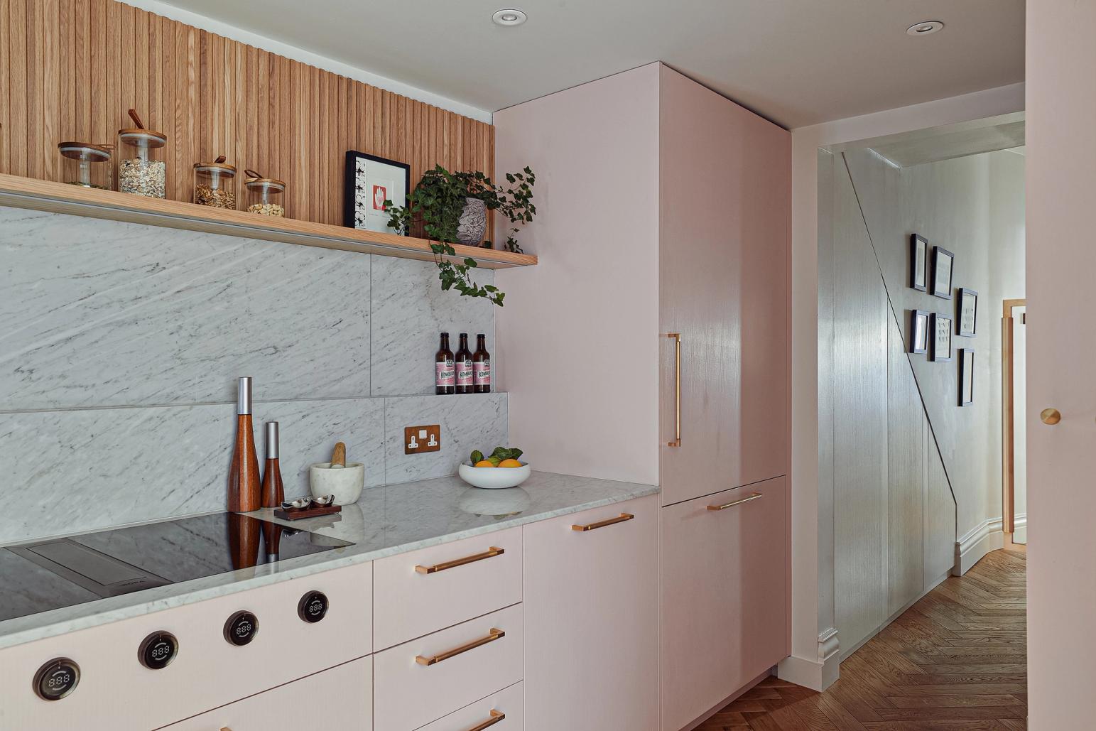 Sofia wanted a modern but homely look for her kitchen, with a layout that hides it from the general living area and cabinetry that provides plenty of storage and space to work as she and her husband are both keen cooks. The windowless room is situated in the middle of the ground floor, between the front door and bedrooms on one side and the living room on the other, so the route through it needed to be straightforward and away from the walls so these could be used for cabinetry, and the design needed to feel light and open, look stunning and be easy to keep free of clutter. Instead of a hob with an overhead extractor hood, Sofia planned to have a Bora with a downdraft extraction system, a 90cm Gaggenau fridge-freezer, and with nowhere to dry clothes without turning her home into a laundry, a drying cabinet was also on the non-negotiable list of essential appliances. Last but not least, Sofia was determined the colour and materials palette would comprise pink, white, oak, and brass.