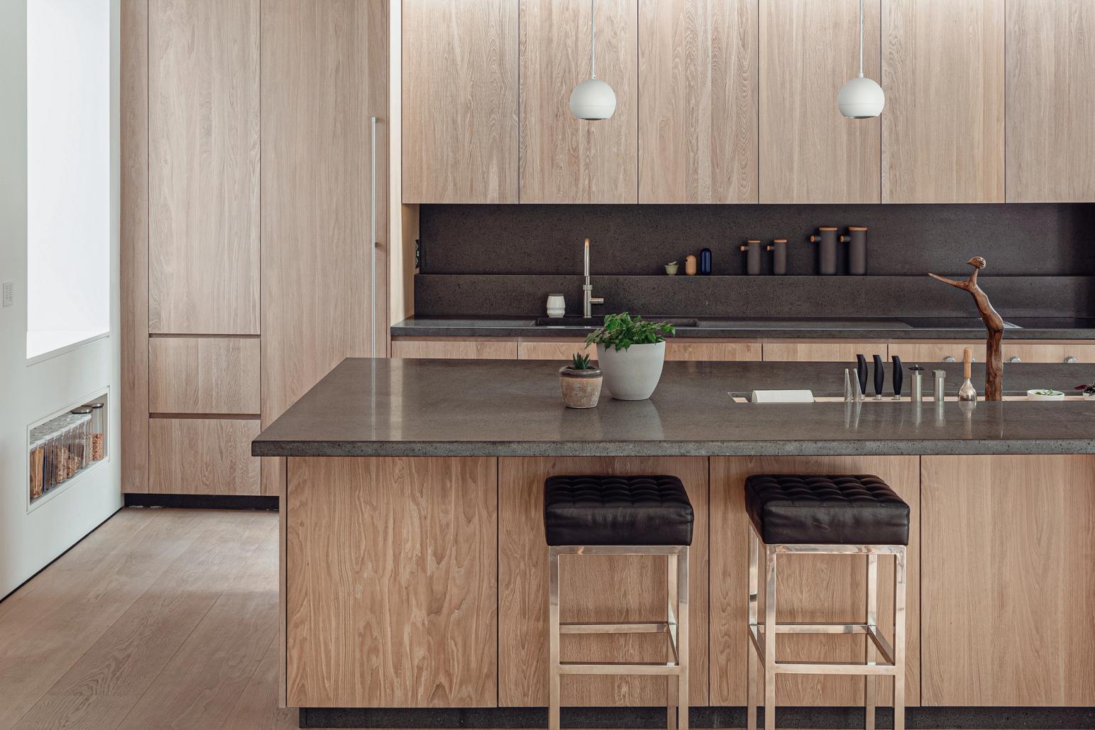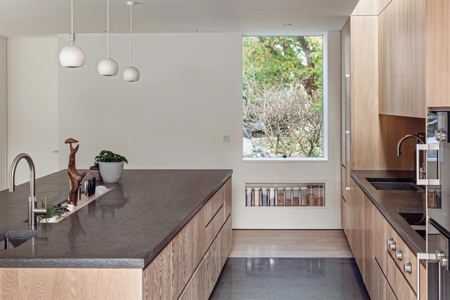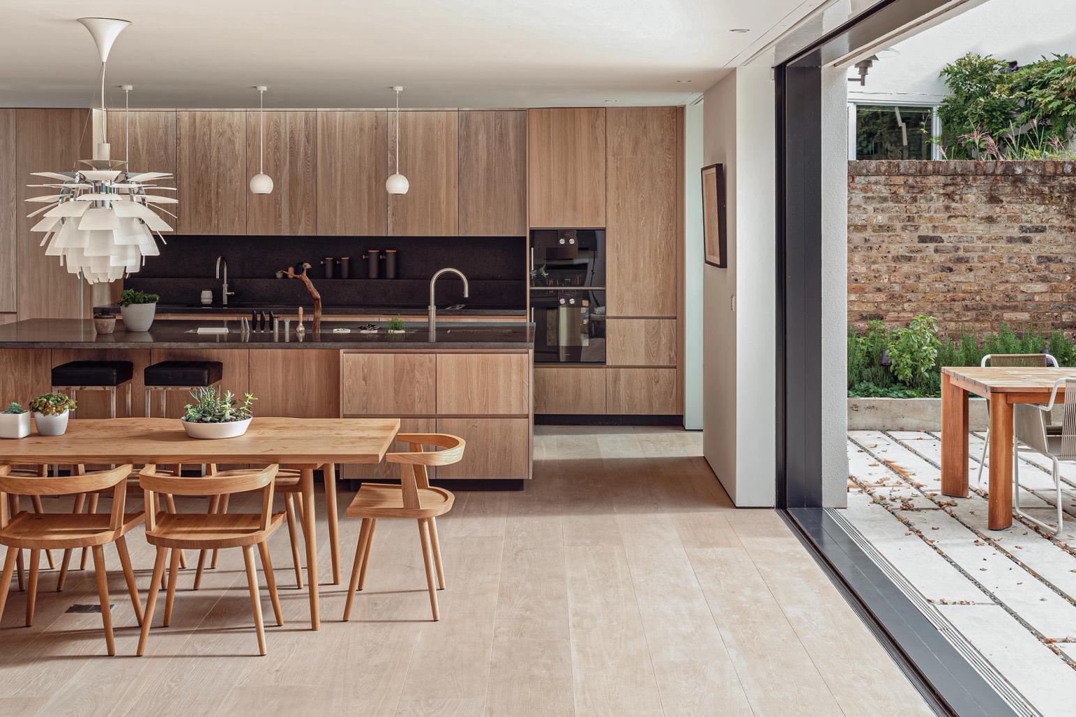 The designer's solution expertly emphasises the architectural lines of the space, featuring impressive expanses of solid oak outframe doors and drawers, handleless grooves, and a light and dark colour palette that enhance the room's dramatic play of light and shade. The wall-mounted cabinetry is set back from the main kitchen wall, allowing the sink, range cooker, and the beautiful woodgrain to be bathed in natural light from the letterbox-shaped lightwell above. Matching oak panels rise above the cabinets, lining the interior wall of the lightwell and drawing the eye upward, while a lava-stone splashback with a built-in shelf adds a dramatic contrast and subtly mirrors the dark metal frames of the garden doors.