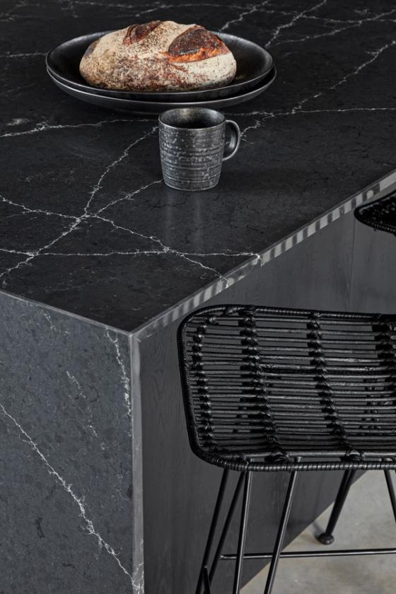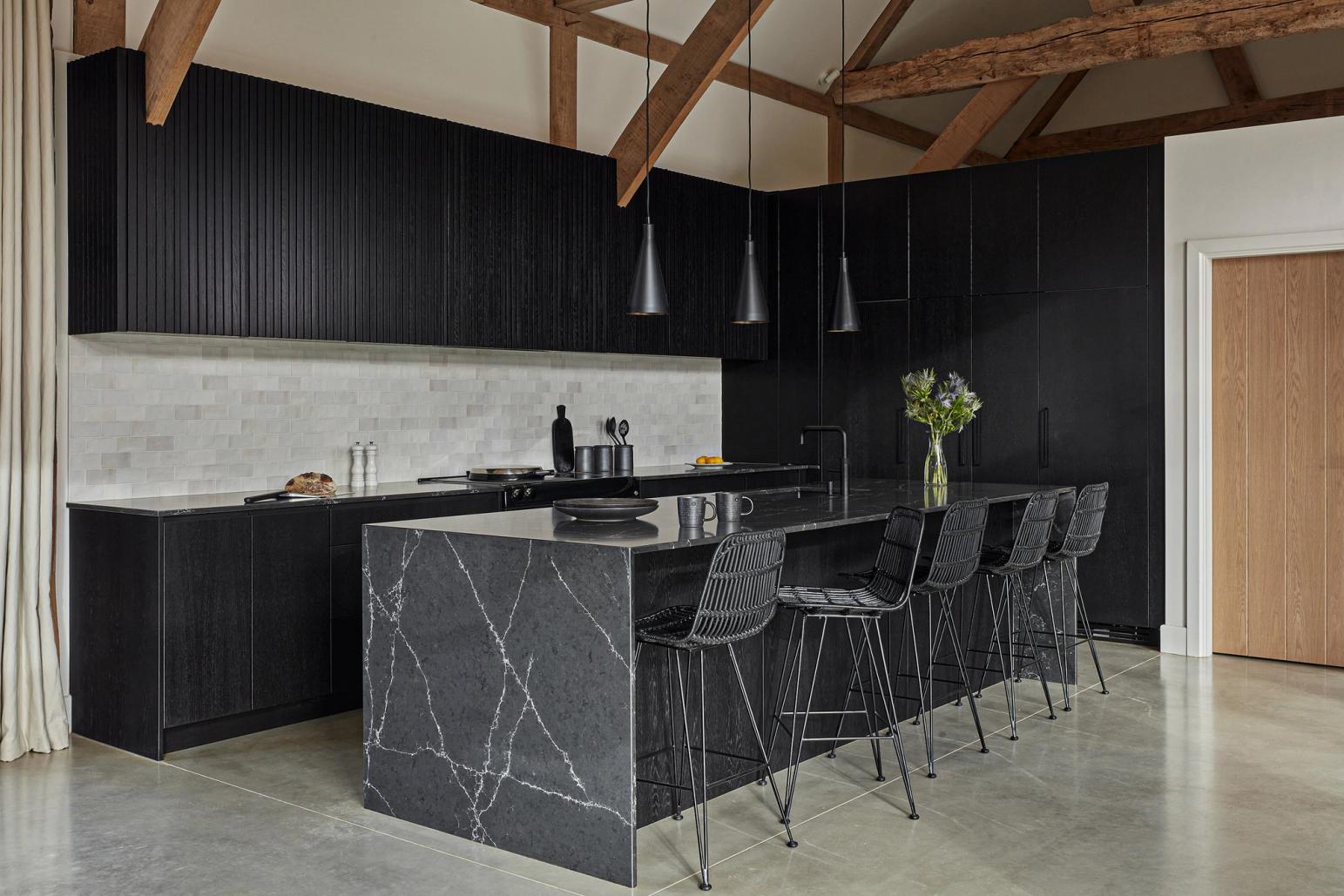 The designer's solution combines flat-fronted tall and base cabinets with a run of wall-mounted Skog cabinets, all in black. These cabinets were spray-painted rather than hand-painted, creating a lighter finish that showcases the wood grain and allows the slatted oak to contrast with the flat fronts, adding texture and preventing a harsh look. A lightly white-veined quartz with polished, mitred edges was selected for the waterfall island and worktops, while plain off-white tiles with an undulating mother-of-pearl effect add another layer of texture and movement to the design.