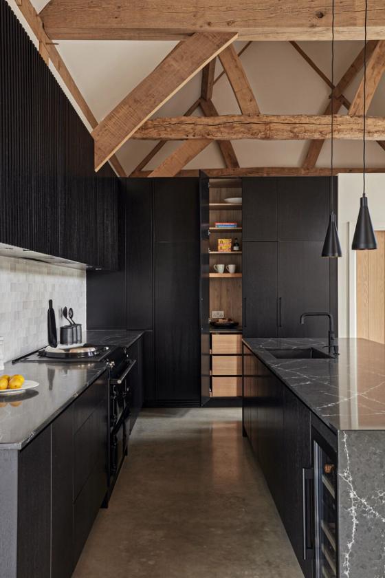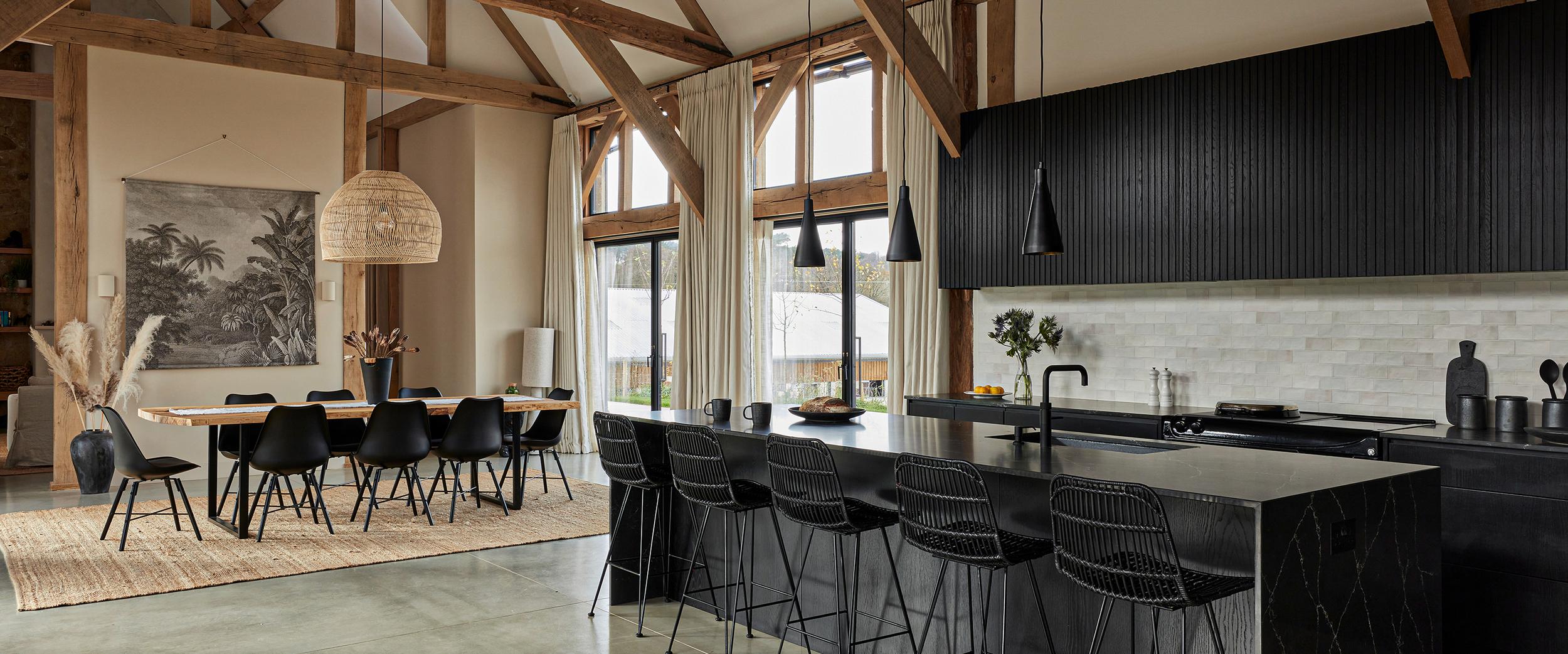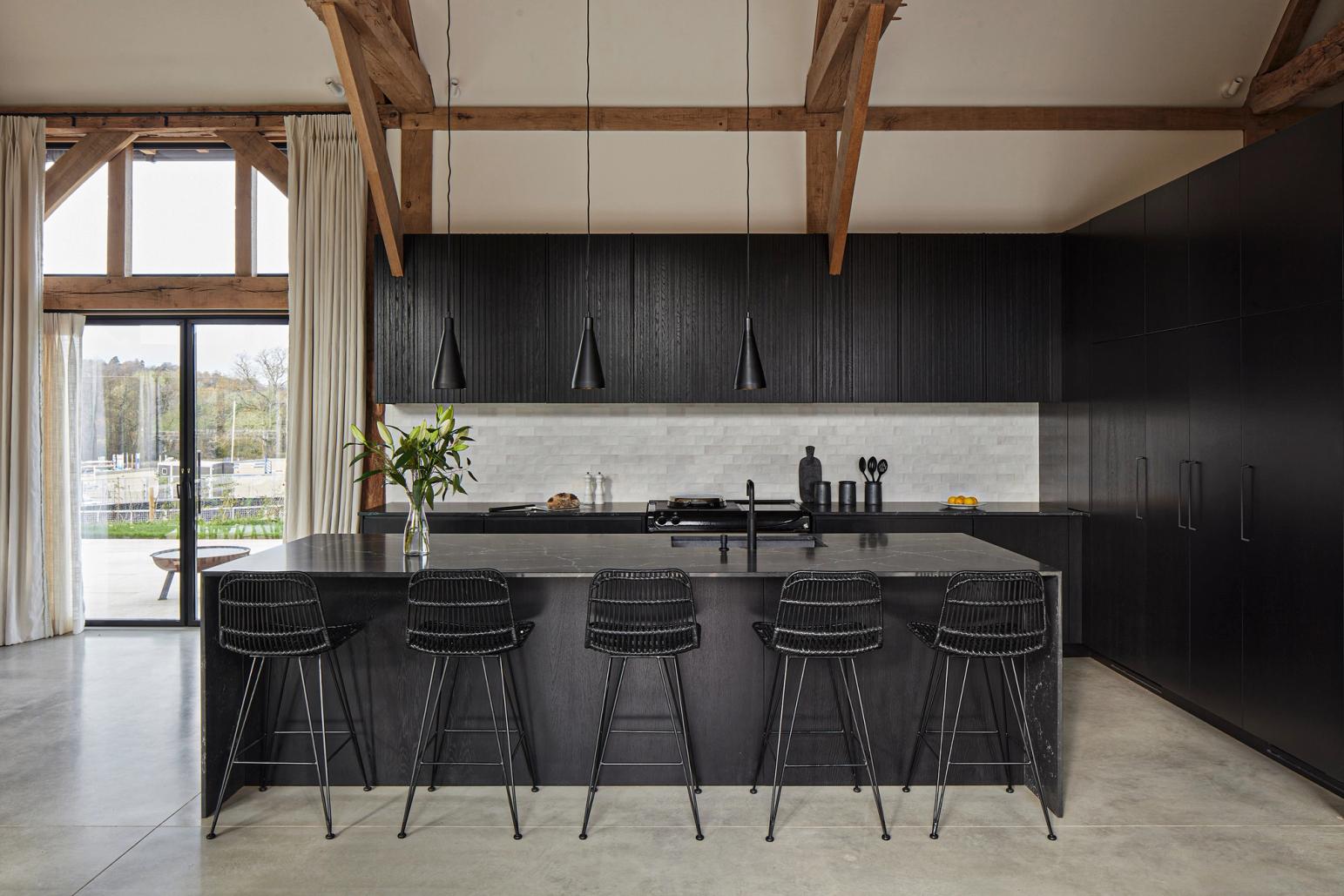 The clients envisioned placing the kitchen at the center of their beamed barn’s open-plan layout, with glazed bi-fold doors opening to the countryside at both the front and back of the house. While a separate walk-in pantry was being built behind the kitchen, they wanted ample storage within the kitchen itself to accommodate cooking paraphernalia, all with a contemporary look that would offset a black Aga. They preferred clear surfaces, with the sink positioned in the island to allow for views of the wider room and garden, rather than facing a wall. Having fallen in love with Sola Kitchen’s signature Skog style, they requested a very dark finish instead of natural oak, seeking a bold, modern contrast to the ancient timber structure without creating a stark effect.