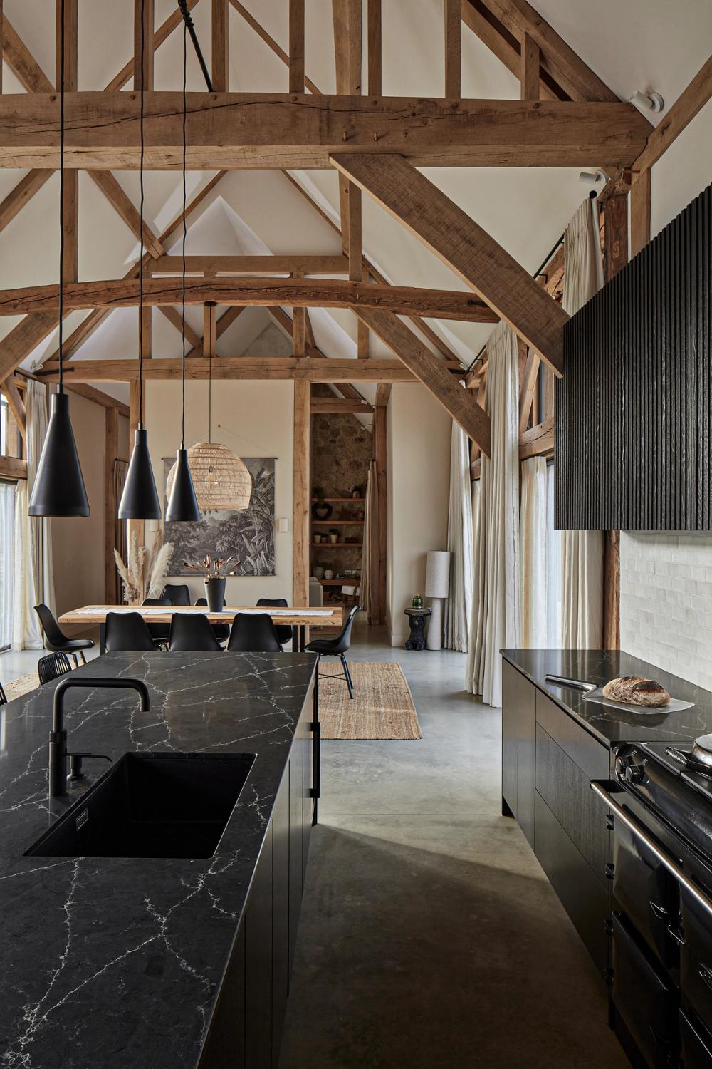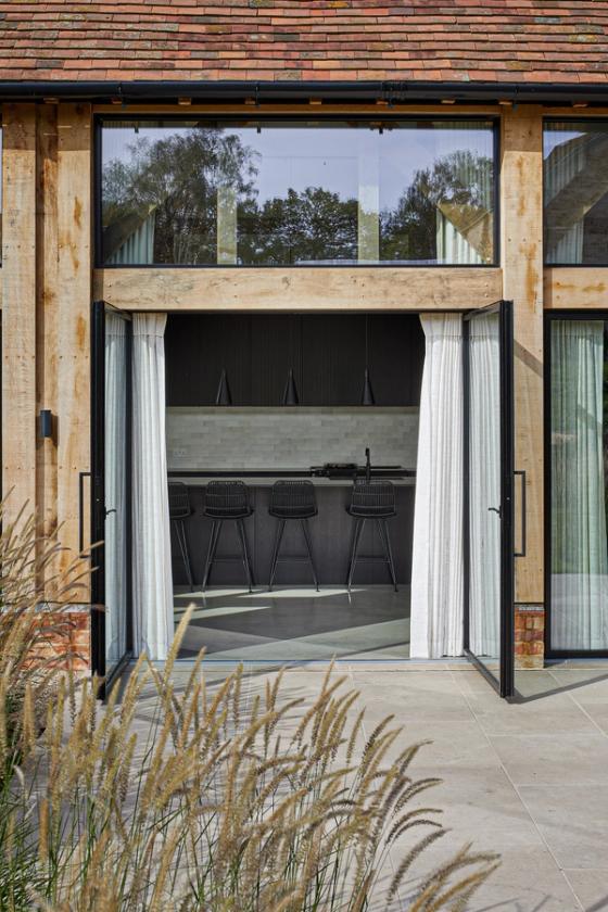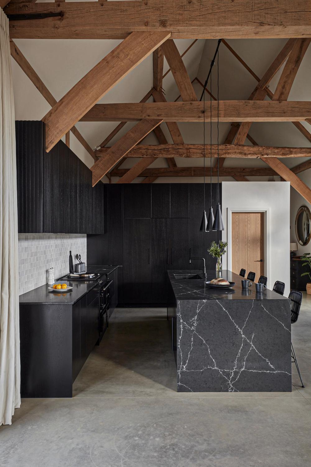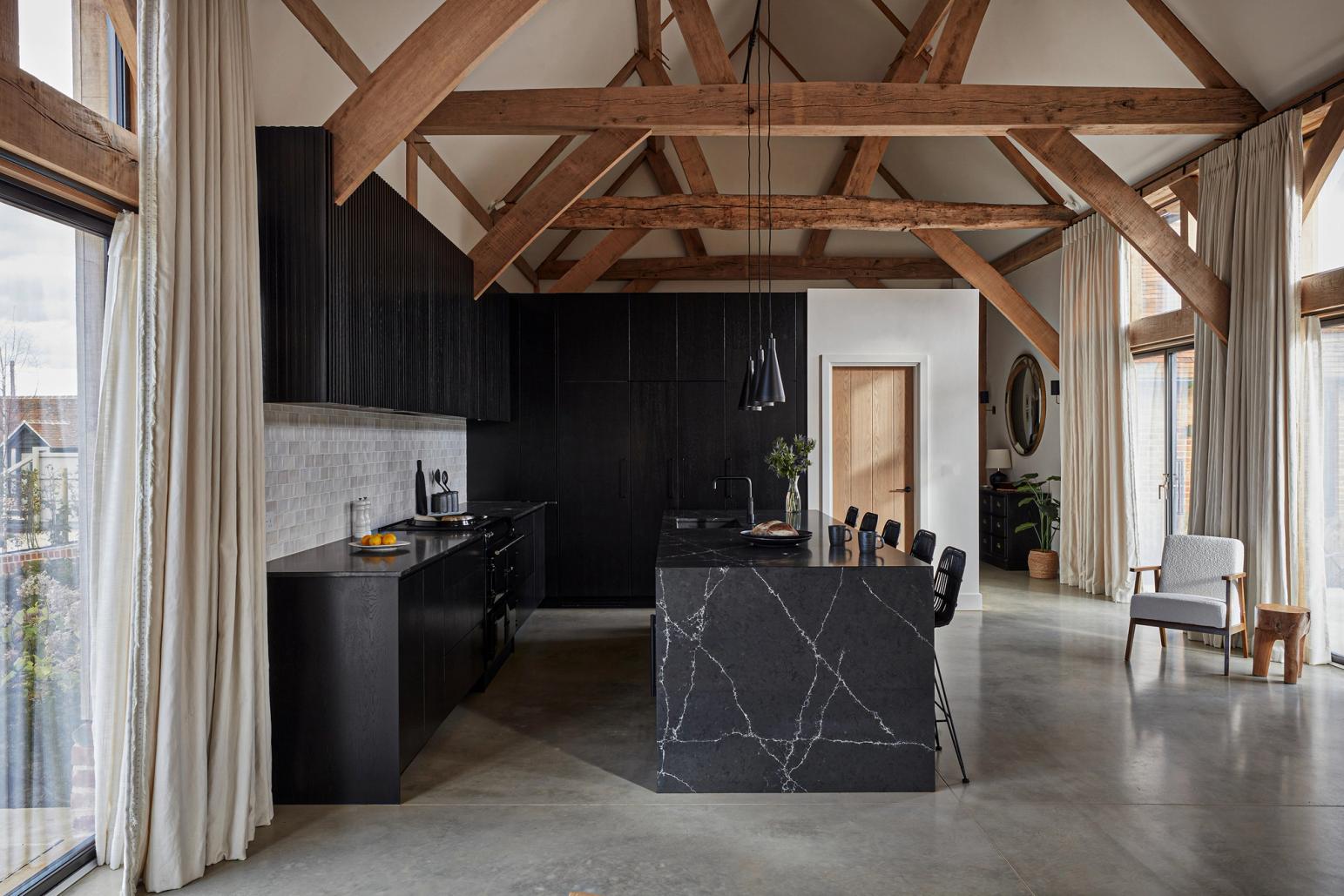 The clients envisioned placing the kitchen at the center of their beamed barn’s open-plan layout, with glazed bi-fold doors opening to the countryside at both the front and back of the house. While a separate walk-in pantry was being built behind the kitchen, they wanted ample storage within the kitchen itself to accommodate cooking paraphernalia, all with a contemporary look that would offset a black Aga. They preferred clear surfaces, with the sink positioned in the island to allow for views of the wider room and garden, rather than facing a wall. Having fallen in love with Sola Kitchen’s signature Skog style, they requested a very dark finish instead of natural oak, seeking a bold, modern contrast to the ancient timber structure without creating a stark effect.