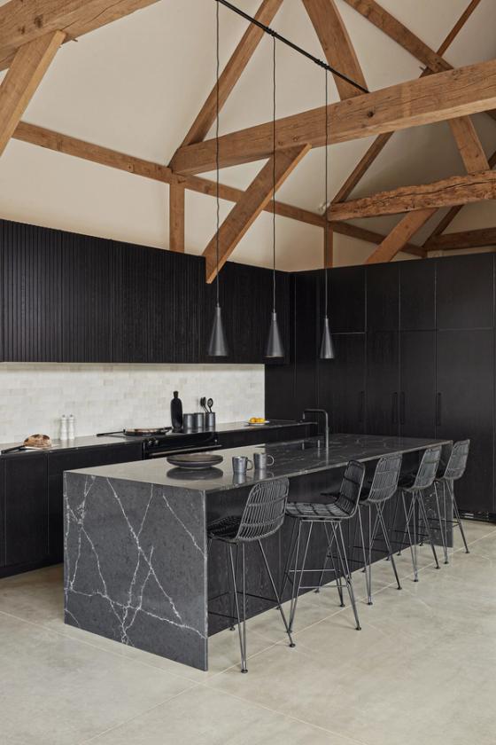 Finishing touches: the clients had originally wanted brass finishes for the fixtures and fittings but agreed with Sola Kitchen's suggestion that the effect might jar with the beams. Instead, they opted for plain black iron door furniture by Handle Påarp and a Quooker with a matte black finish.