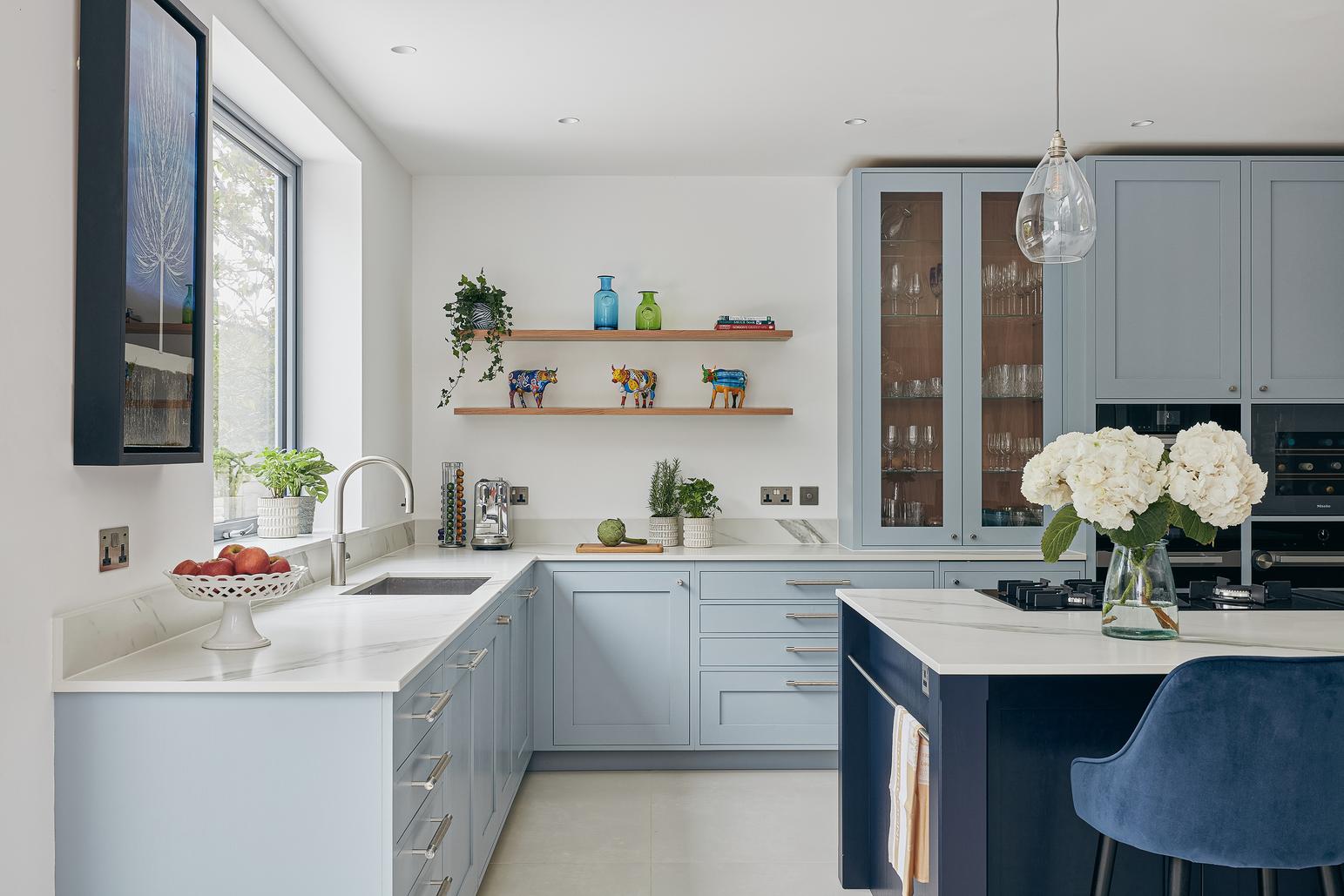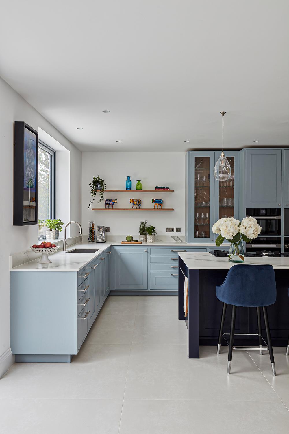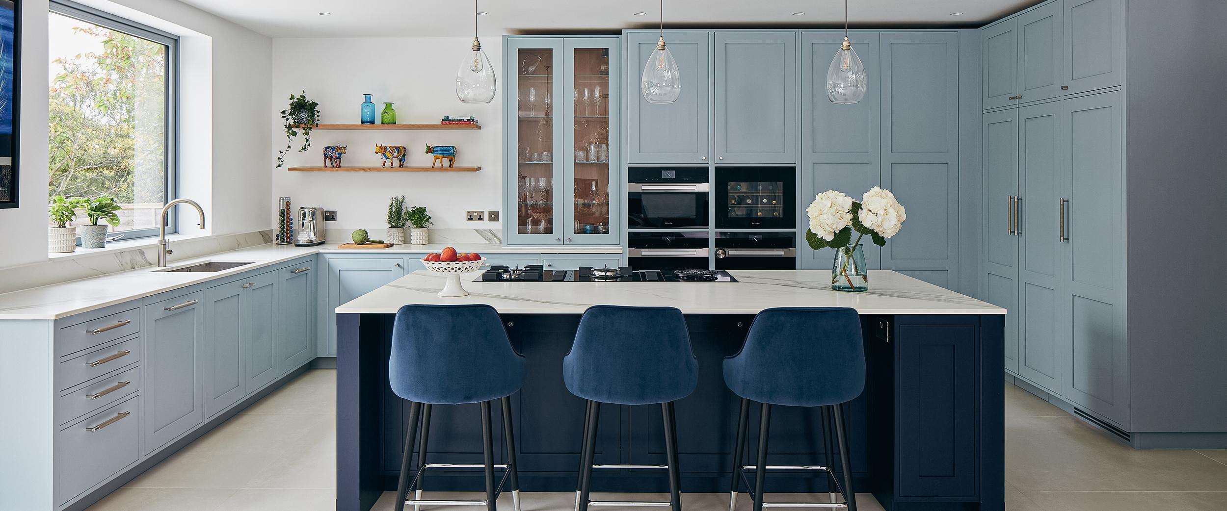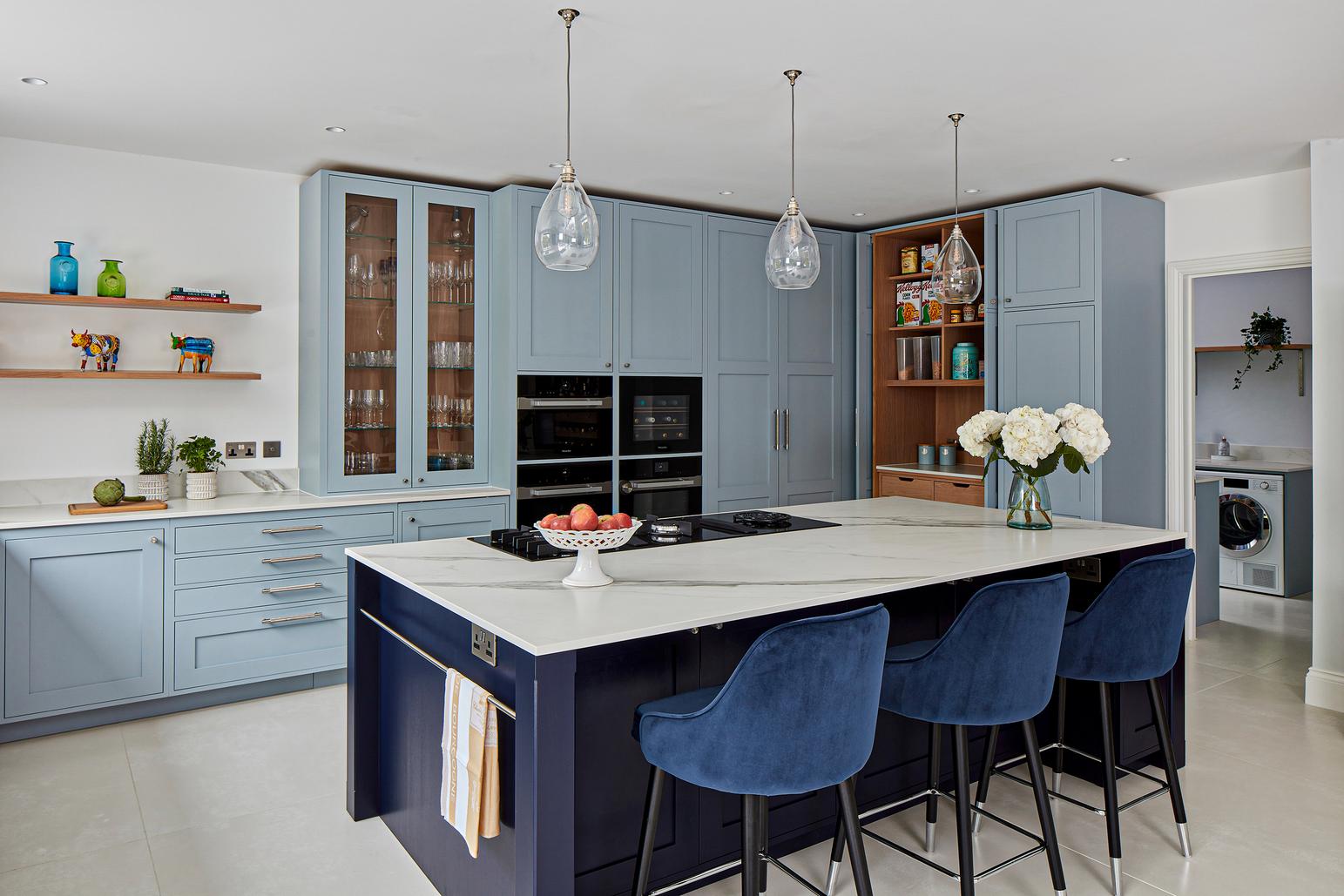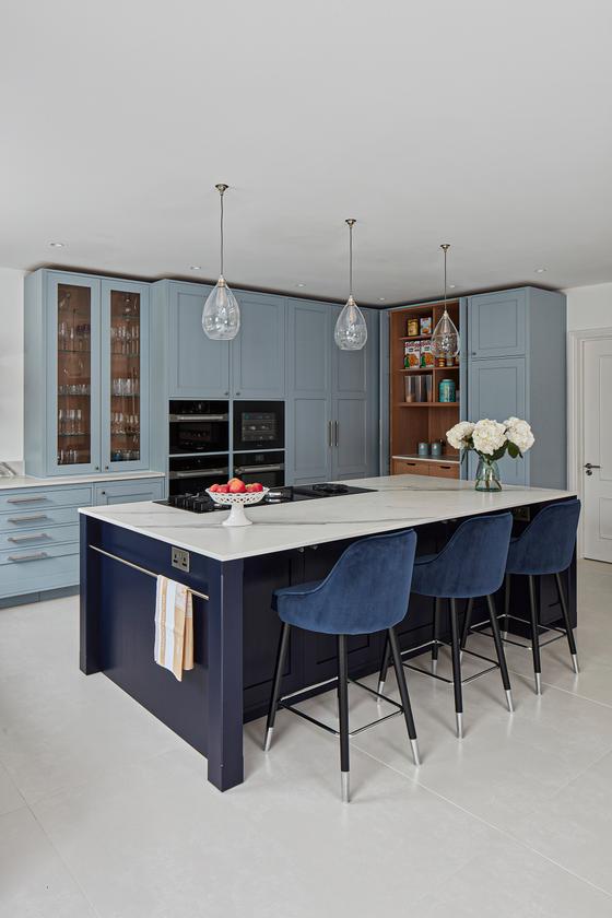 The designer's solution places a huge island at the heart of a U-shaped compilation of tall and base Shaker-style cabinets, with plenty of space to eat and carry on with family life well out of the way of anyone using the double stacks of Miele ovens or at the gas and induction dual fuel hob integrated on the blind side of the 2.7-metre-wide island. In the corner of the tall run of cabinets, which are painted in Bone China Blue by Little Green, are two double-fronted larders – Sola Kitchen's classic breakfast pantry with racked shelving on the insides of the doors, and a second standing beside it that is fitted with pocket doors to avoid door clashes- and all the drawers beneath the Dekton worktops are bespoke designed to fit the client's possessions precisely.