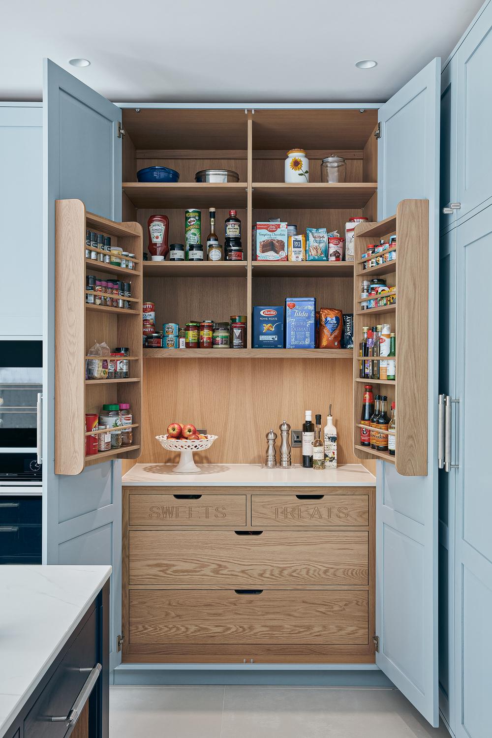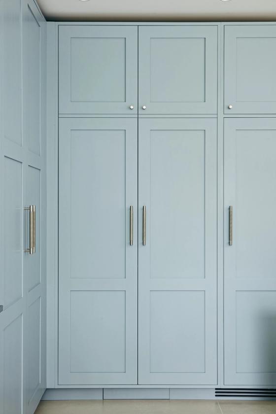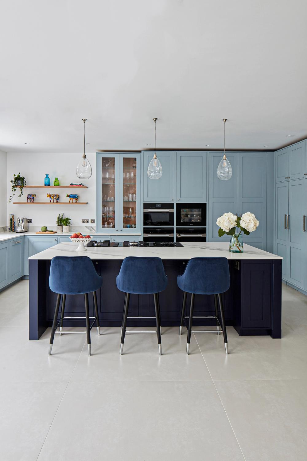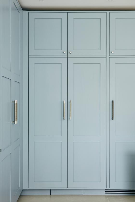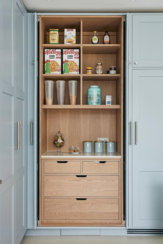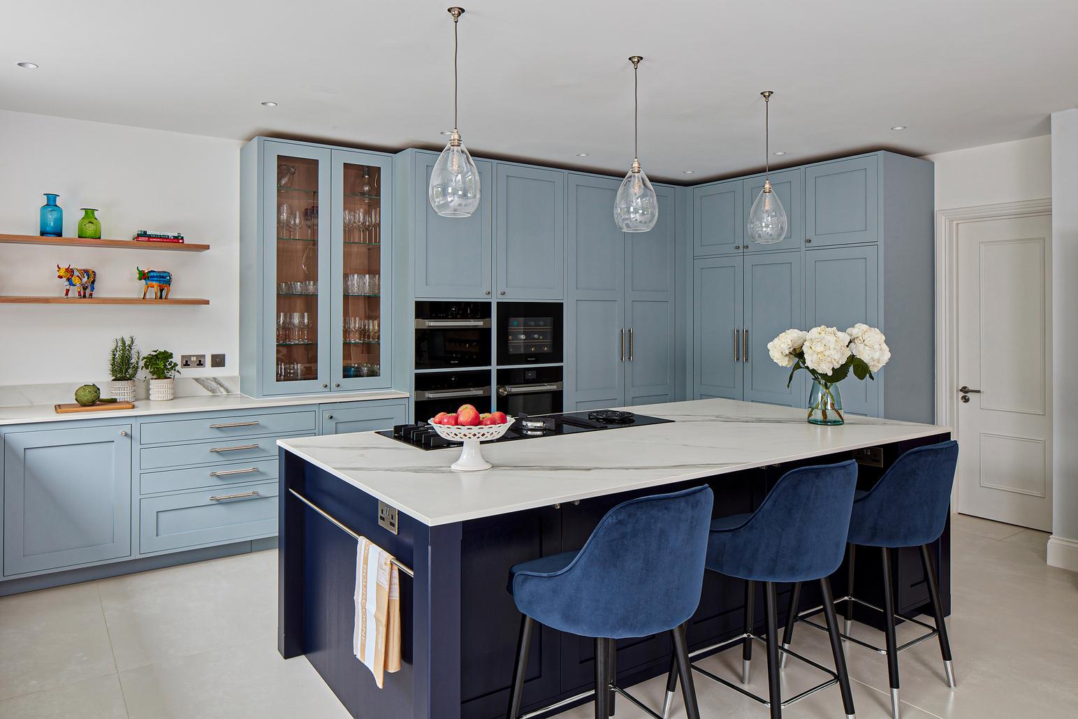 The designer's solution places a huge island at the heart of a U-shaped compilation of tall and base Shaker-style cabinets, with plenty of space to eat and carry on with family life well out of the way of anyone using the double stacks of Miele ovens or at the gas and induction dual fuel hob integrated on the blind side of the 2.7-metre-wide island. In the corner of the tall run of cabinets, which are painted in Bone China Blue by Little Green, are two double-fronted larders – Sola Kitchen's classic breakfast pantry with racked shelving on the insides of the doors, and a second standing beside it that is fitted with pocket doors to avoid door clashes- and all the drawers beneath the Dekton worktops are bespoke designed to fit the client's possessions precisely.