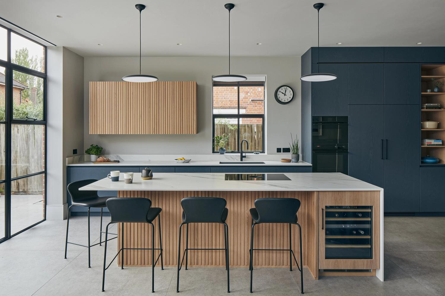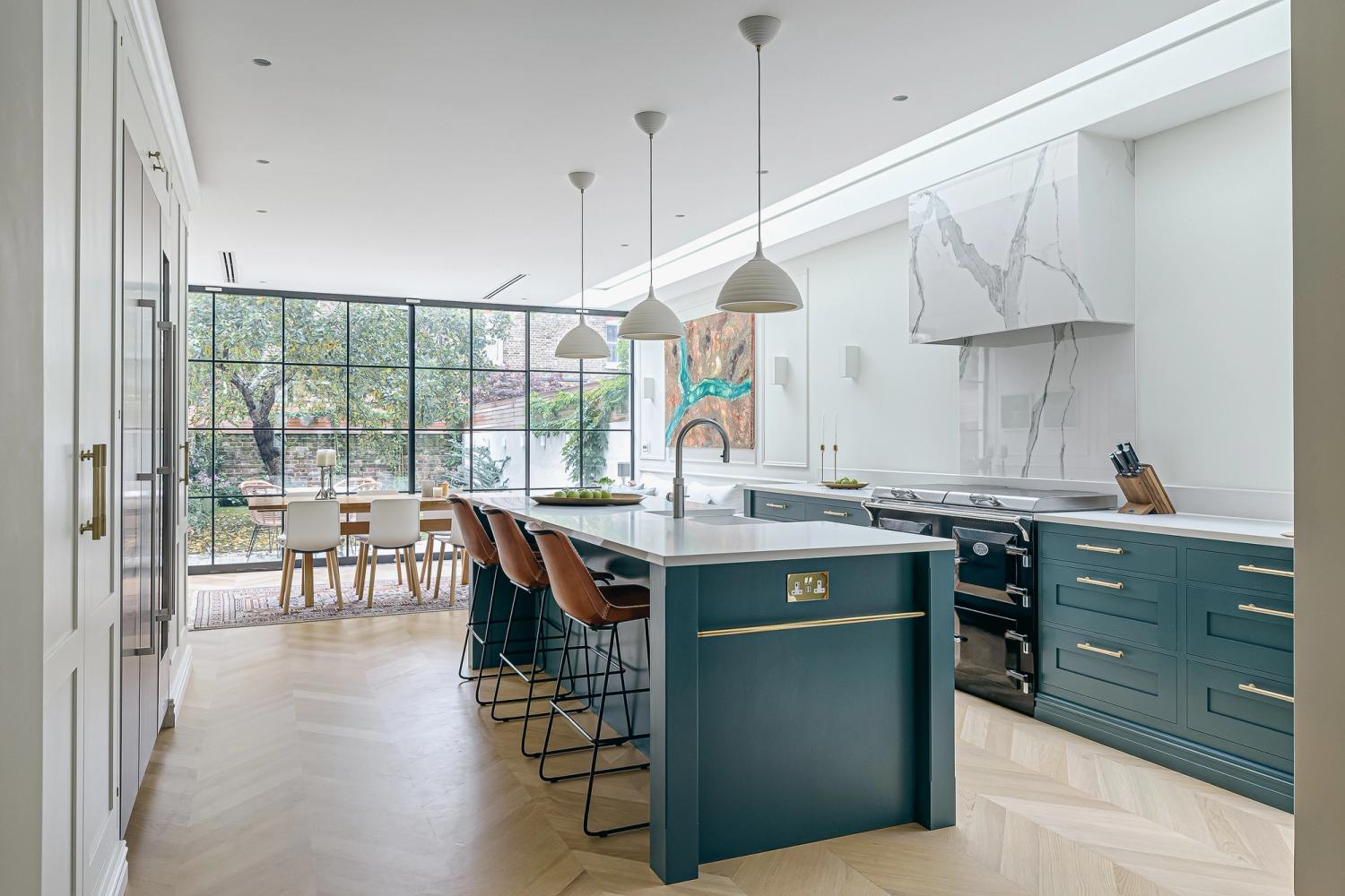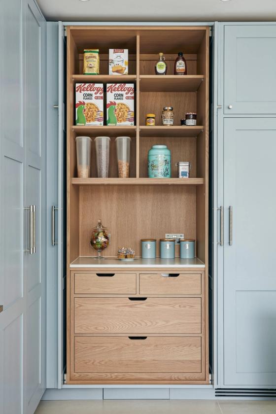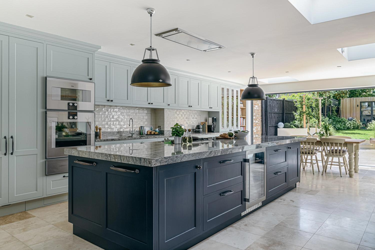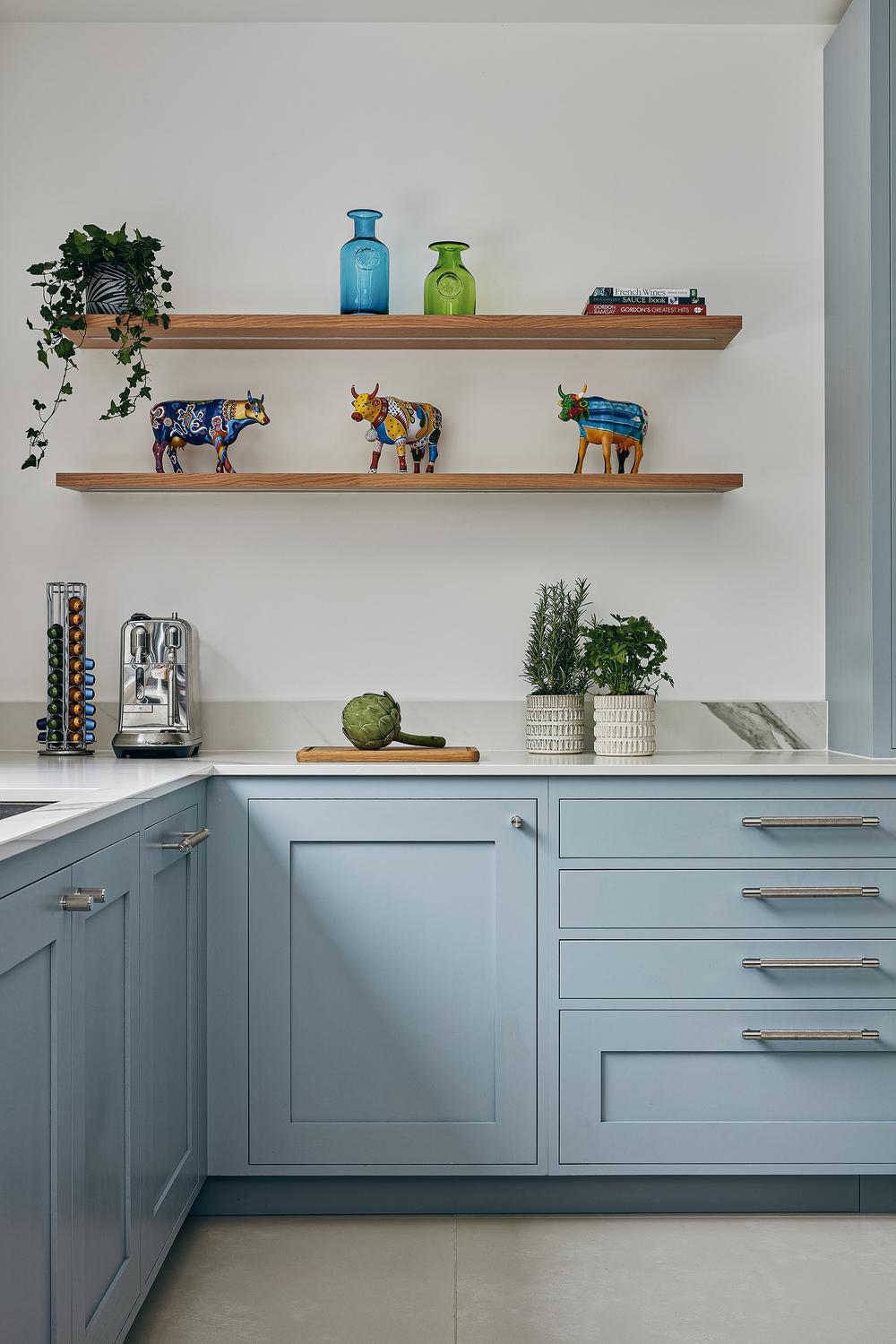 The designer's solution places a huge island at the heart of a U-shaped compilation of tall and base Shaker-style cabinets, with plenty of space to eat and carry on with family life well out of the way of anyone using the double stacks of Miele ovens or at the gas and induction dual fuel hob integrated on the blind side of the 2.7-metre-wide island. In the corner of the tall run of cabinets, which are painted in Bone China Blue by Little Green, are two double-fronted larders – Sola Kitchen's classic breakfast pantry with racked shelving on the insides of the doors, and a second standing beside it that is fitted with pocket doors to avoid door clashes- and all the drawers beneath the Dekton worktops are bespoke designed to fit the client's possessions precisely.