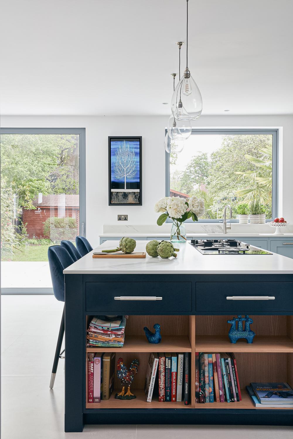 Finishing touches: while the end of the island nearest the sink is fitted with a useful towel rail, at the other end, a bookshelf has been built into the base, which is painted in Dock Blue by Little Green. One of the two drawers above it is where the takeaway menus are kept.