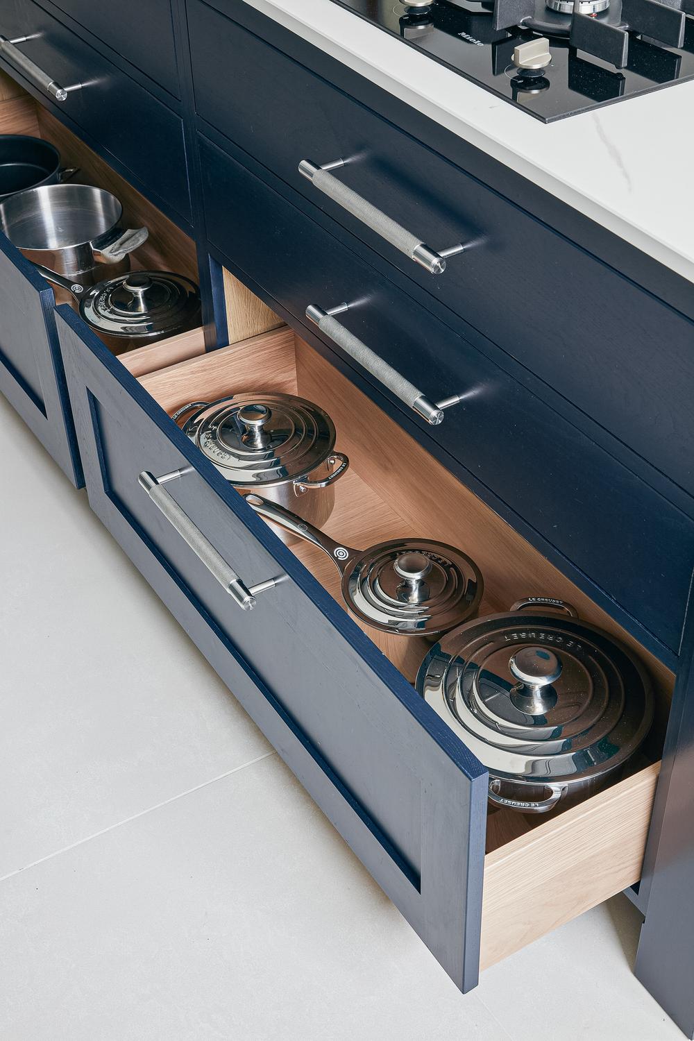 A home for everything: every inch of space has been given a useful function - the corner base cabinet beside the sink is fitted with swing-out shelves for baking paraphernalia and ovenware, for instance, while pots for the hob are stored in the island.