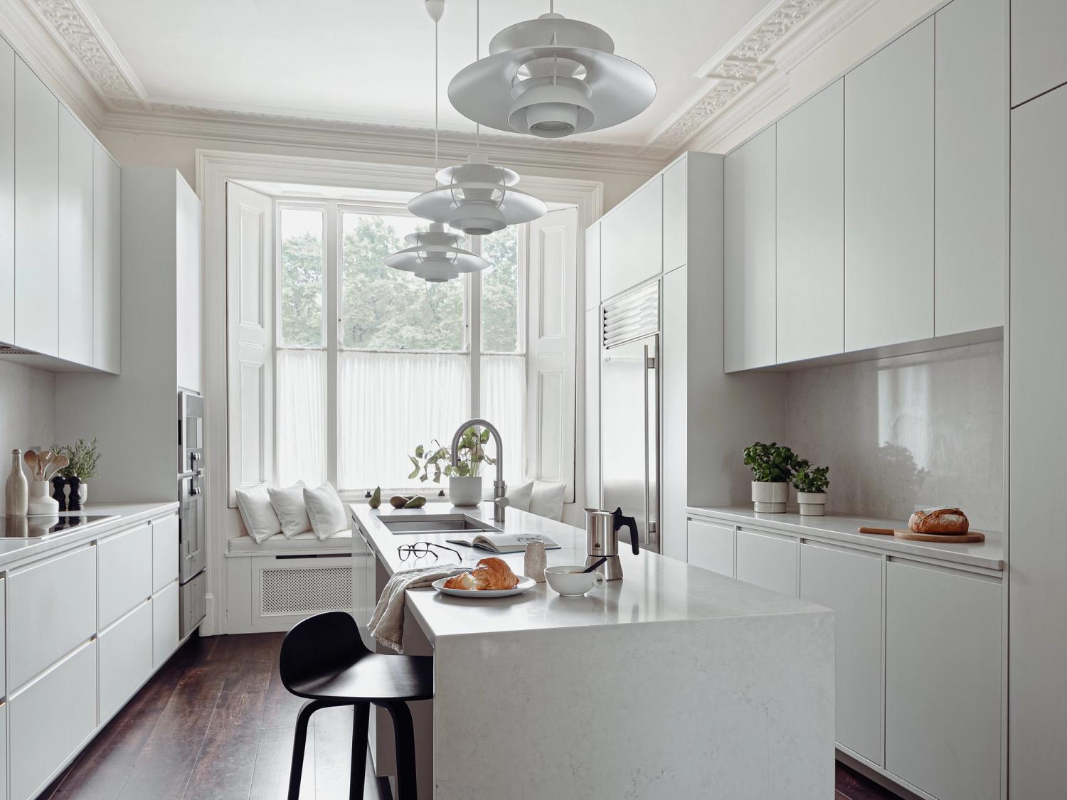 On your metal: the stainless-steel hooded extraction system above the Rangemaster was preferred over a downdraft one for its industrial appearance and is complimented perfectly by the Dekton stone splashback and upstand to protect the brickwork.