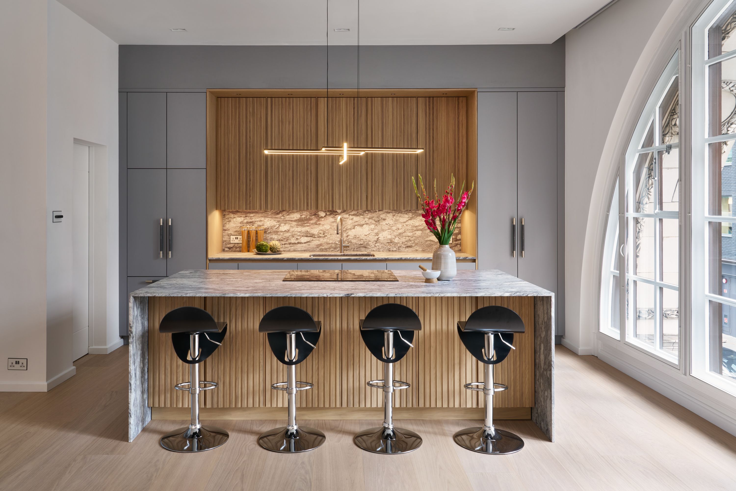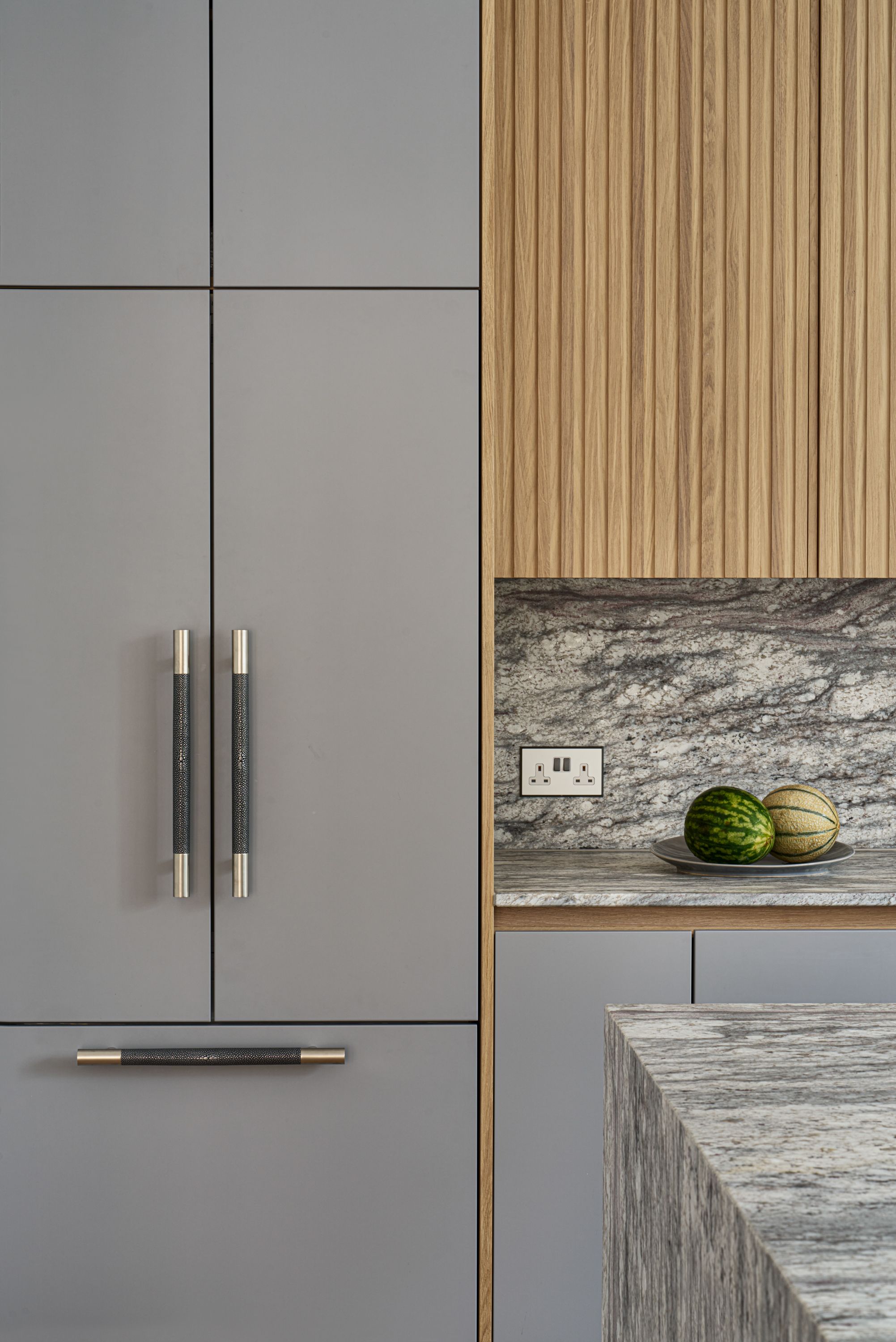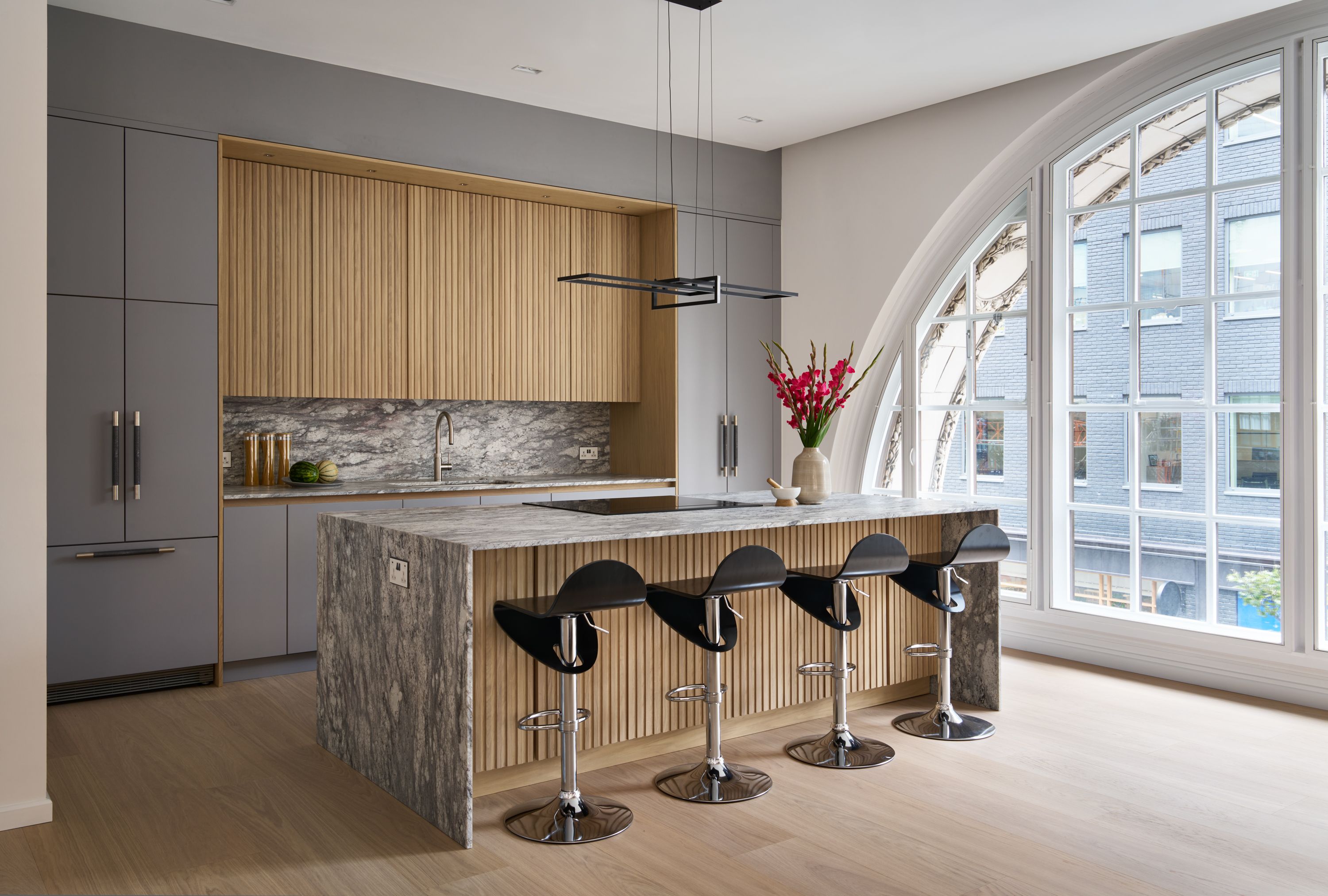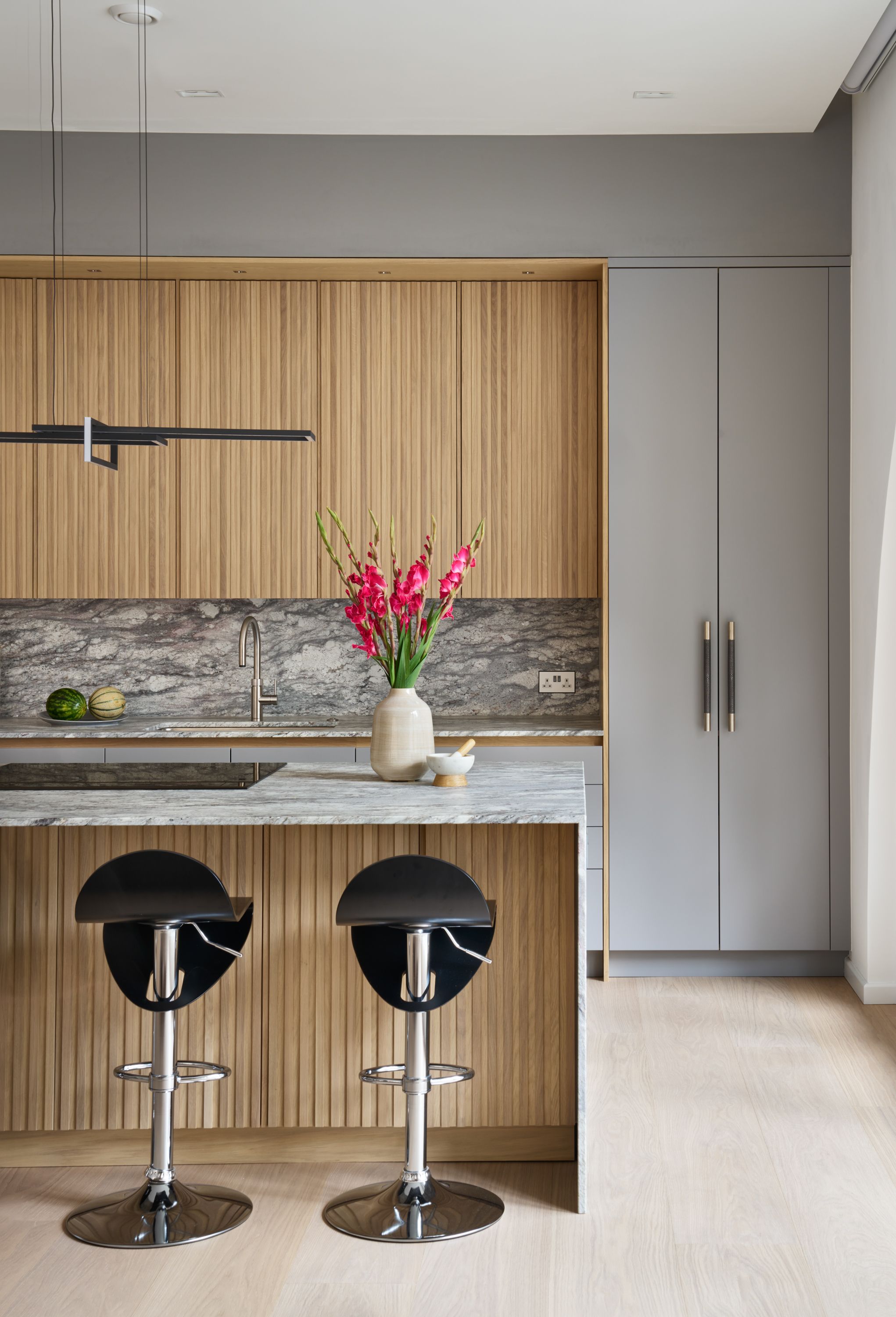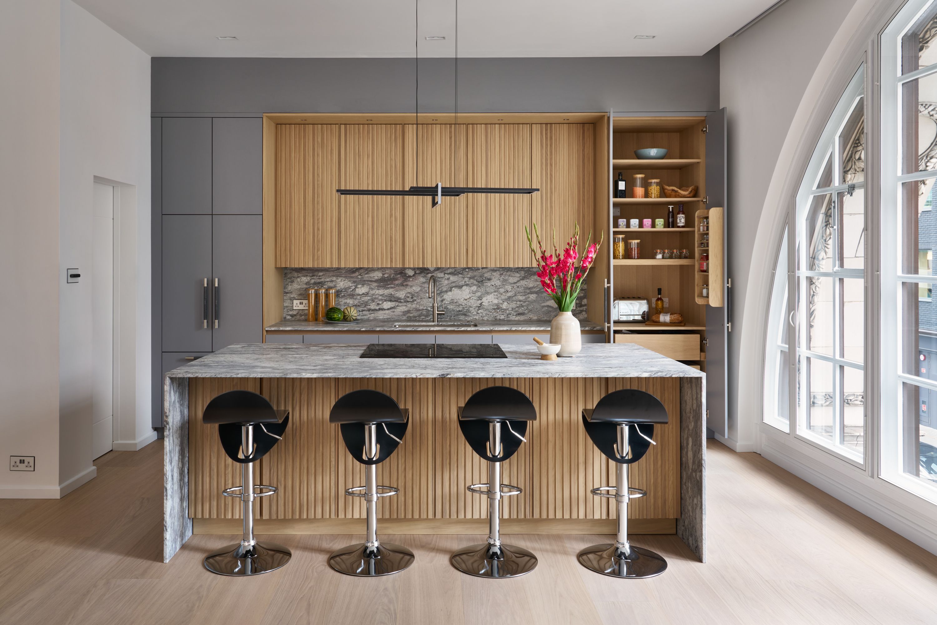 The designer's solution uses a flat-fronted design in mdf and spray-painted grey with Skog cabinetry in white-pigmented oak, to add warmth and texture, and a magnificent stone waterfall island. The designer took the size of the fridge as her starting point and designed the pantry to match it, with the sizes of the rest of the cabinetry and the size and position of the island following on thereafter. As the existing plumbing could not be adjusted, the sink had to be positioned in the wall run, and to satisfy the owner's desire for perfect symmetry, the hob and undercounter side-by-side ovens were positioned directly opposite, in the island.