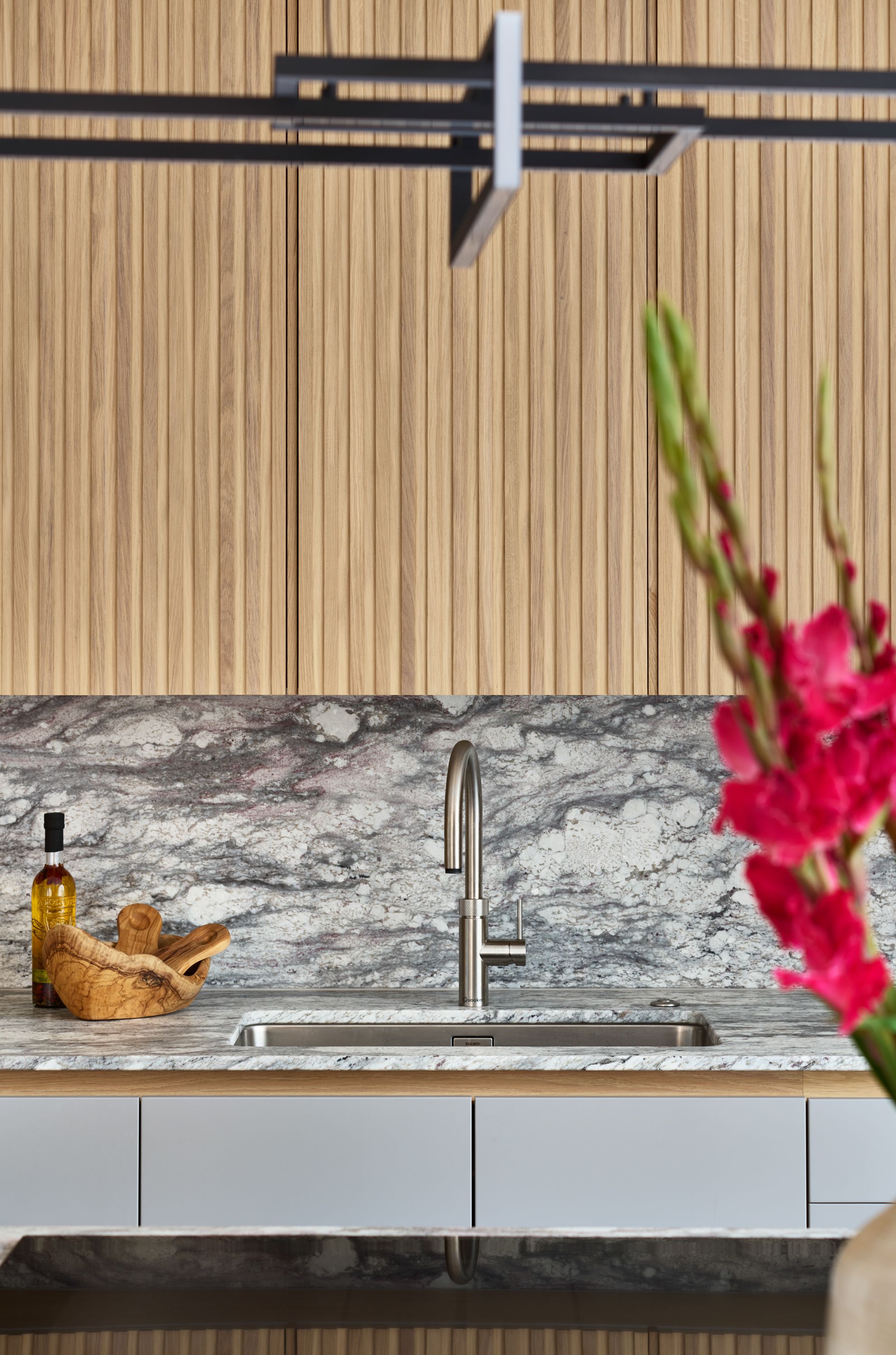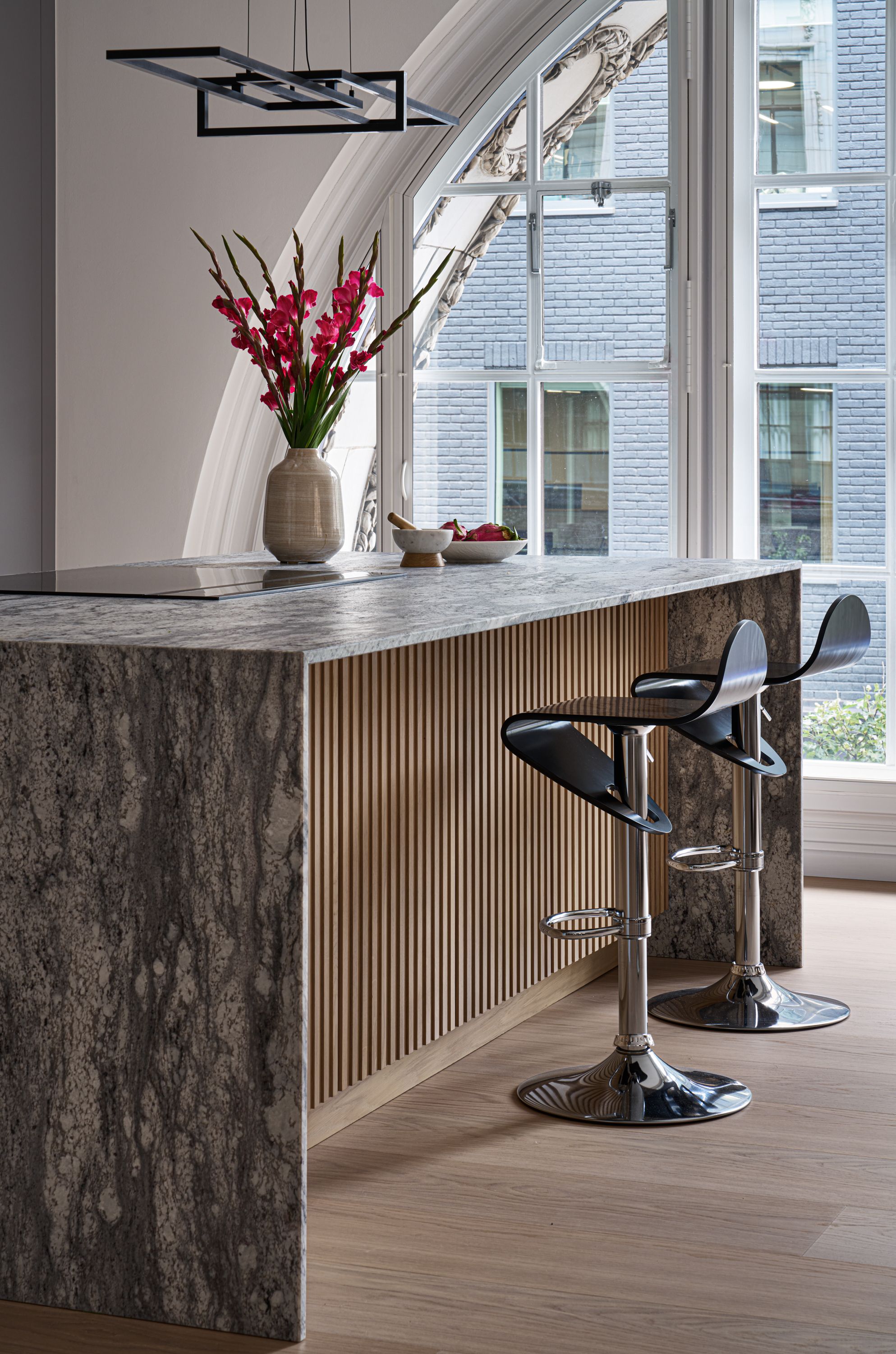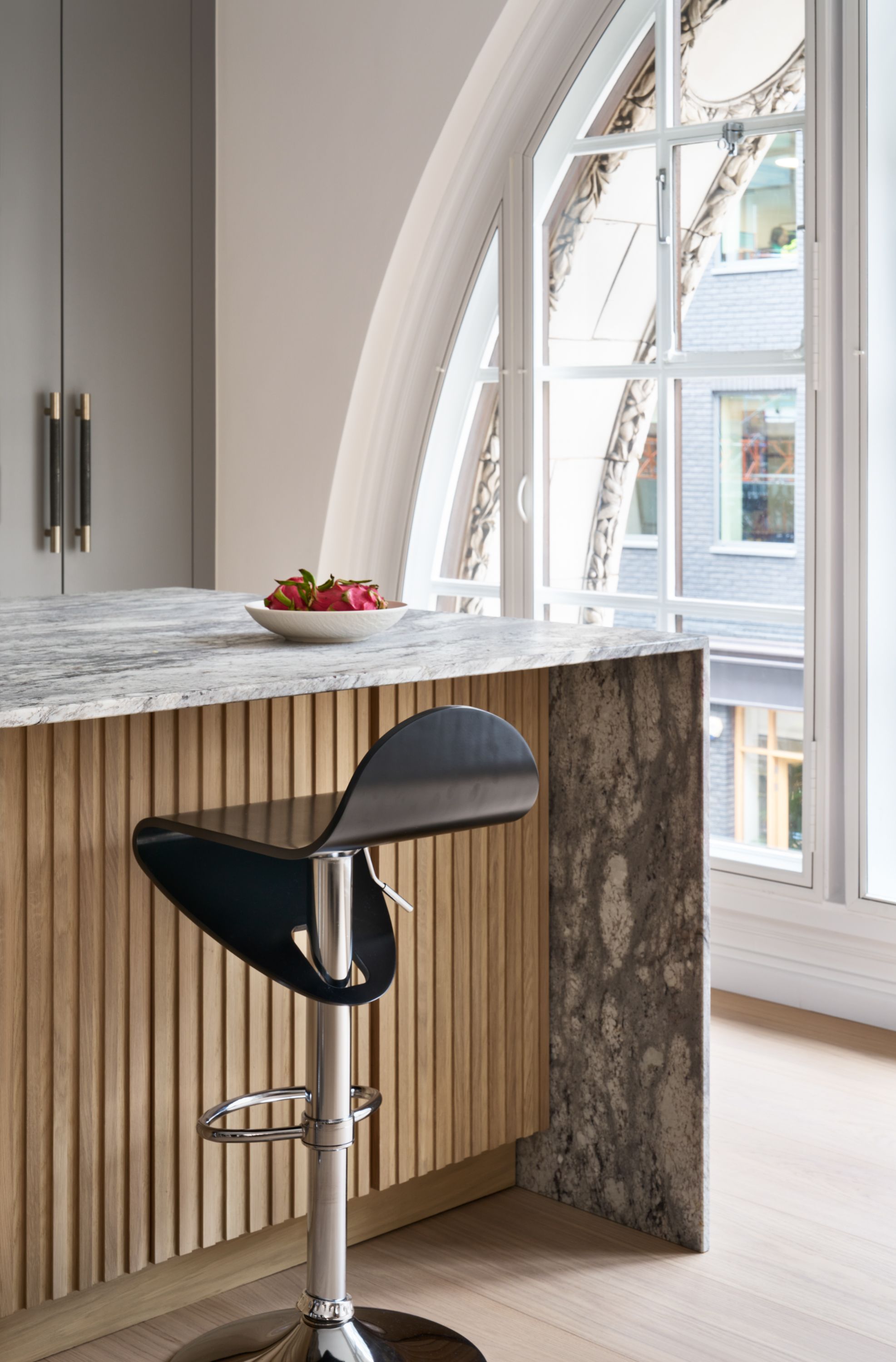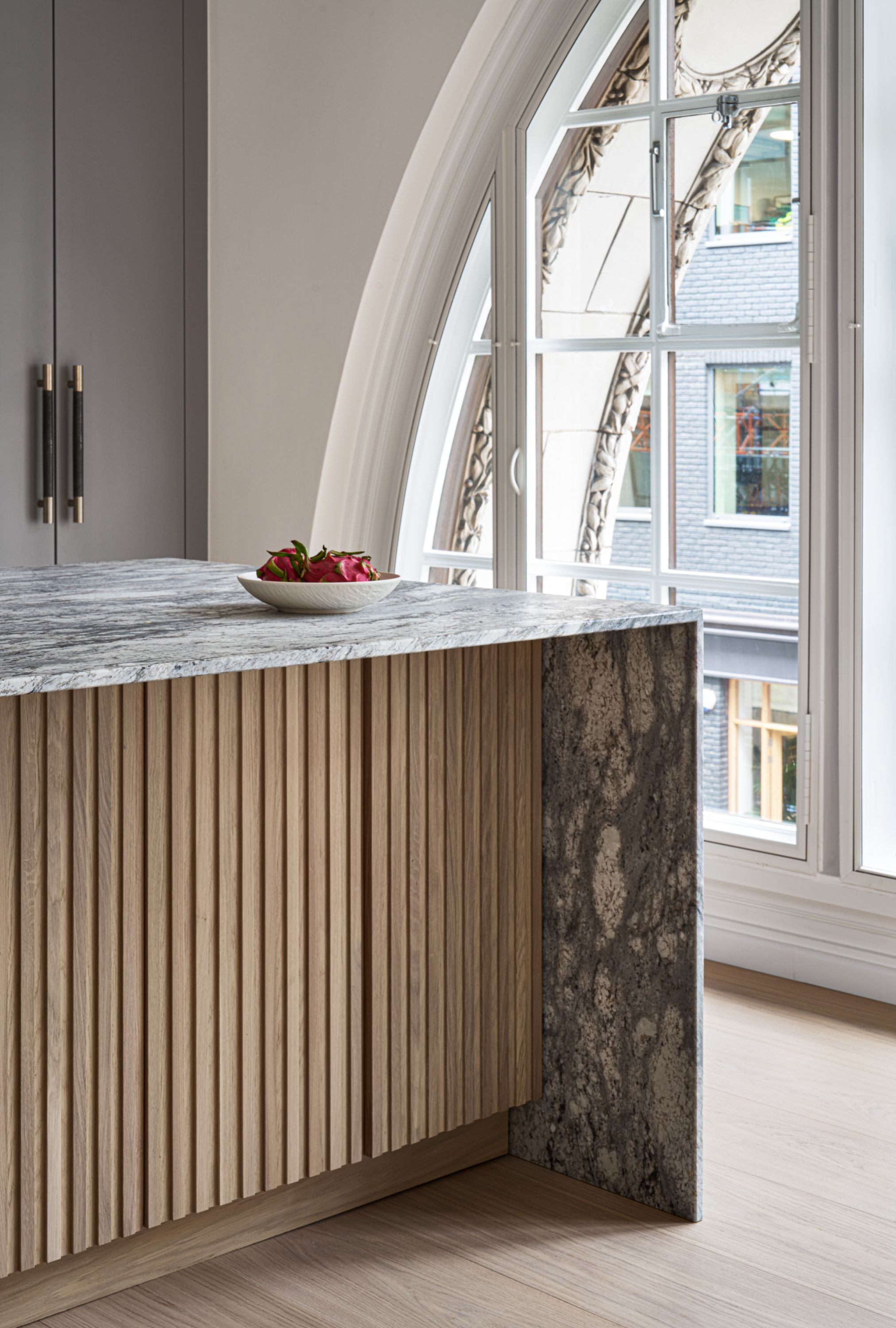 The designer's solution uses a flat-fronted design in mdf and spray-painted grey with Skog cabinetry in white-pigmented oak, to add warmth and texture, and a magnificent stone waterfall island. The designer took the size of the fridge as her starting point and designed the pantry to match it, with the sizes of the rest of the cabinetry and the size and position of the island following on thereafter. As the existing plumbing could not be adjusted, the sink had to be positioned in the wall run, and to satisfy the owner's desire for perfect symmetry, the hob and undercounter side-by-side ovens were positioned directly opposite, in the island.