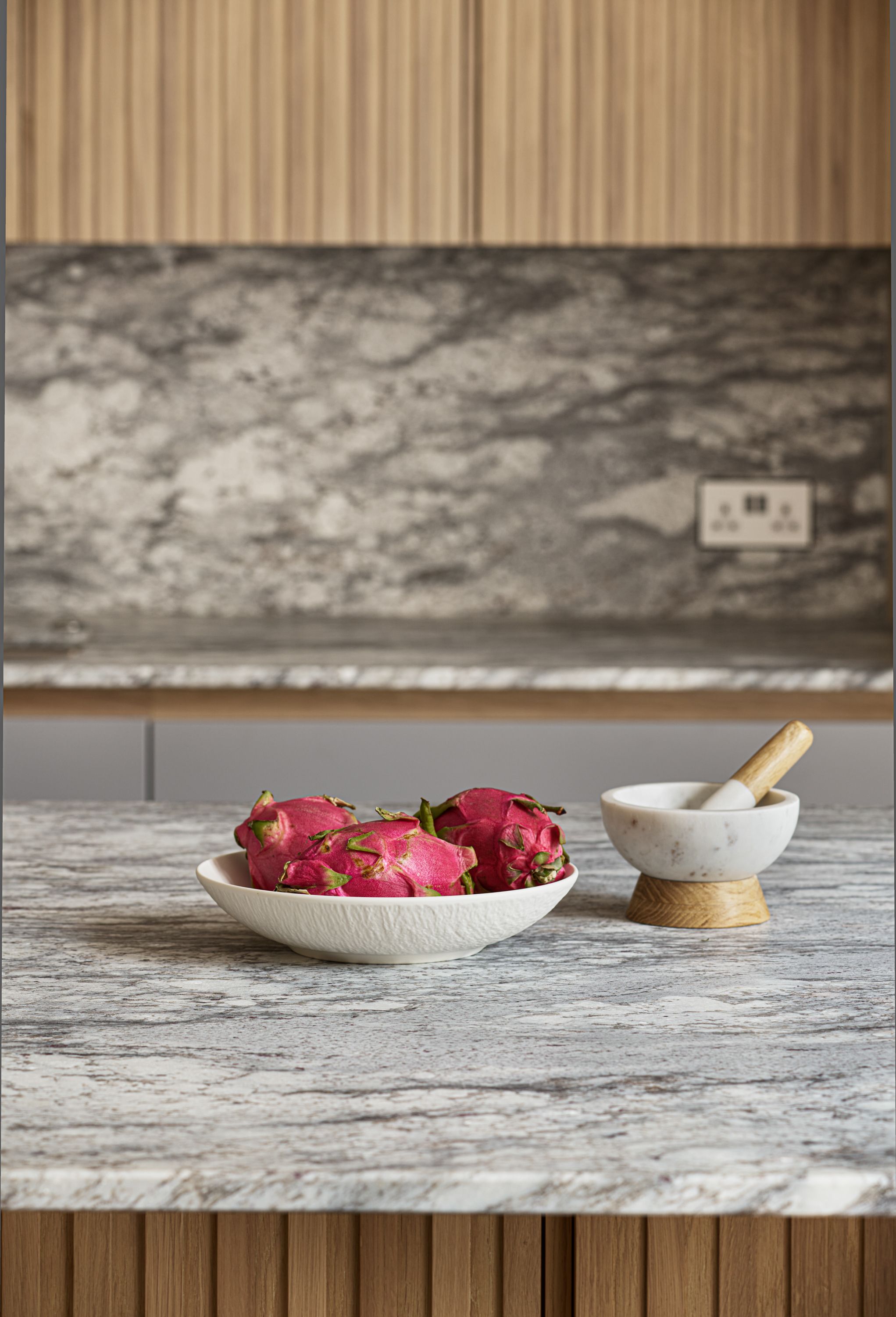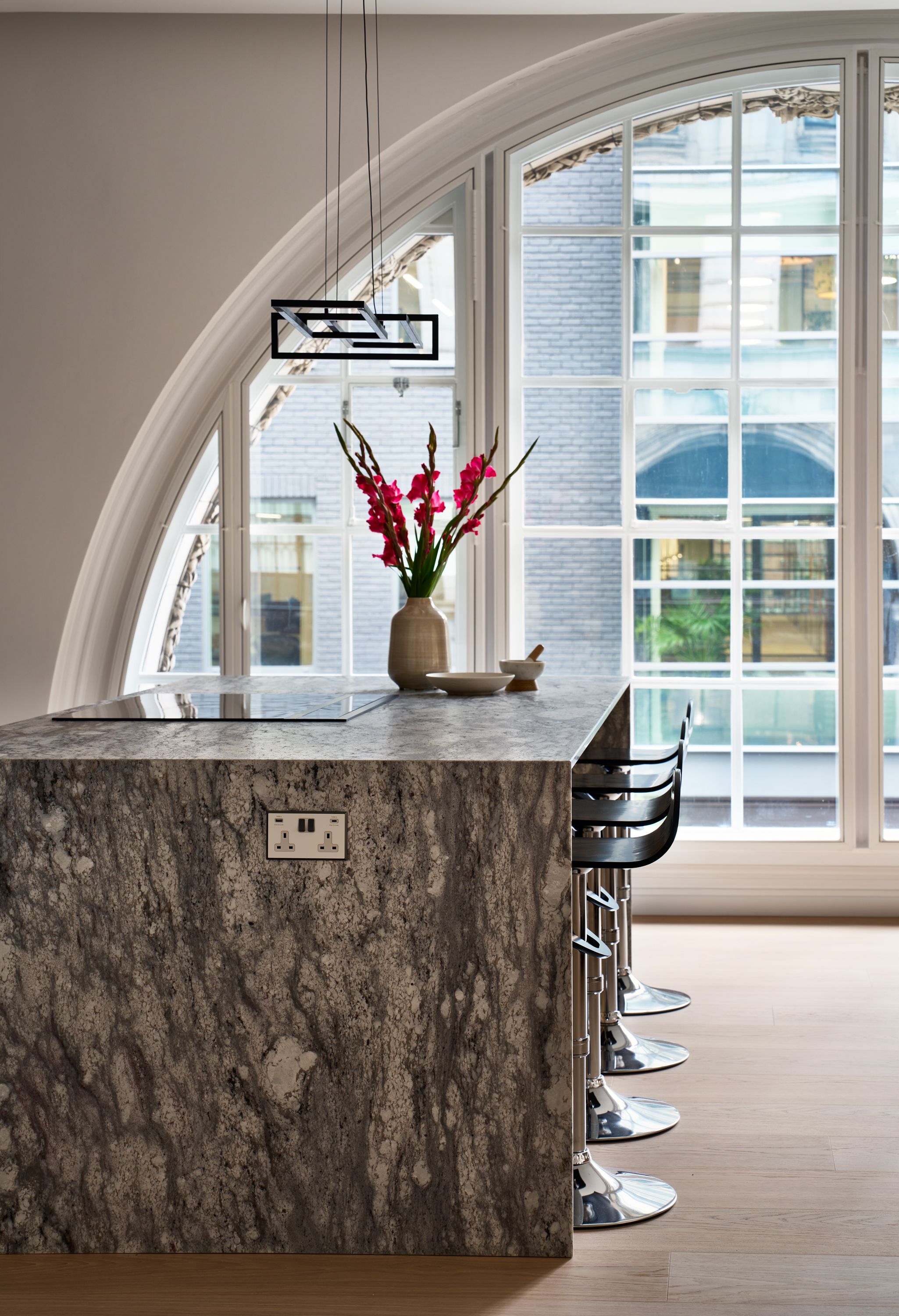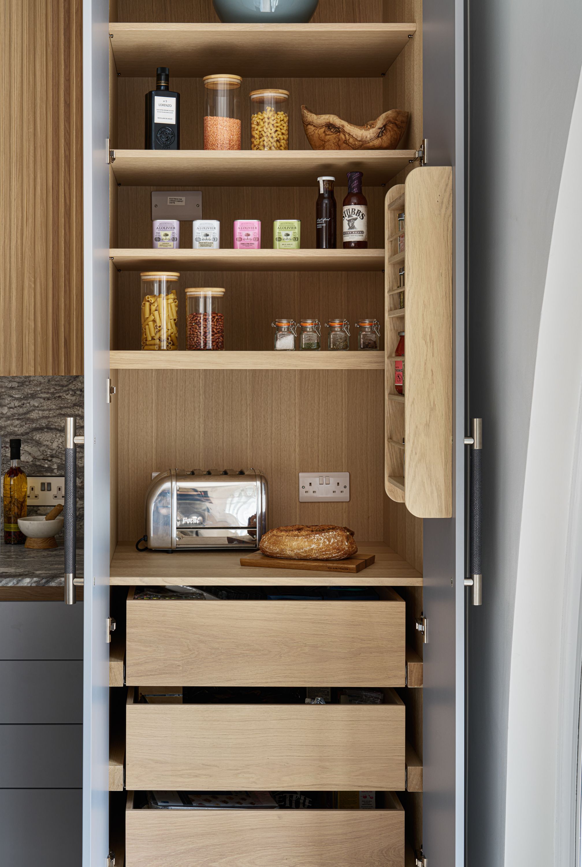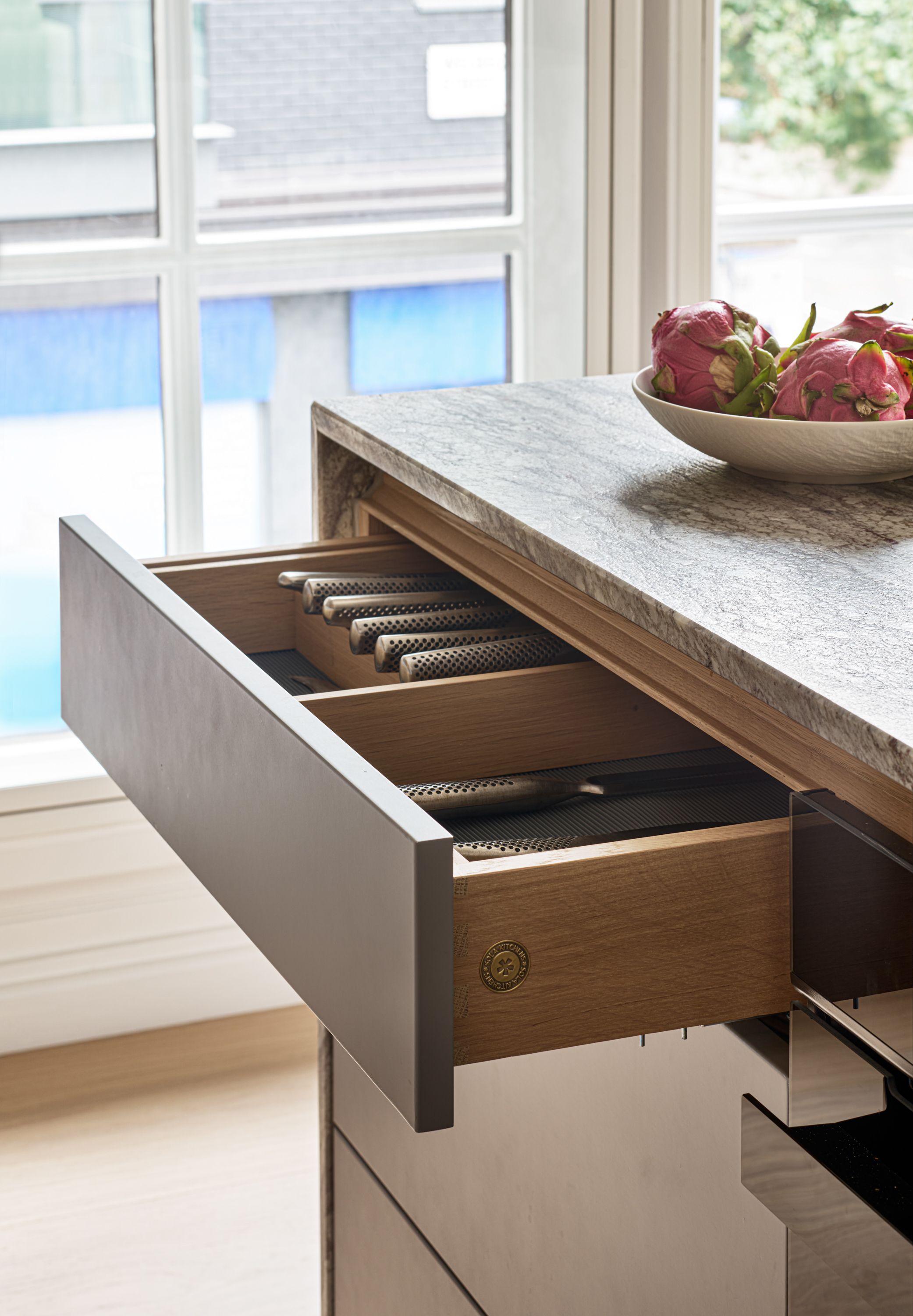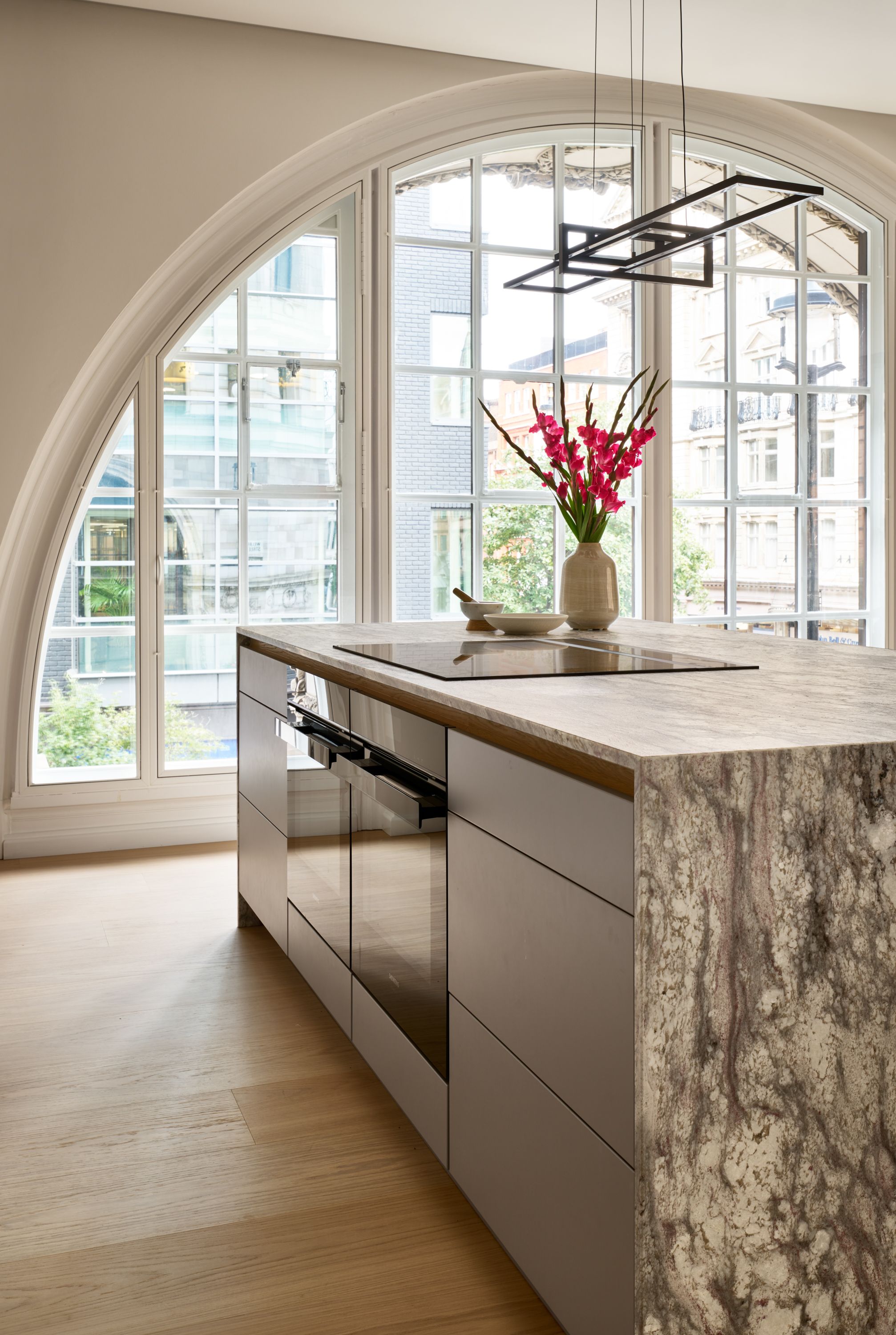 The designer's solution uses a flat-fronted design in mdf and spray-painted grey with Skog cabinetry in white-pigmented oak, to add warmth and texture, and a magnificent stone waterfall island. The designer took the size of the fridge as her starting point and designed the pantry to match it, with the sizes of the rest of the cabinetry and the size and position of the island following on thereafter. As the existing plumbing could not be adjusted, the sink had to be positioned in the wall run, and to satisfy the owner's desire for perfect symmetry, the hob and undercounter side-by-side ovens were positioned directly opposite, in the island.