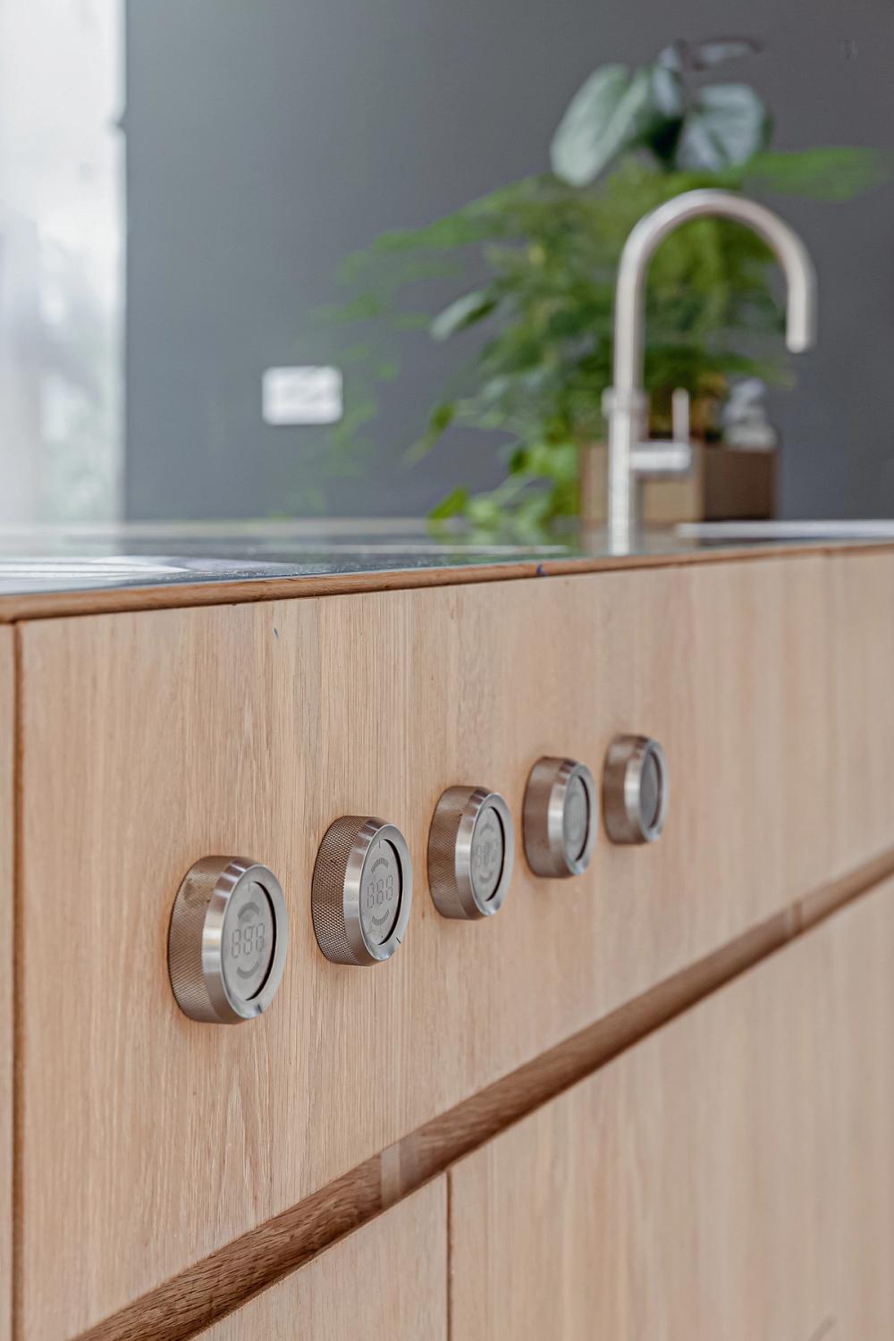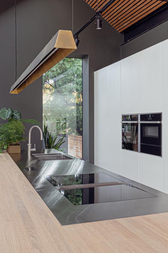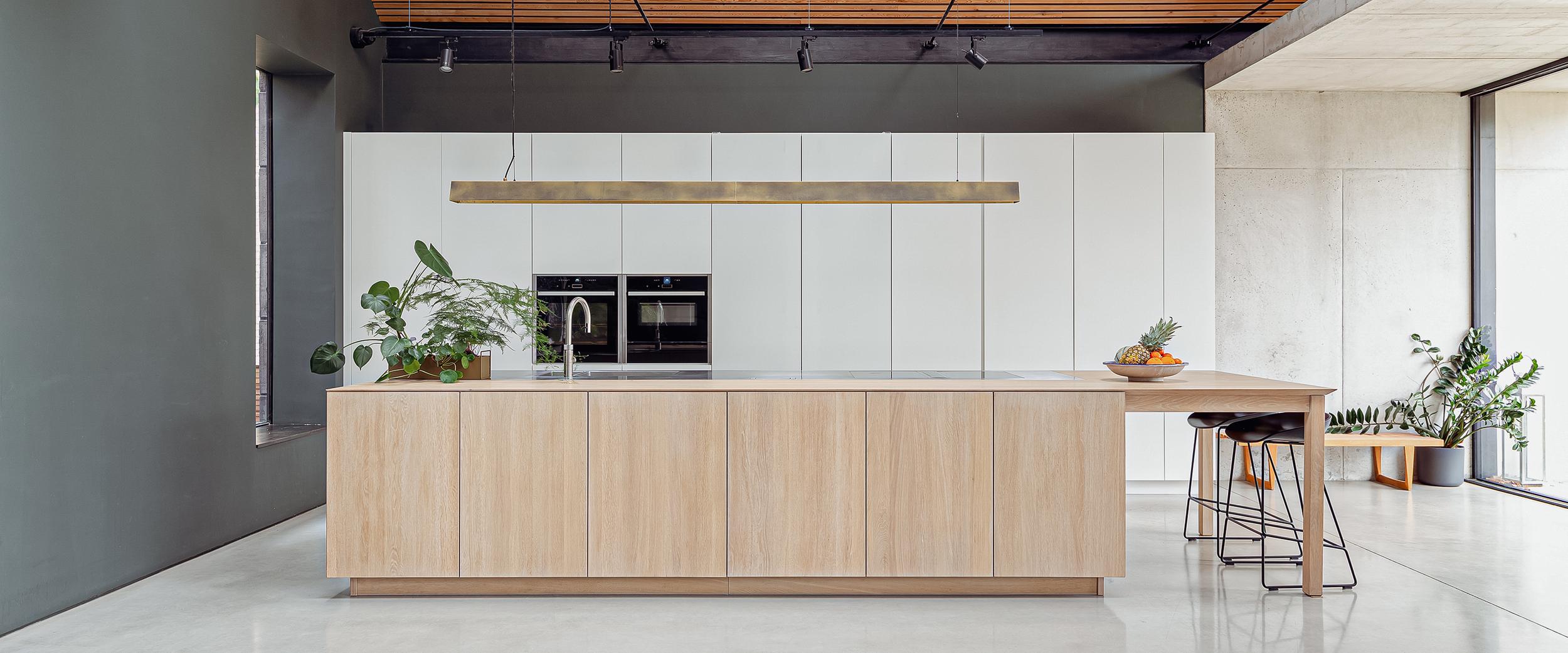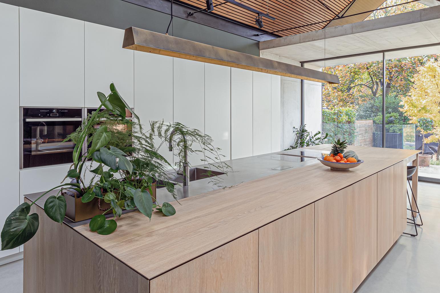 The designer's solution features white-oiled oak flat-fronted cabinetry paired with a matching solid oak worktop to create a statement wooden island. This is offset by a wall of pure-white-painted tall cabinets, achieving a sleek, linear look with tactile warmth to avoid a clinical feel. The island, designed as the kitchen's functional hub without compromising its handsome good looks, with a built-in chef’s-style table, incorporates a sheet of matt stainless steel seamlessly moulded to include a Blanco sink and cut to fit the downdraft Bora hob. Integrated into the prima finished-oak worktop, the insert remains nearly invisible from the front. The island also houses bins and a dishwasher, while the Neff ovens, fridge-freezer, and pantry are enclosed in the tall wall cabinets.