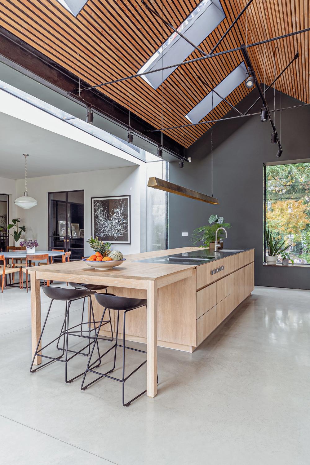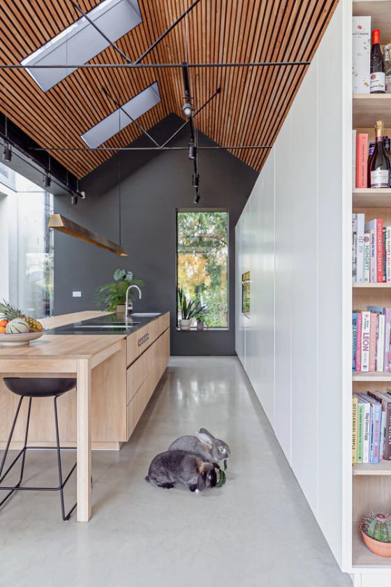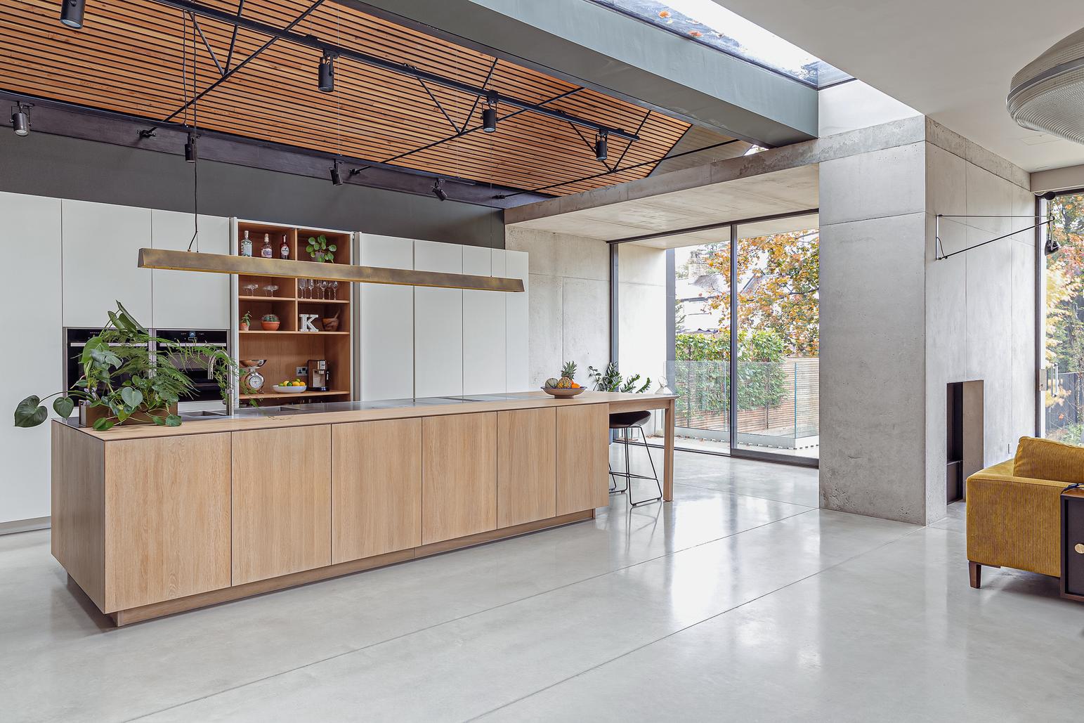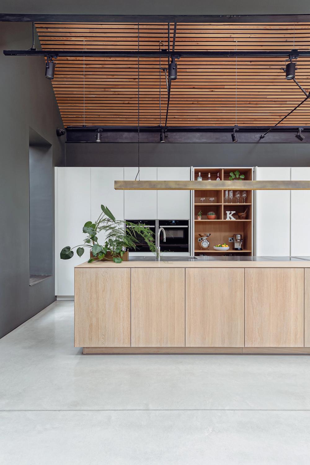 The clients envisioned their large open-plan space, which is separated from the main house by nearly ceiling-height glazed doors, to feature ultra-clean lines and a sleek look, ideal for large-scale cooking and entertaining. Inspired by a Sola Kitchens design with a large island, where the doors and drawers were mitre-cut to the worktop and at all four corners to create a wooden box effect, they requested something similar. They wanted a palette of pale woods and white to contrast with dark grey walls and dark-stained slatted timbers that line the ceiling, complemented by stainless steel detailing. Additionally, they desired a handy bookshelf for their cookery book collection.