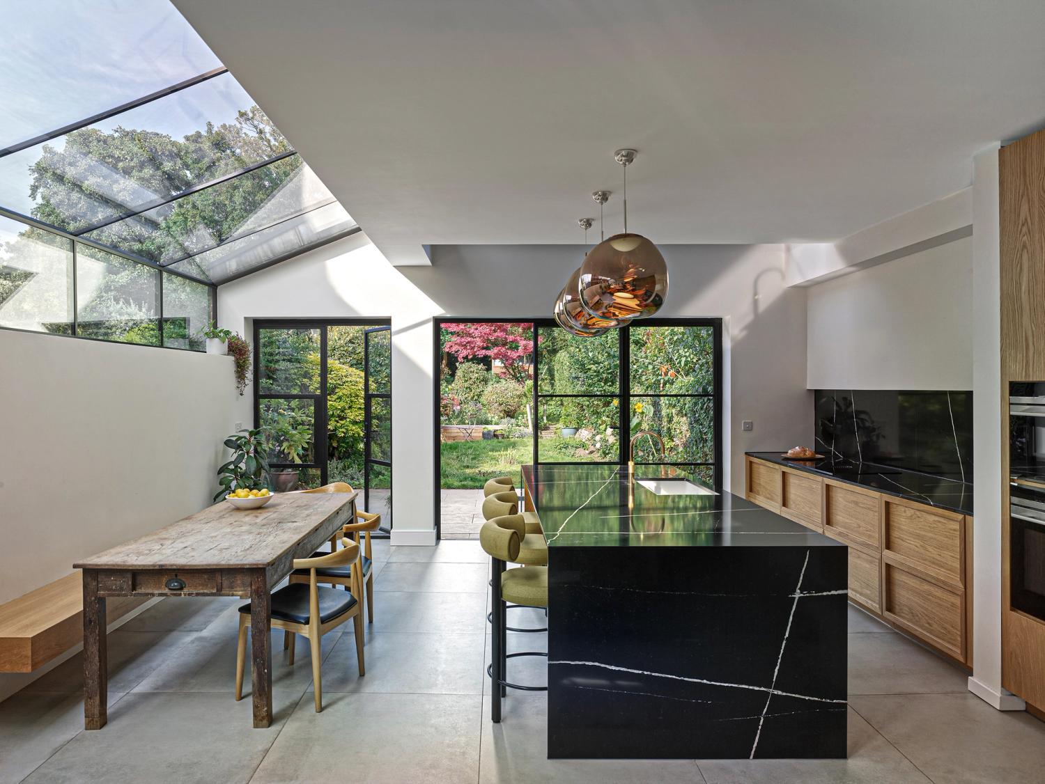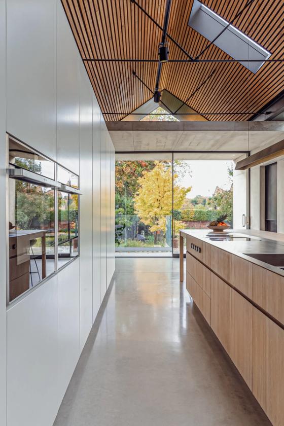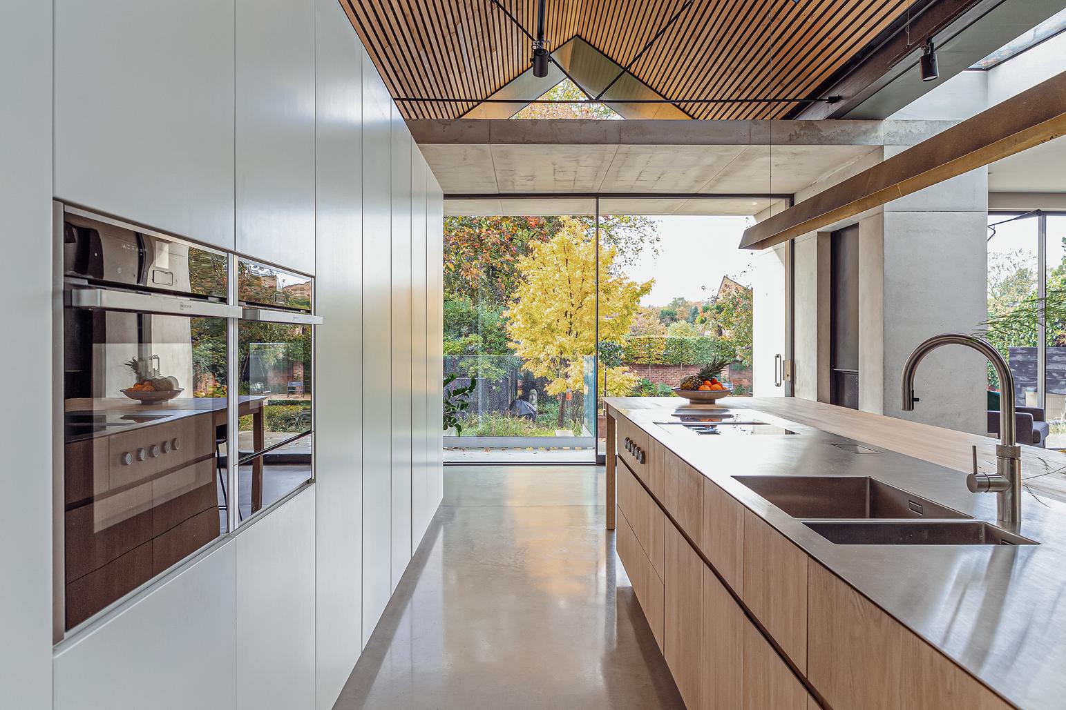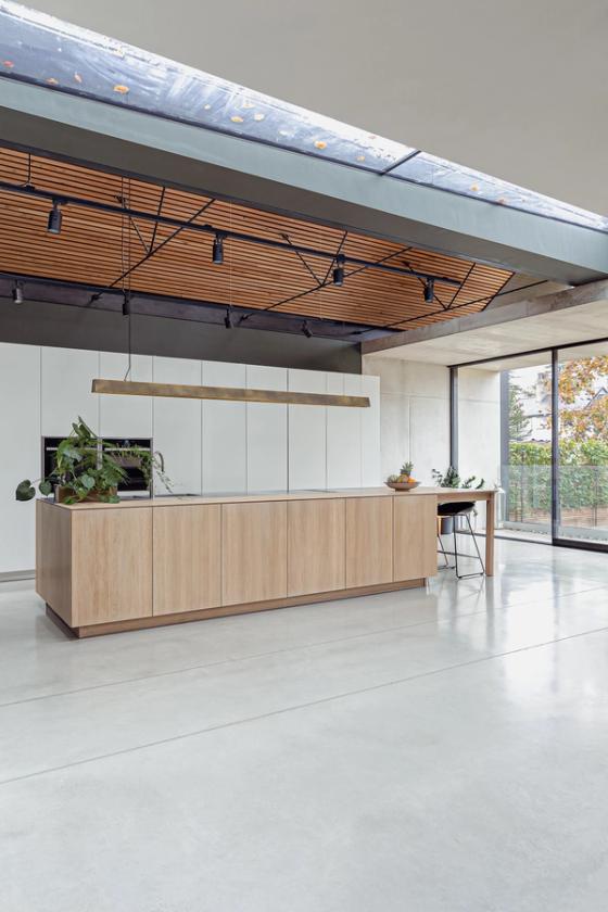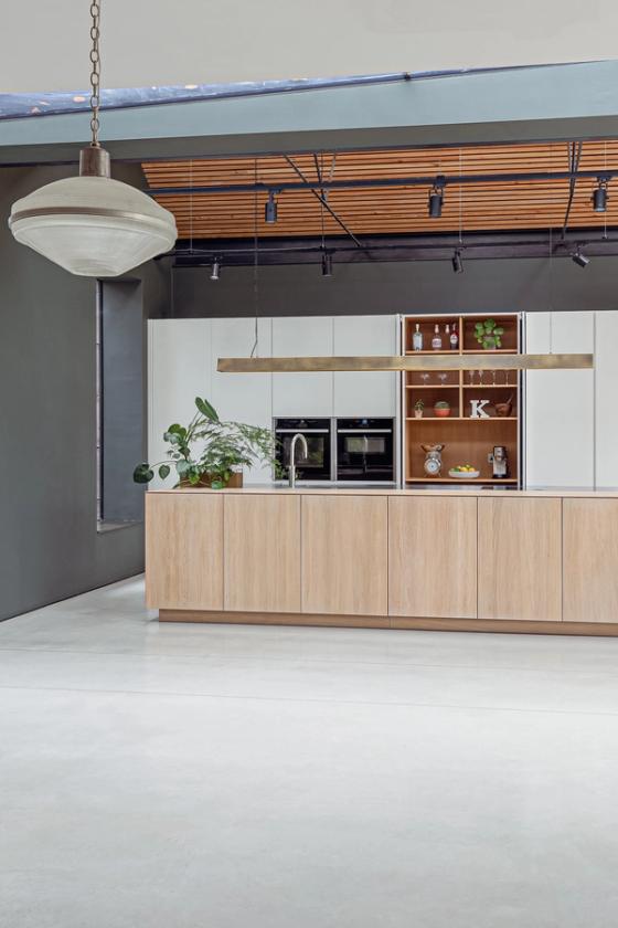 The clients envisioned their large open-plan space, which is separated from the main house by nearly ceiling-height glazed doors, to feature ultra-clean lines and a sleek look, ideal for large-scale cooking and entertaining. Inspired by a Sola Kitchens design with a large island, where the doors and drawers were mitre-cut to the worktop and at all four corners to create a wooden box effect, they requested something similar. They wanted a palette of pale woods and white to contrast with dark grey walls and dark-stained slatted timbers that line the ceiling, complemented by stainless steel detailing. Additionally, they desired a handy bookshelf for their cookery book collection.