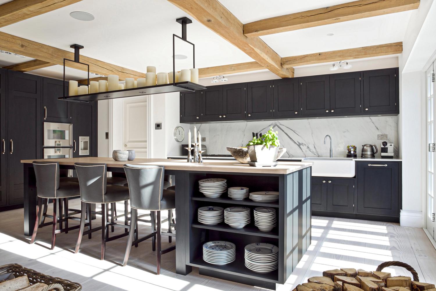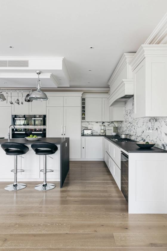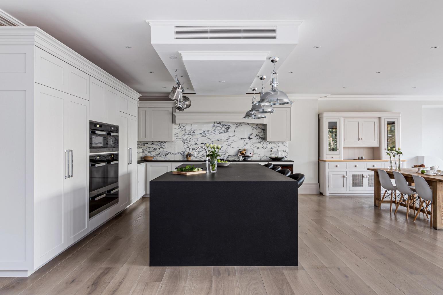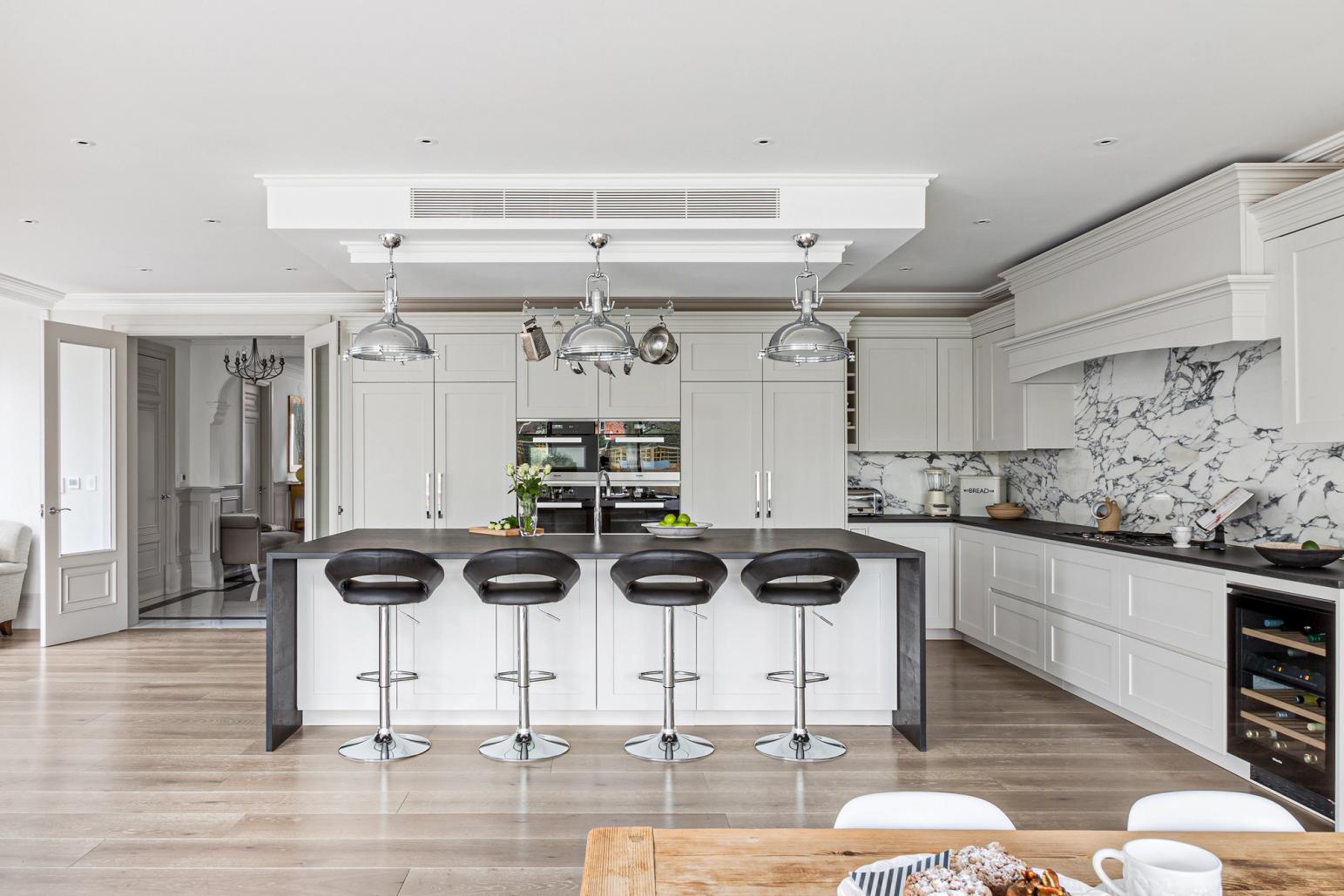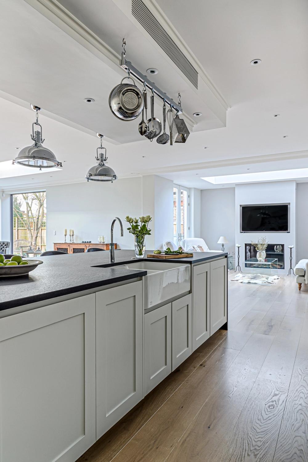 The client wanted her kitchen to have the same layout as in the one that Sola Kitchen had created for the adjoining house, but with classically styled cabinetry rather than the modern look that appears next door, and with a clear sense of symmetry. She also wanted a grand hood to hide the extraction system, a waterfall island, and a hanging rail for her favourite cooking paraphernalia.