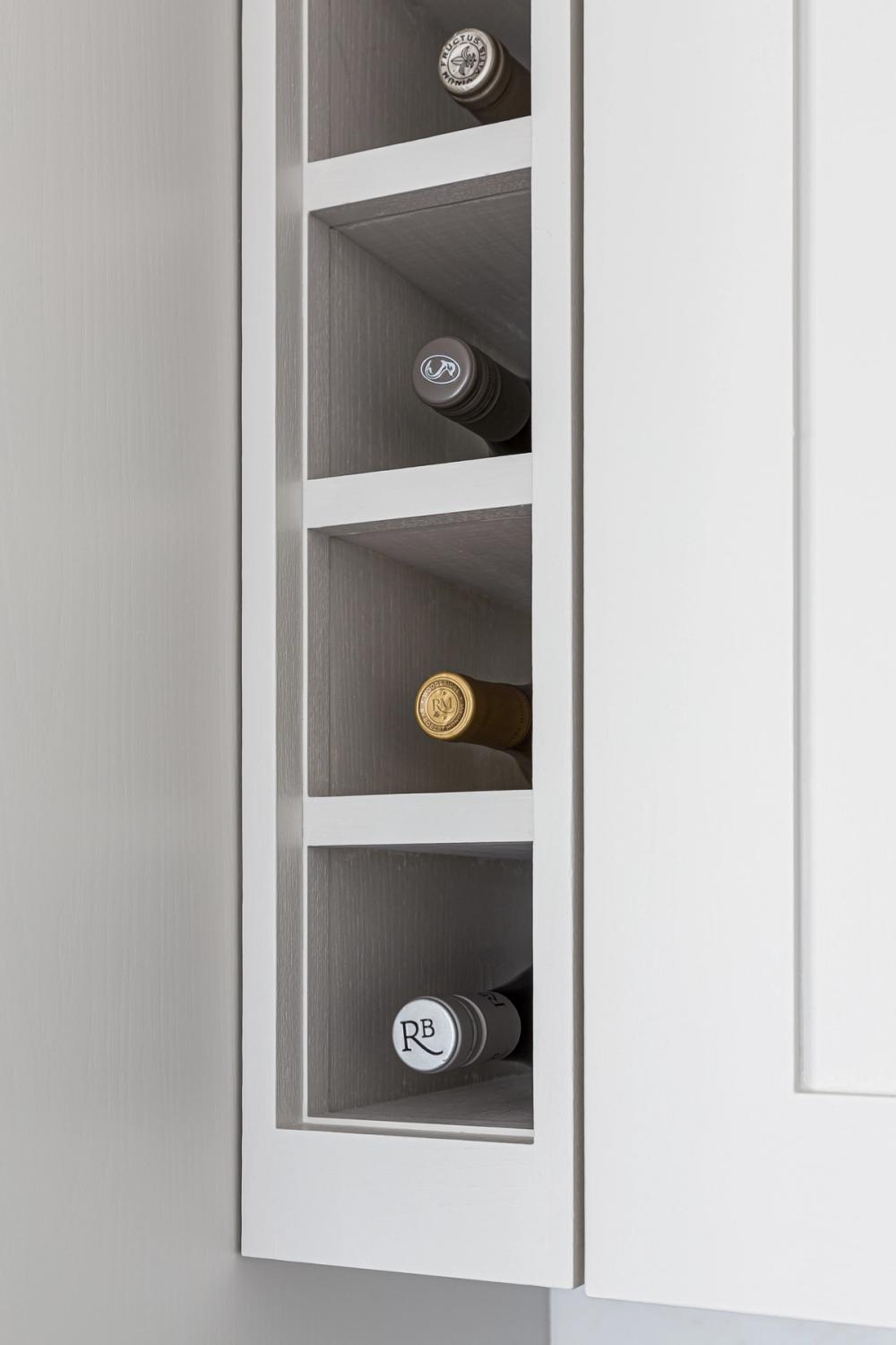 Finishing touches: so that the front edges of the built-in wine rack and the tray rack that is built into the base cabinetry directly below lie flush with all the door fronts, a second frame has been laid over the front of each of the bespoke features.