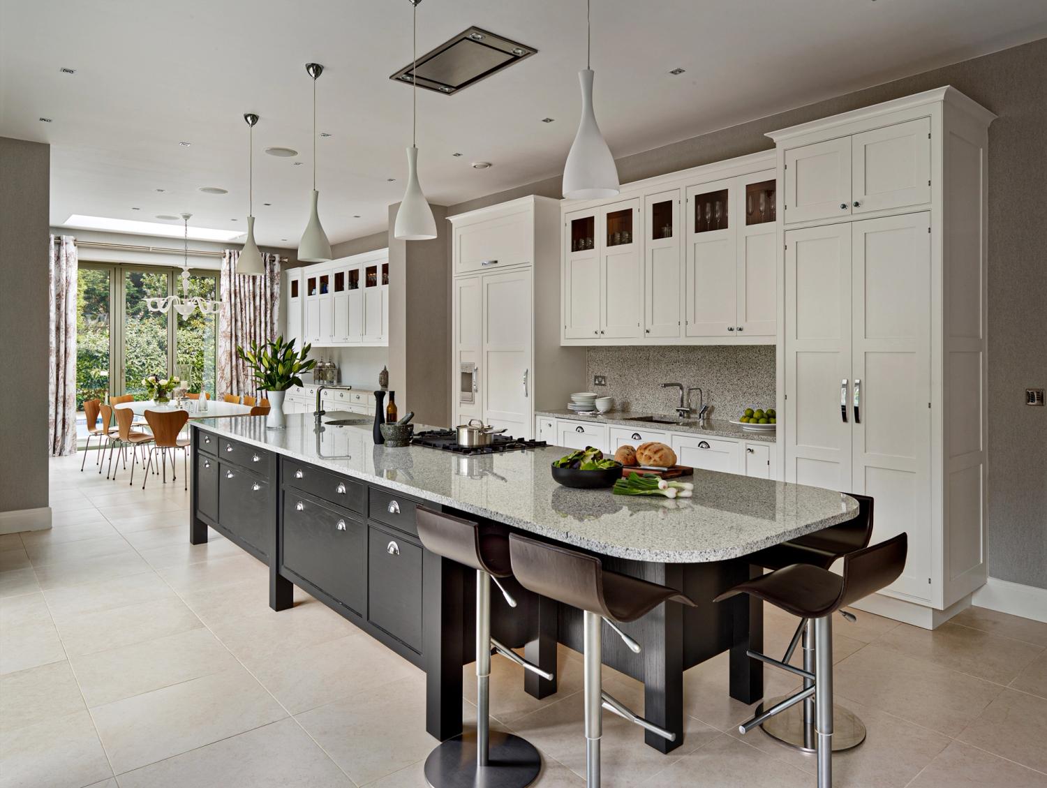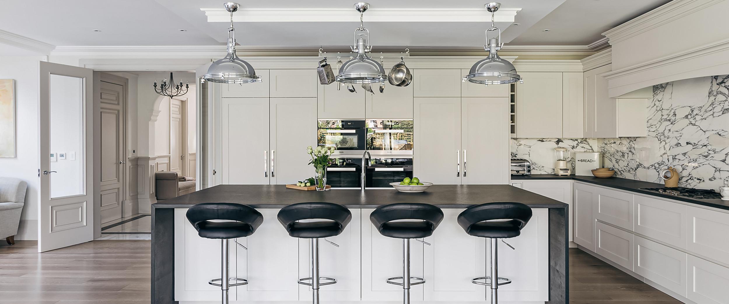 The designer's solution uses Sola Kitchen's Shaker-style cabinetry but with lay-on doors (also known as outframe doors) instead of in-frame ones, all painted white and all handleless, bar those of the fridge-freezer and the double-doored breakfast pantry, both of which are arranged perfectly symmetrically around the block of ovens behind the island. At right angles to this, the grandly sculptural cooker hood takes its cue from the double-depth cornicing of the cabinets, while the ornately veined splashback plays nicely with the flamed Nero Assoluto waterfall island.