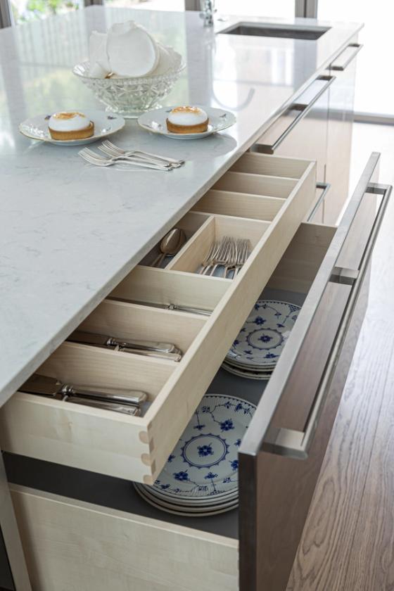 Finishing touches: the large expanse of stone splashback runs all the way to the top of the tallest cabinets, providing maximum easy-to-clean wall protection and highlighting the stainless steel appliances and clean, graphic lines of the kitchen design.