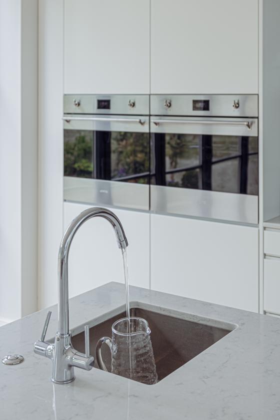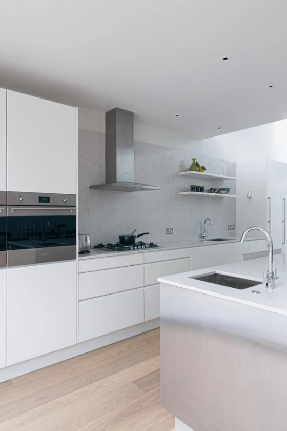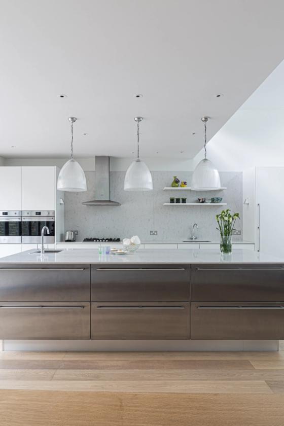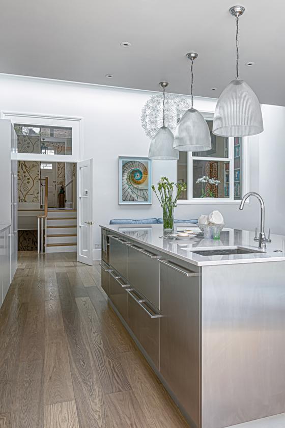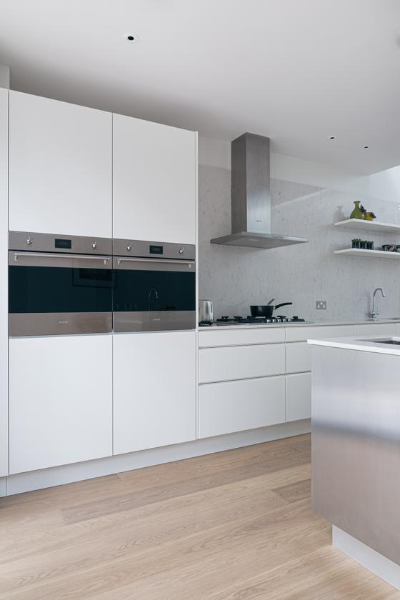 The designer's solution makes a bold statement with an oversized, stainless steel-clad island that contrasts powerfully against the simple white, flat-front cabinetry along the back wall. The island features spacious drawers with bespoke organizers for cutlery and utensils, while long steel bar handles on both sides of the 1.2-meter-wide, Silestone-topped centerpiece lend it a sleek, semi-professional look. To frame the workstation and accentuate the impressive height of the white-painted room, a pair of tall, double-fronted cupboards were incorporated—not only to house the fridge-freezer at one end and a pair of Siemens ovens at the other but also to serve as bookends that highlight the stainless steel Bertazzoni hob with its matching extractor unit and the chrome tap of the main sink. The cleverly positioned right-hand cupboard, set just beyond the line of the hidden steel beam, seamlessly blends the kitchen into the living space, enhancing the overall flow of the room.